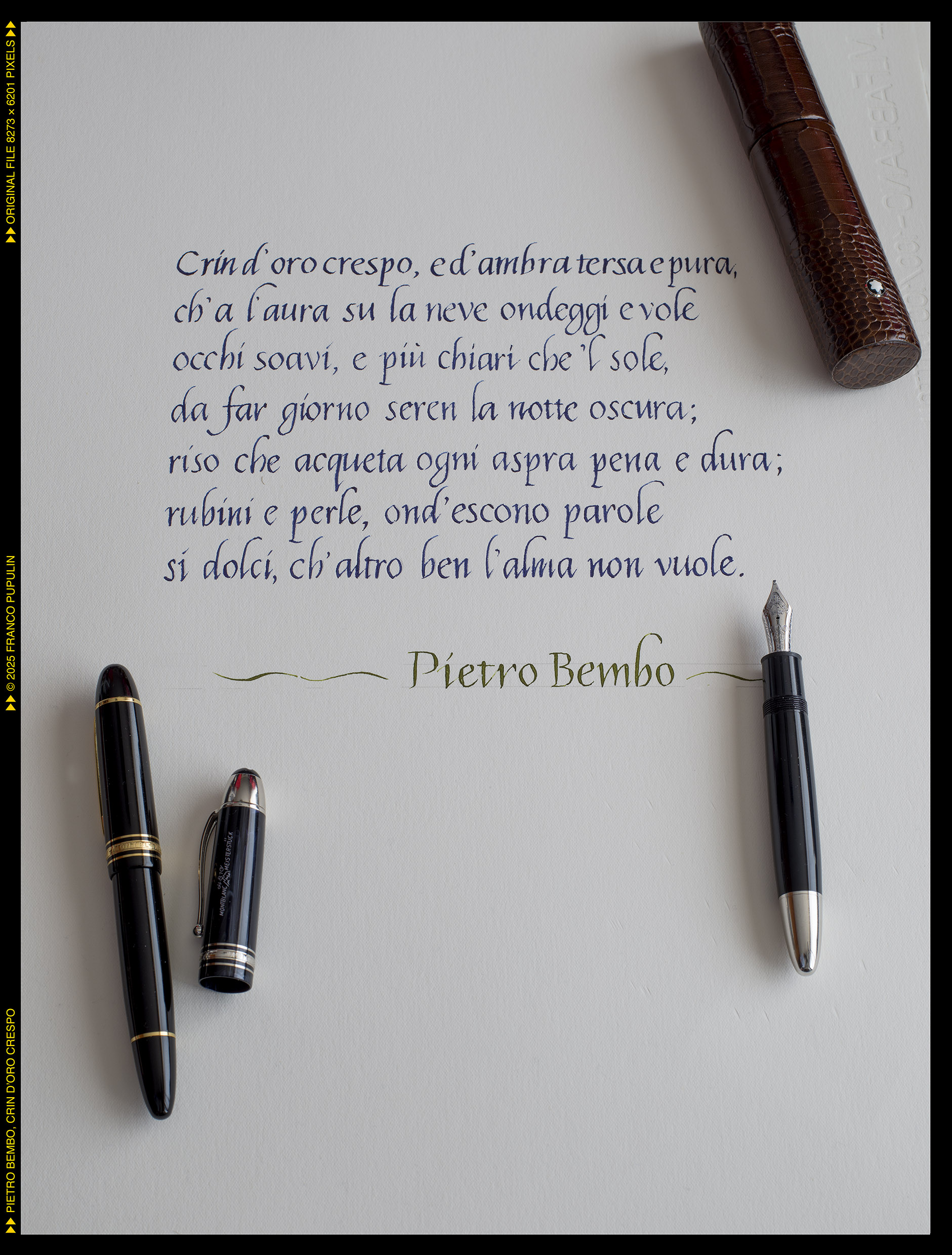 Io ho preso da Pietro Bembo. Più tardi, con un'altra grafia e in un altro colore, scriverò la dedica e la data.