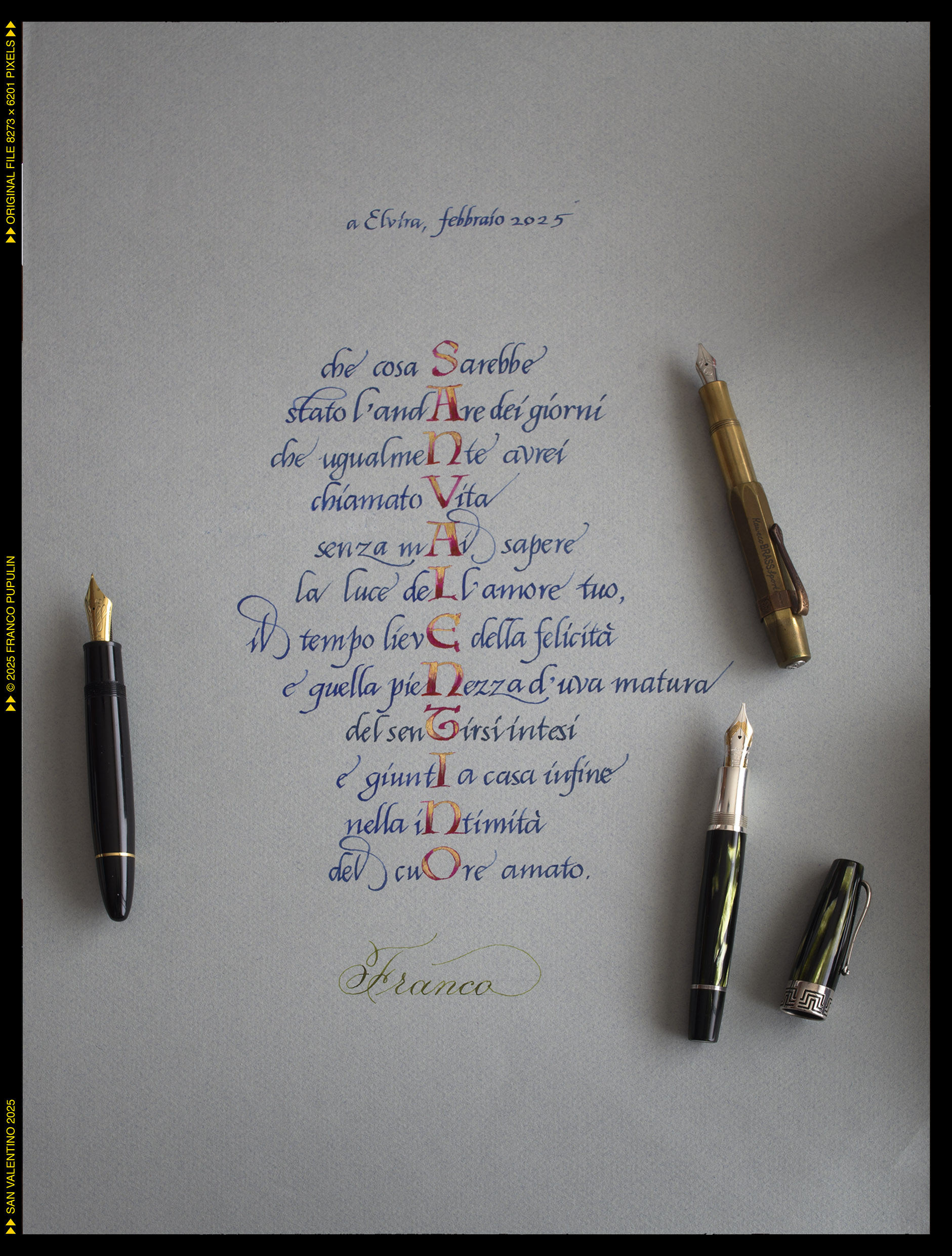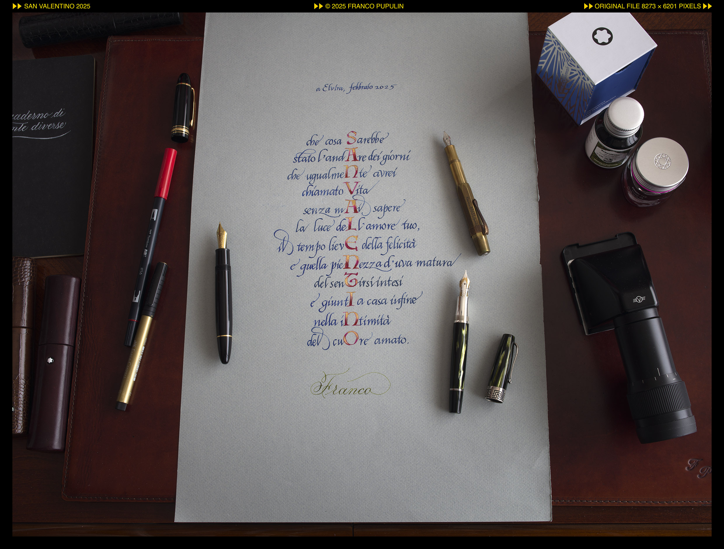 Provate con un foglio grande, scritto da voi, con le vostre mani e le vostre penne, con molto spazio vuoto su quale appoggiare il vostro regalino di San Valentino. Sono certo che il vostro foglio sarà apprezzato quanto o più del regalo.