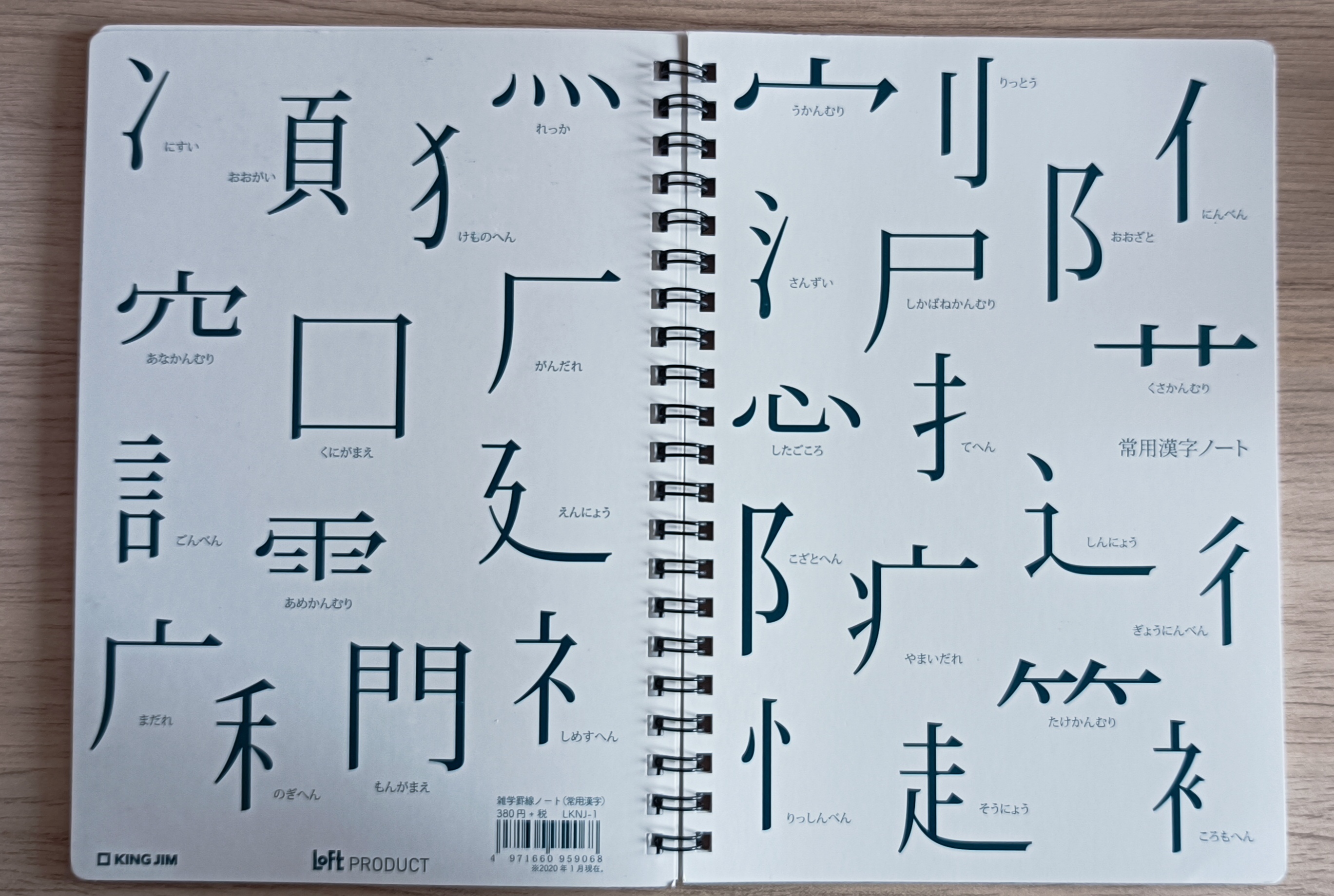 In Giappone ho comprato un quaderno firmato A5 che presenta i principali radicali e che nelle pagine ha delle righe costituite dai cosiddetti "caratteri di uso comune" (jōyō kanji), cioè quei caratteri (circa 2500 o giù di lì) che il ministero dell'istruzione giapponese inserisce nella lista di caratteri insegnati nelle scuole.