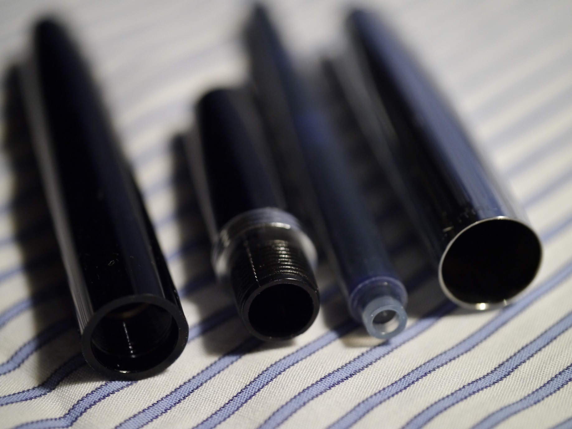 ), non è certamente rotto, e sia la cartuccia che il converter Aurora vi si agganciano perfettamente. Quella parte centrale più chiara che si intravede è la parte terminale del converter in ebanite con la sua fessura dell'inchiostro. Non c'è modo di fotografarlo diversamente perché c'è il bordo della filettatura (esterna) che lo circonda (alto circa un centimetro) per cui non si trova una inclinazione diversa per inquadrarlo...