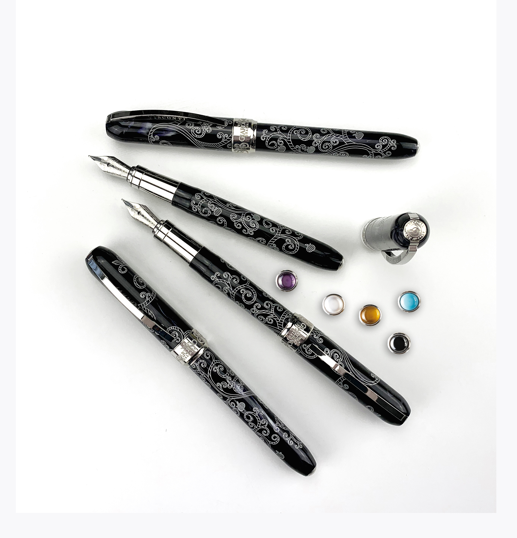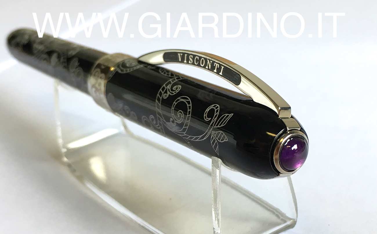 Alla sommità del cappuccio, il dischetto Visconti magnetico è removibile e sostituibile con una pietra dura o con le iniziali (col sistema MyPenSystem di Visconti)
