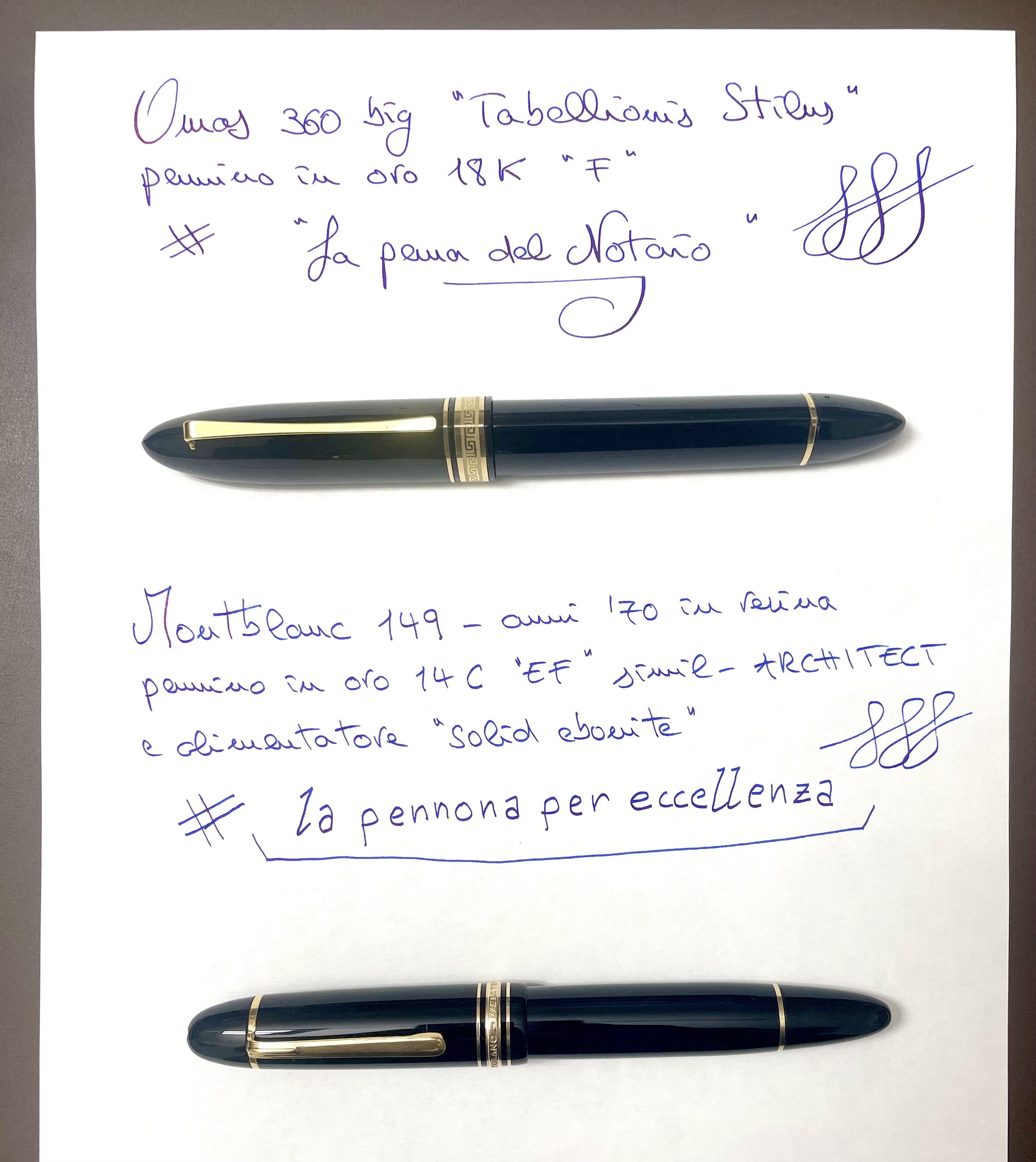 Per le lunghe sessioni di scrittura preferisco sicuramente la OMAS: il peso maggiore e la sezione eccessiva della 149 diventano affaticanti quando si supera qualche facciata; ma su testi di poche righe non sono penalizzanti. Quindi funziona bene nel suo ruolo di penna di rappresentanza, da tirar fuori per farla ammirare a un cliente mentre gli scrivi un appunto.