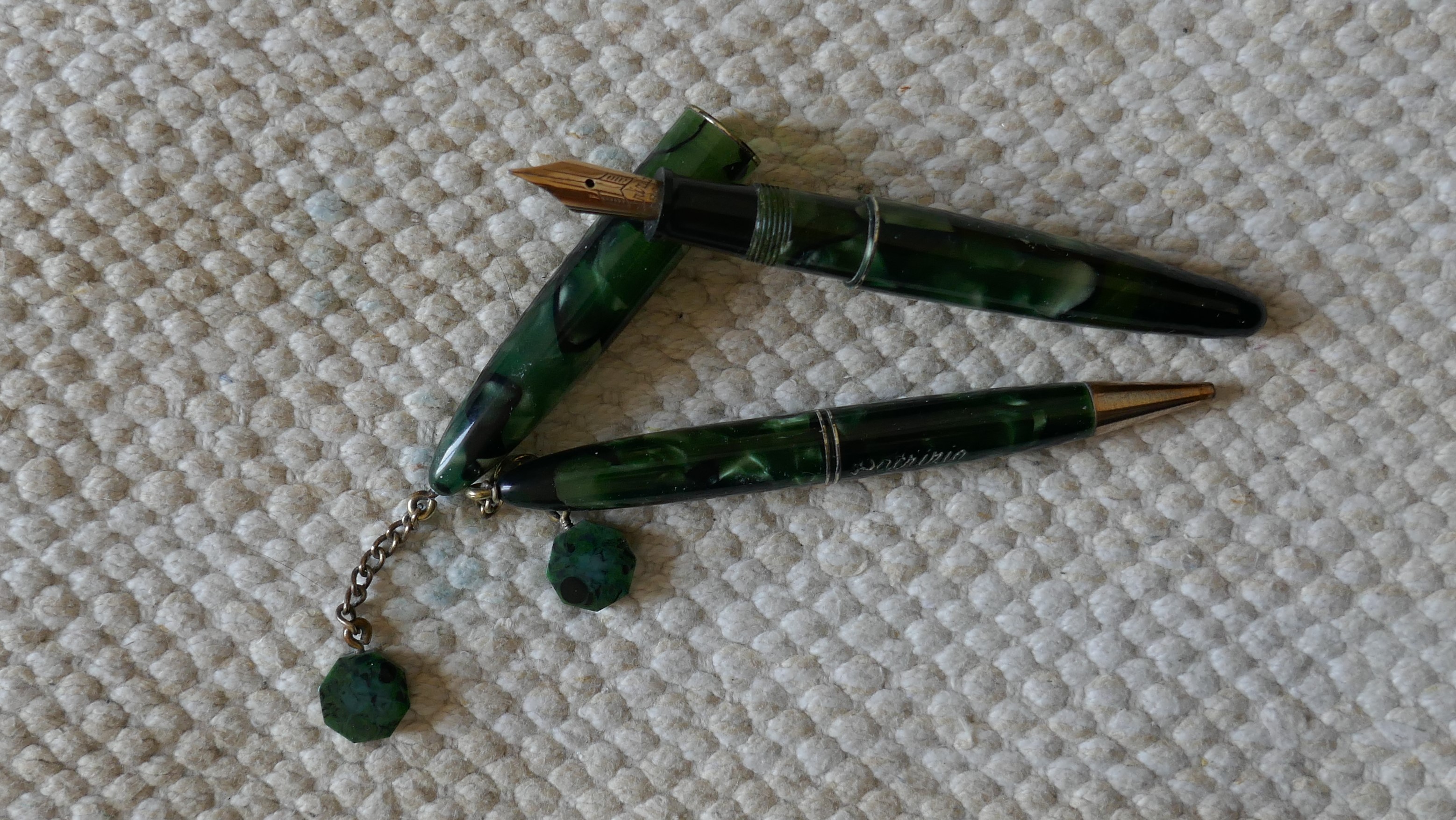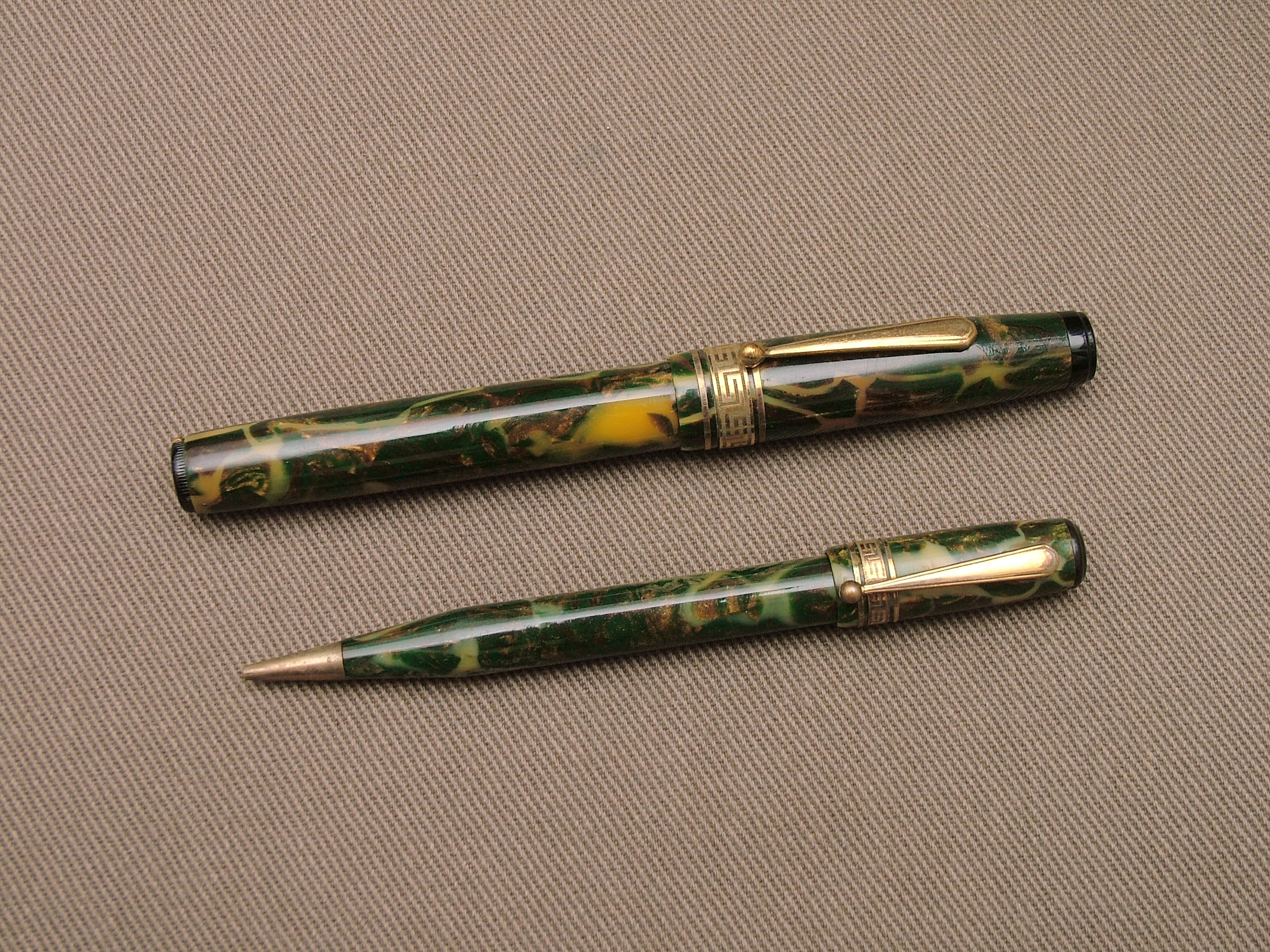 quest'ultima non conosco la marca, sul fermaglio della stilo la scritta MARINE, su quella della matita A.N.C. - PEERLESS, a vista non mi sembra celluloide