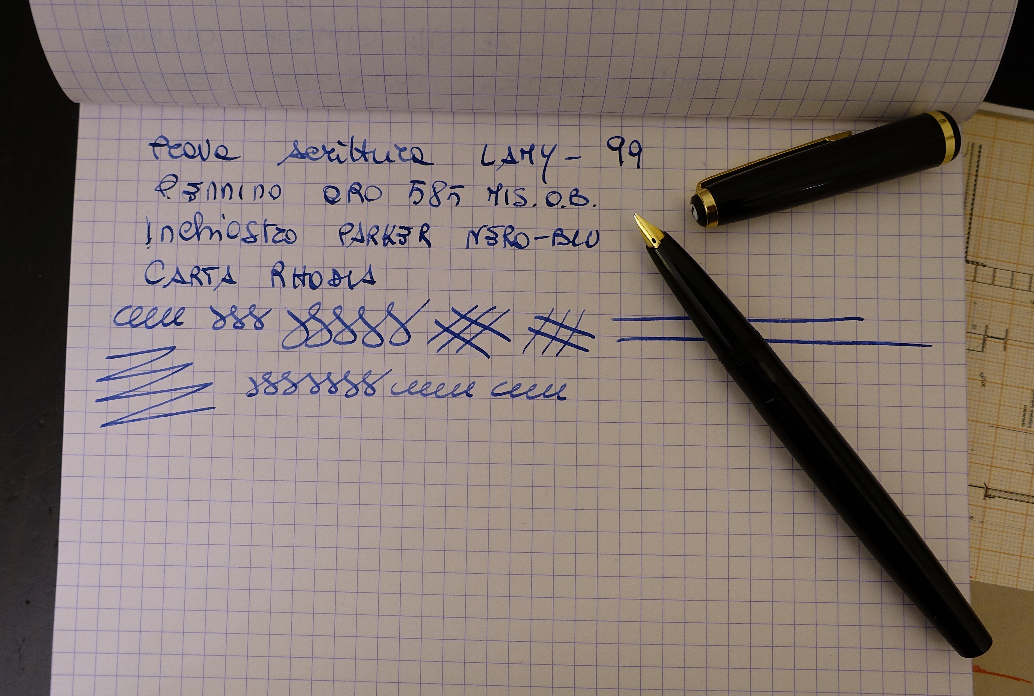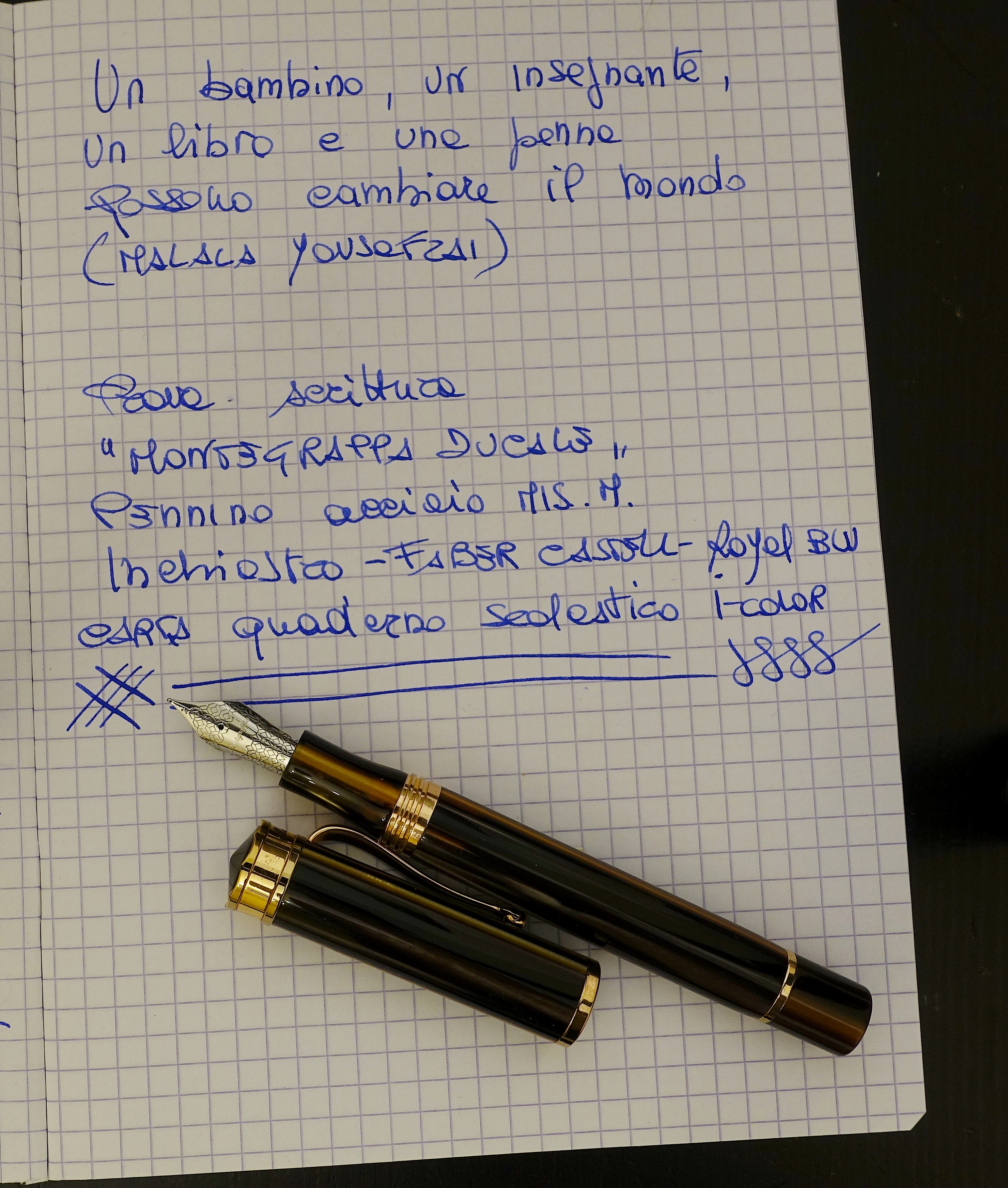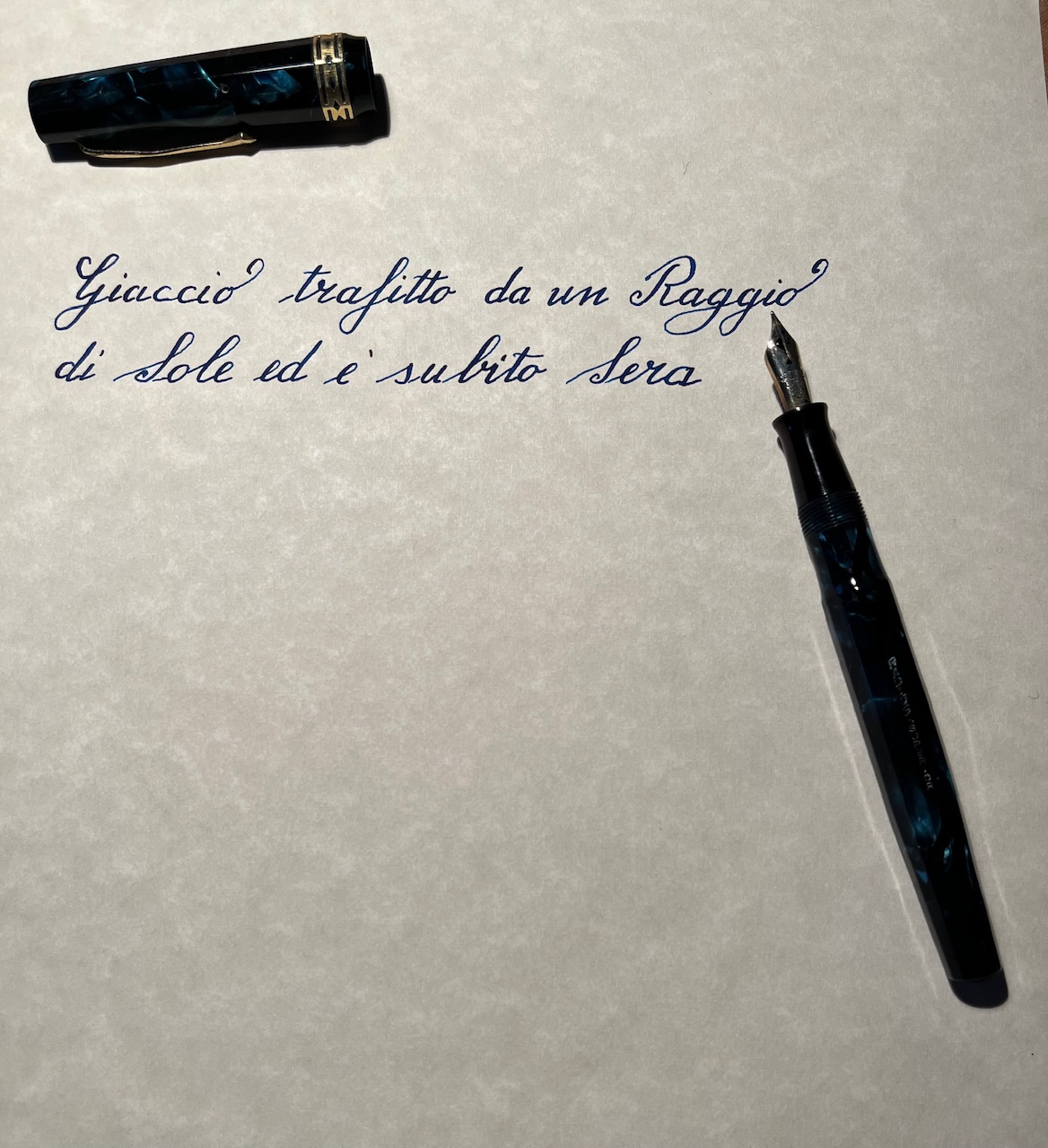 Le penne sono due misteriose Stilnova in celluloide, marchiate "la Perla Lusso" appena rimediate, sulle quali non trovo nessuna info, tranne di un tipo che come me ne ha rimediata una da poco e che leggo su reddit: pure lui si chiede da dove diavolo vengono questi oggetti così belli. Pennini in acciaio che più flex non si può. Sono appena rodate, quindi i binari ci stanno, per adesso. Le parole che scrivo, ben più importanti delle stilo, delle carte e degli inchiostri miei, sono di F. De Andre', tratte dal brano "un Chimico".