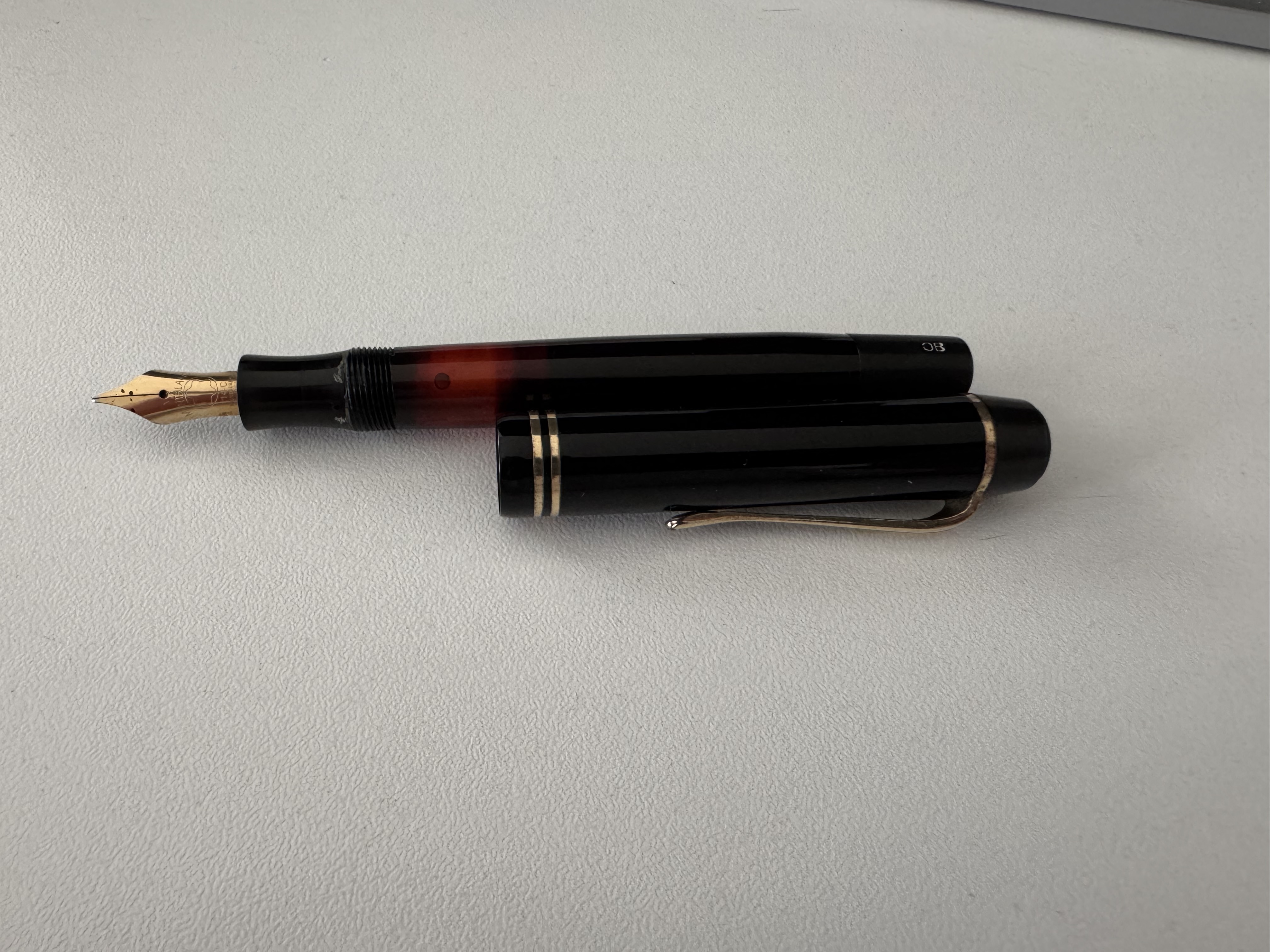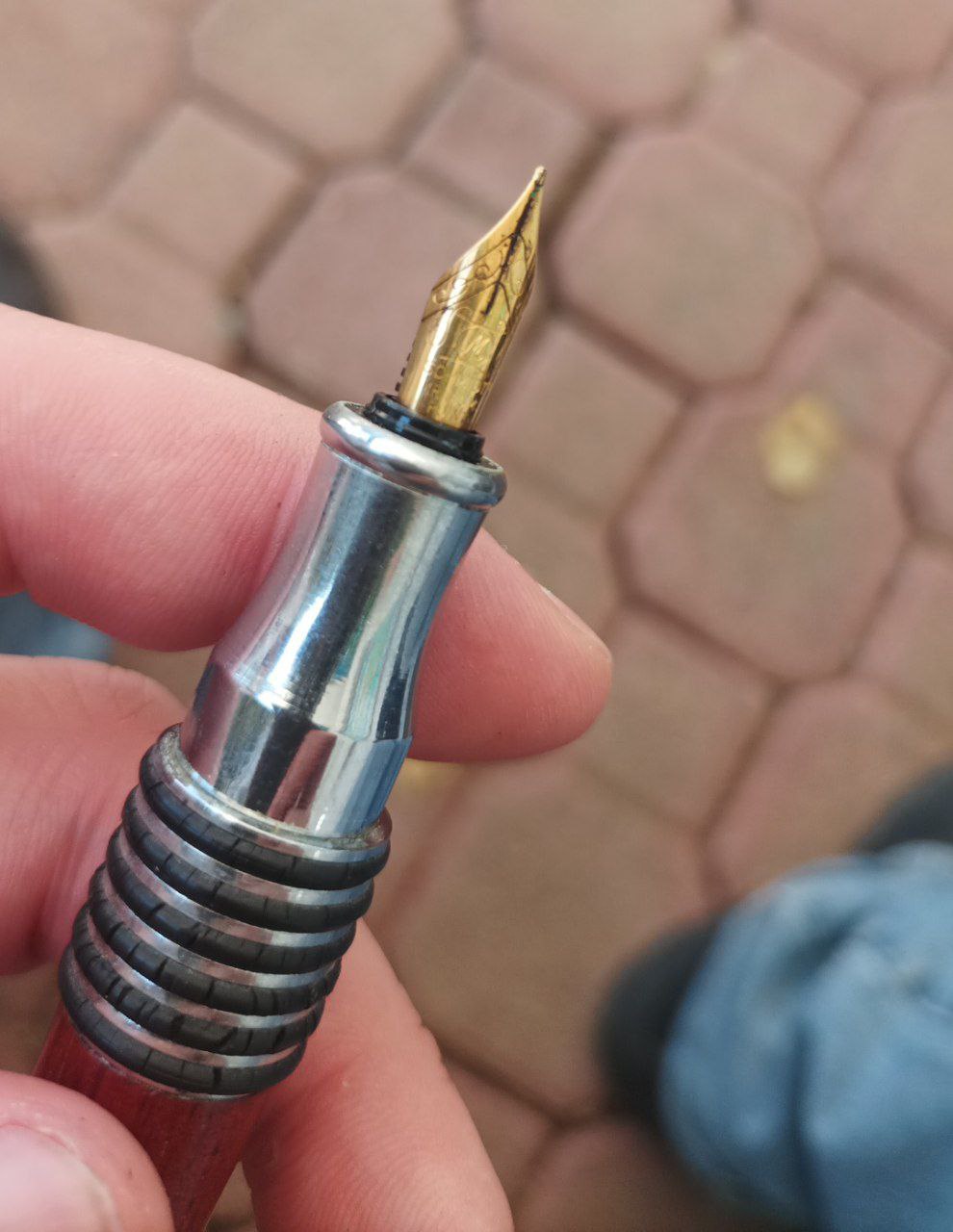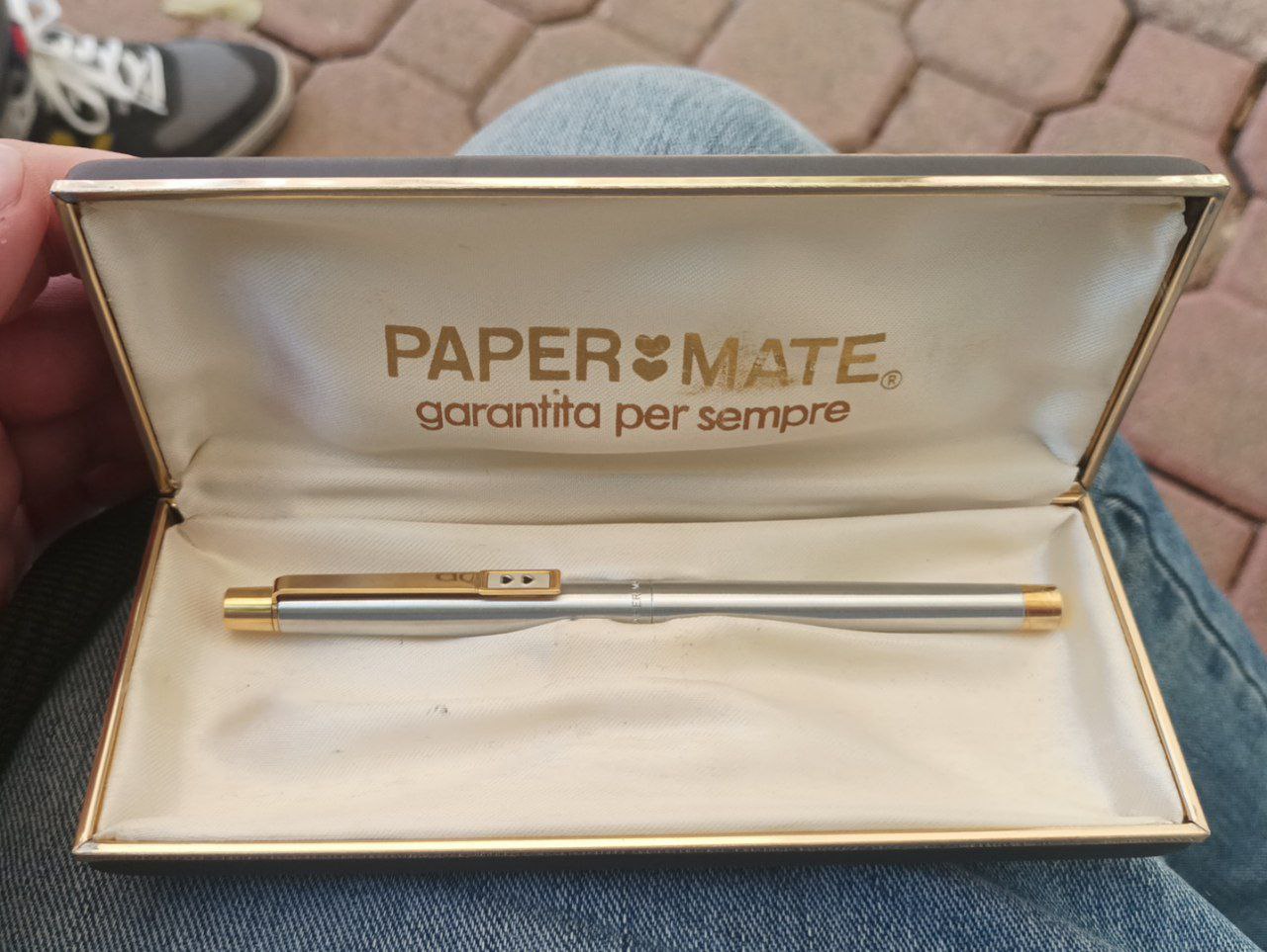 Ieri giravo per il mercatino di Latina e, visto che con le due Aurora 88P e la Aristokrat 20 mi era andata bene, ci ho riprovato; tra la marea di penne più o meno malmesse buttate in cestini, scatole e insalatiere, alla fine ho deciso di acquistare questa Papermate "Executive" (se non ho sbagliato l'identificazione) col suo cofanetto (che immagino dovesse contenere in origine anche la penna a sfera) e una Osama "Montecarlo" (anche qui al netto di errori di identificazione) con pennino Schmidt.