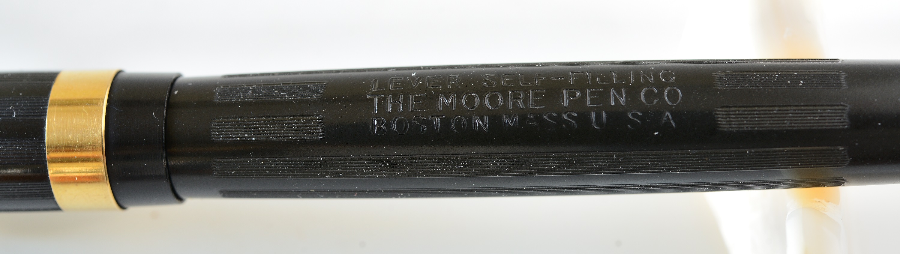 La penna che tu hai adocchiato sembra essere una produzione degli anni ’40 o ’50 e che ben poco potrebbe avere attinenza o una qualche relazione, anche lontana, con la Moore Pen Company, già American Fountain Pen Company.