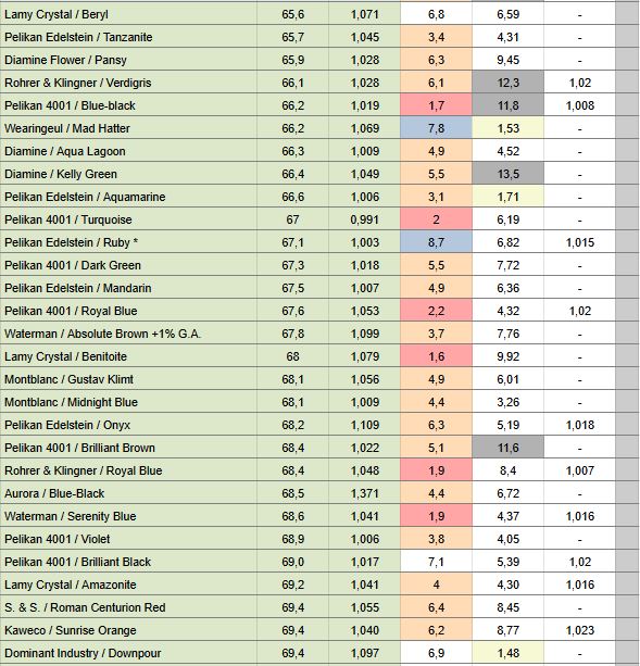 Può darsi che il comportamento del Pelikan blue black sia dovuto in parte alla sua componente ferrogallica, per cui la sua posizione in tabella, se valutata solo in base alla tensione superficiale, sballa abbastanza il giudizio.