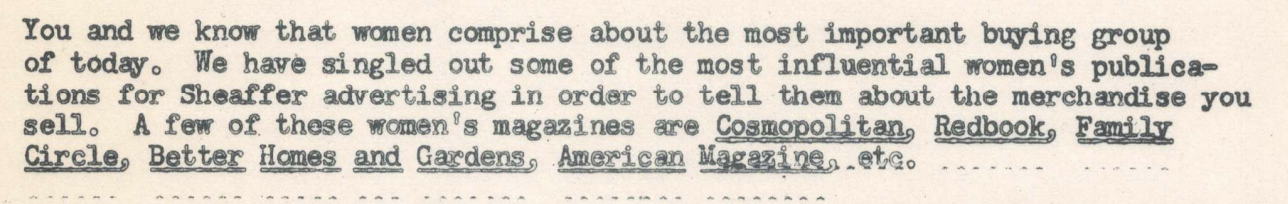 Altri, sono poco classificabili, ma di certo interessanti, ad esempio: Le donne sono il principale acquirente di penne! Non mi stupisce, ma leggerlo in un documento del 1949 è pur sempre interessante...