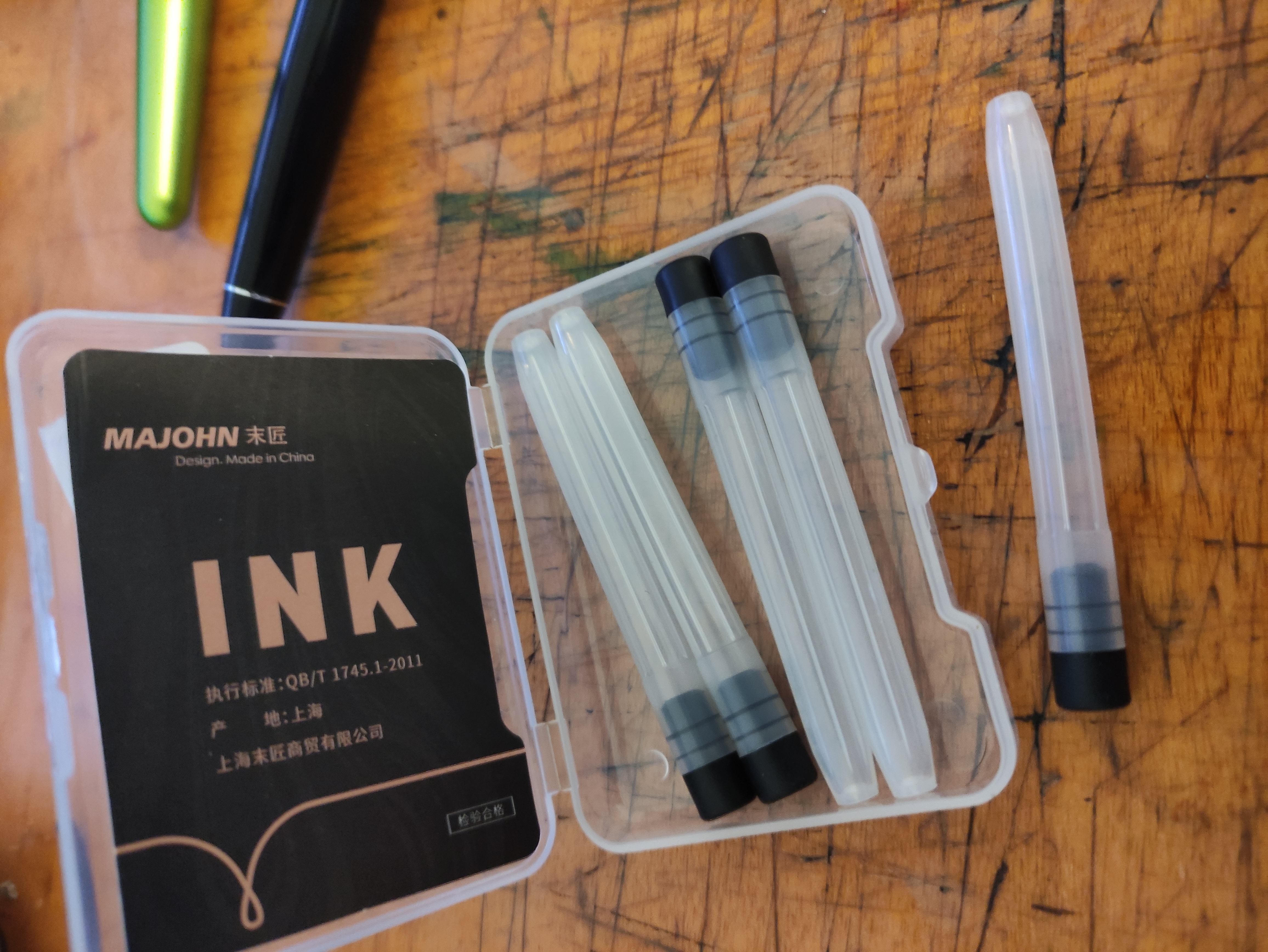 Sapevo in anticipo che i convertitori pilot sono tutti dei cessi e quindi avevo già ordinato delle cartucce majohn ricaricabili siccome ho letto su internet che sono compatibili con le penne pilot. Queste sono le cartucce e in effetti sono compatibili. Le cartucce non hanno bisogno di alcun agitatore e sono abbastanza capienti, si innestano in modo sicuro.