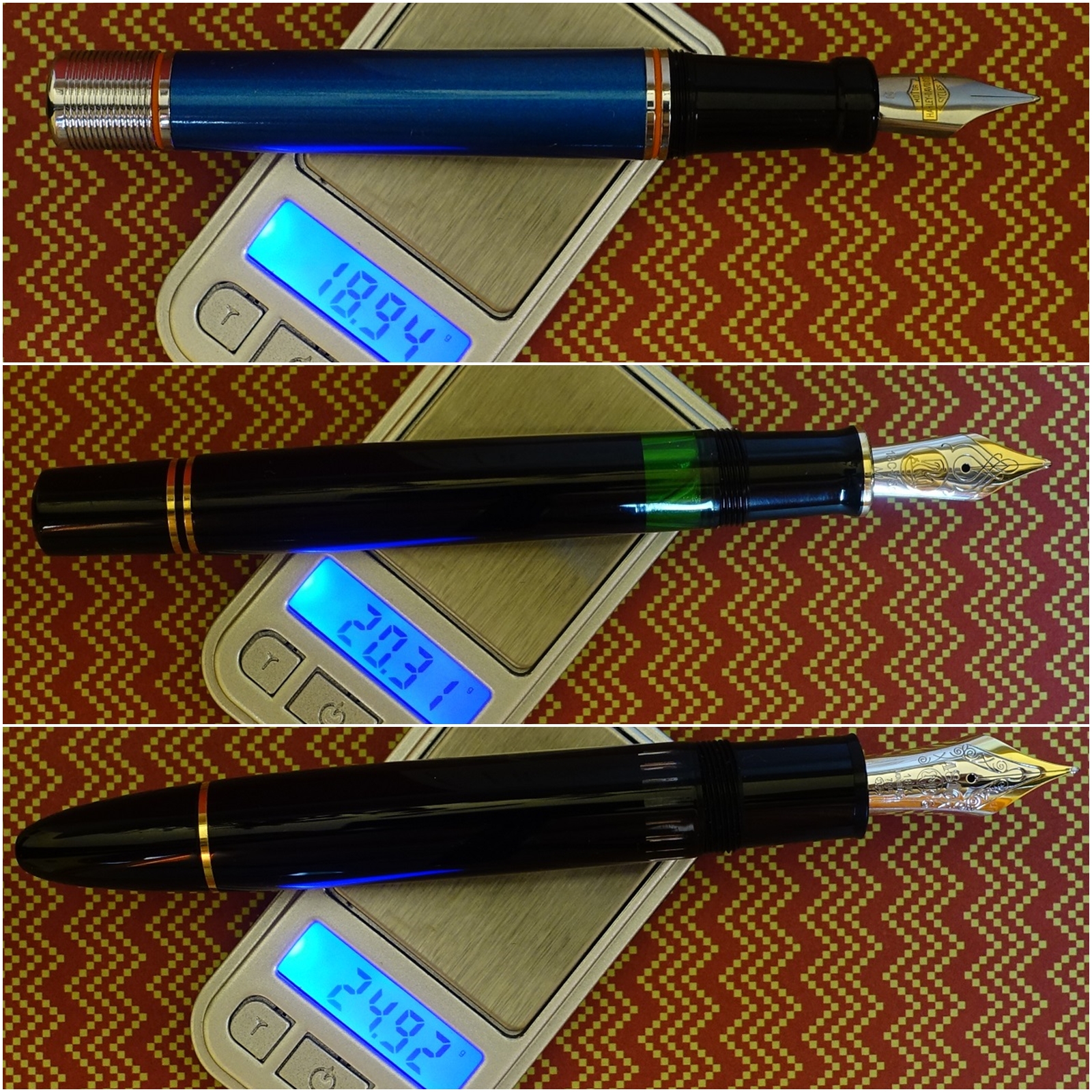 Il peso non è poi così eccessivo, togliendo il cappuccio che pesa 2 grammi meno del corpo, per il resto senza voler paragonare il sacro con il profano, mi pare accettabile, non sto a pesare tutte le penne che ho, ma molte sono uguali o si avvicinano.