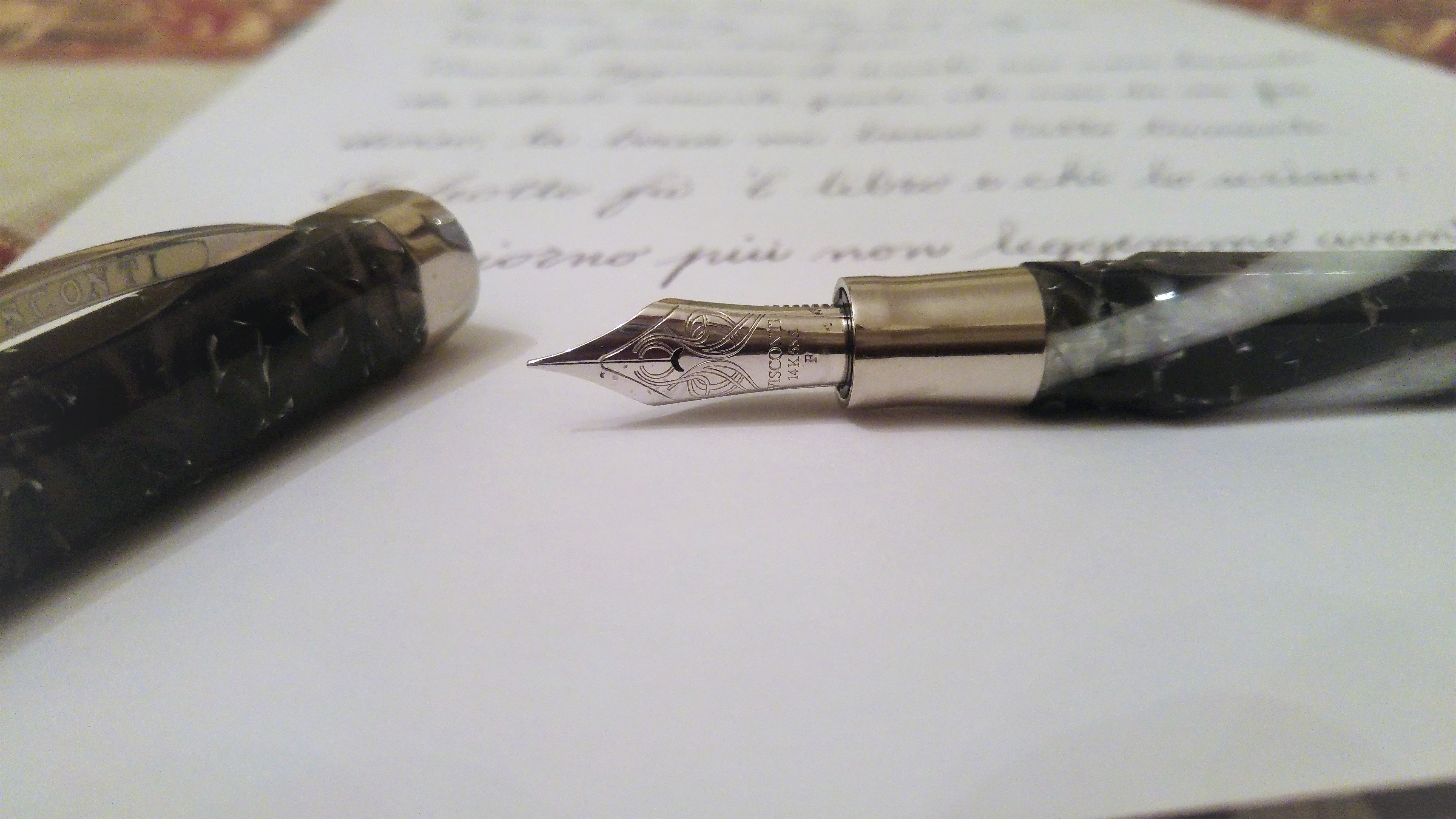 Trovo la penna oltre che bella e solida, il cappuccio usa il sistema a baionetta che consente di mantenere le facce tra cappuccio e fusto sempre allineato, la clip è caricata a molla e sul cappuccio ha il sistema Visconti My Pen su cui ho messo le mie iniziali. Il sistema di caricamento è a cartuccia/converter con montaggio a vite, semplice economico e funzionale. La sezione metallica è a mio parere il solo neo di questa penna, non tanto per una questione estetica quanto funzionale, benché la penna sia molto comoda e ben bilanciata, diventa un po' scomoda in lunghe sessioni di scrittura per chi, come me, ha la tendenza a sudare sempre un po' le mani. Il pennino è un #6 14K di misura F nel mio esemplare; io lo trovo più piacevole del dreamtouch al palladio, è più scorrevole, è bello morbido, permette un po' di variazione del tratto (ma su questo il dreamtouch non è da meno), ha un flusso più controllato ed un tratto più “giusto”, l’F della Opera Elements è più sottile del EF del 23K al Palladio che ho sulla Divina.