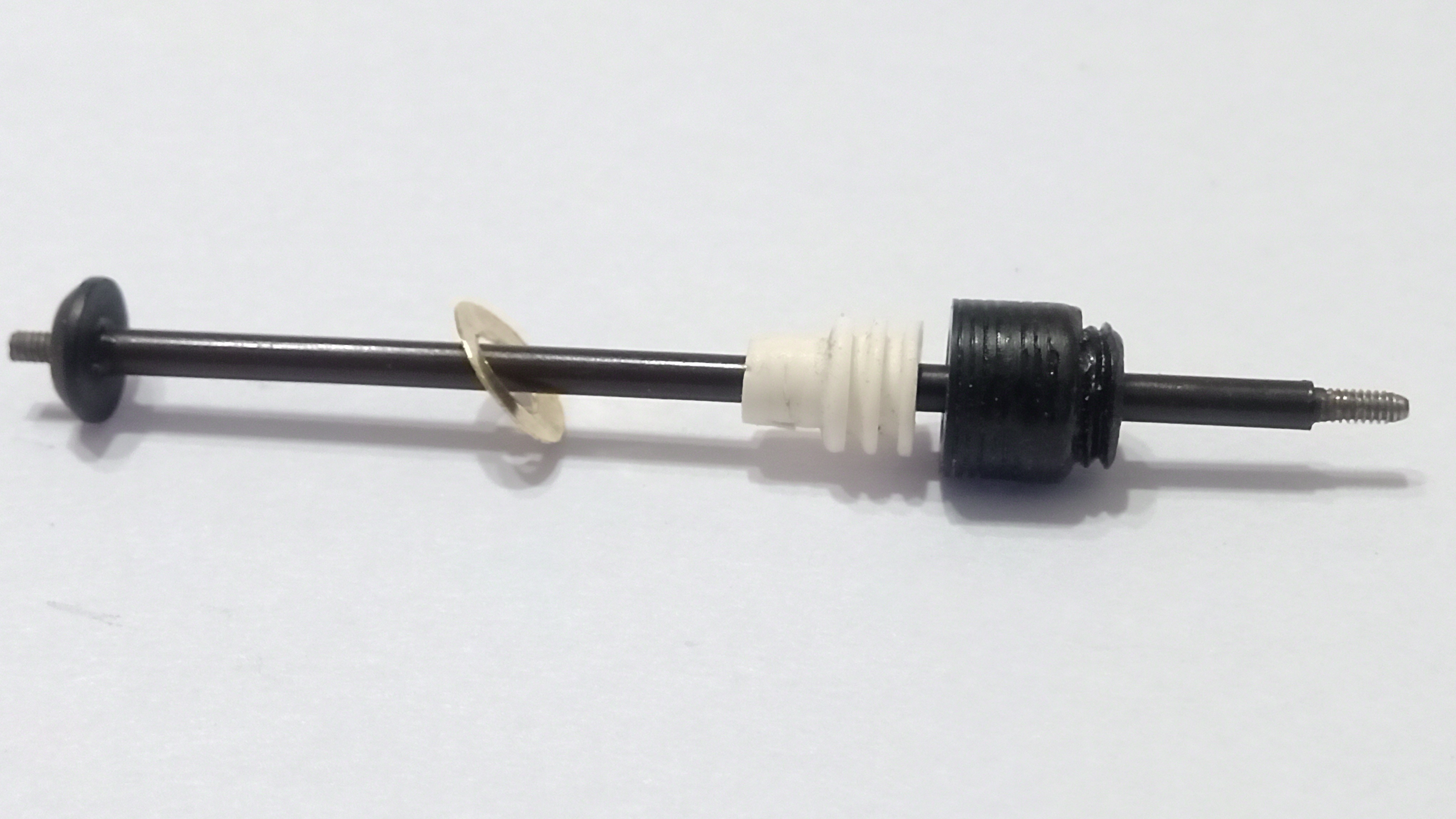 Tenemos ahora que colocar la cápsula con el retén de silicona y la arandela de latón en su posición final, para lo cual usaremos un vástago alternativo, puesto que bajo ningún concepto podemos dañar el recubrimiento de celuloide del vástago original.