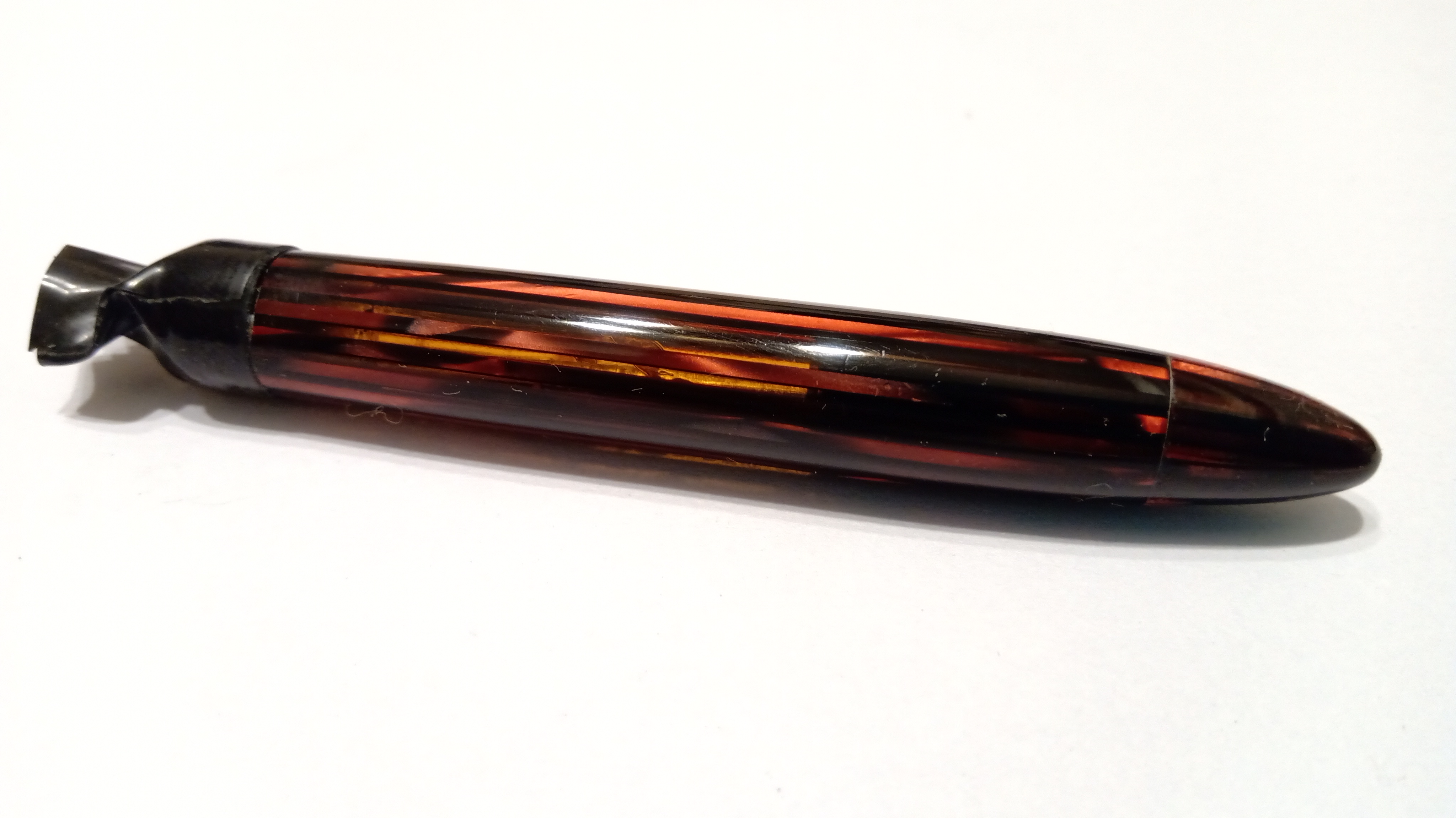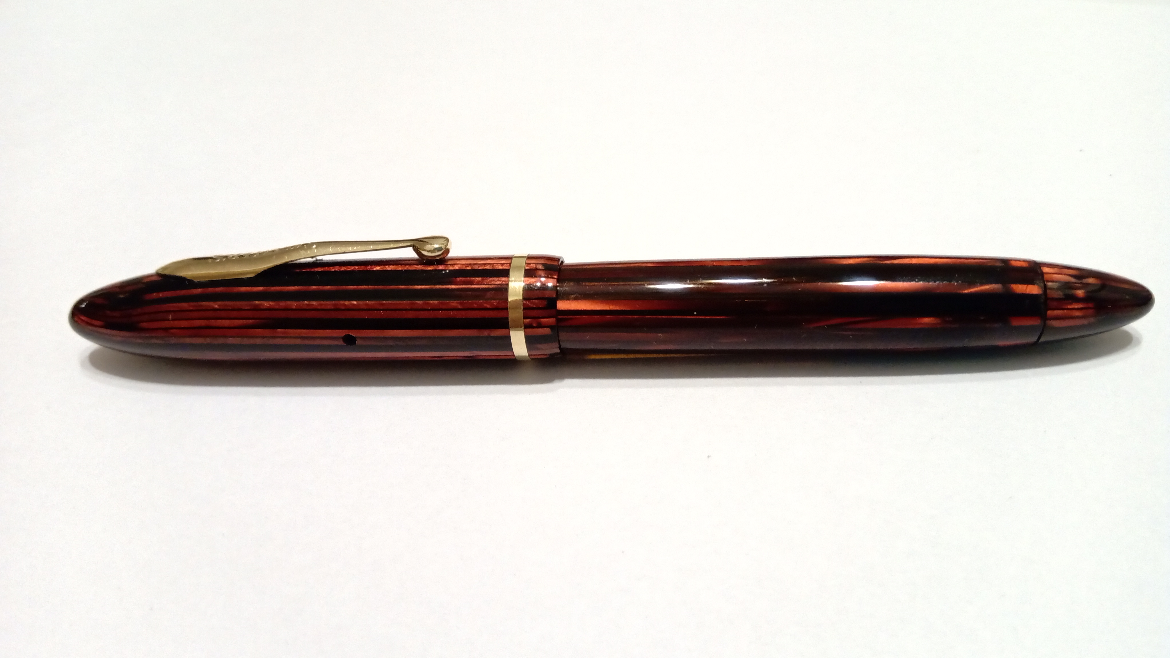 La pluma fuente es una Sheaffer's Miss Universe Streamlined Balance de 1939, una estilográfica de tamaño Lady código S3WS, fabricada en celuloide con estrías color carmesí perlado sobre fondo negro (las anteriores a este modelo tenían un color llamado Rose Glove, que eran estrías rojo perladas sobre un fondo gris), provista de un plumín original abierto rígido de oro 14K, y clip bañado en oro con la marca Sheaffer's grabada en el mismo, además de una banda angosta en el capuchón también bañada en oro. Realmente una pluma fuente simple, de carga Vacuum Fill de 1ra generación, pero de excelente calidad y performance...
