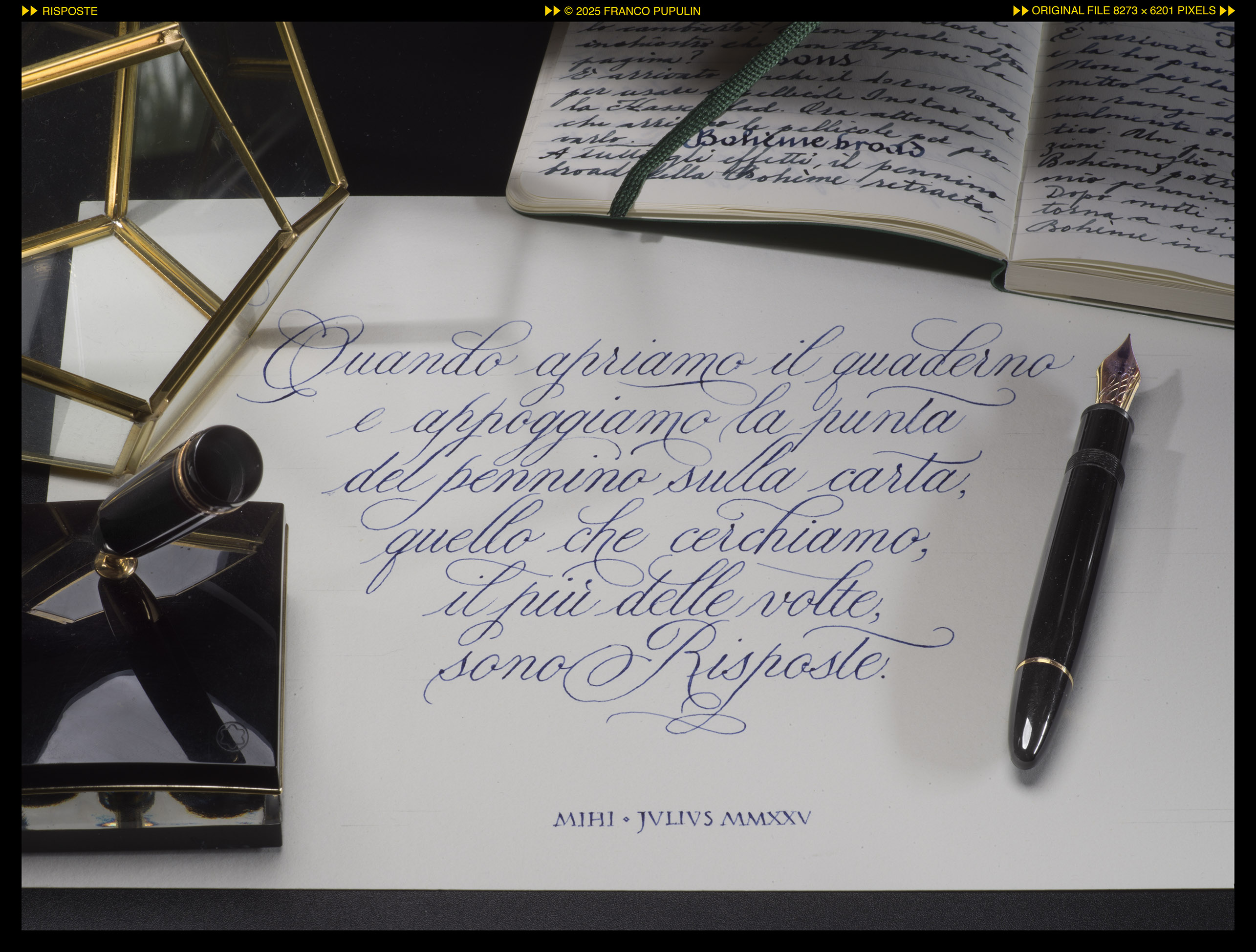 Aprire il quaderno, stendere il foglio, appoggiare il pennino sulla carta, é sempre un atto di curiosità e di scoperta, un viaggio verso se stessi di fronte all’ineluttabile alterità dell’universo intero. Scrivere é una ricerca di risposte a tutte le domande.