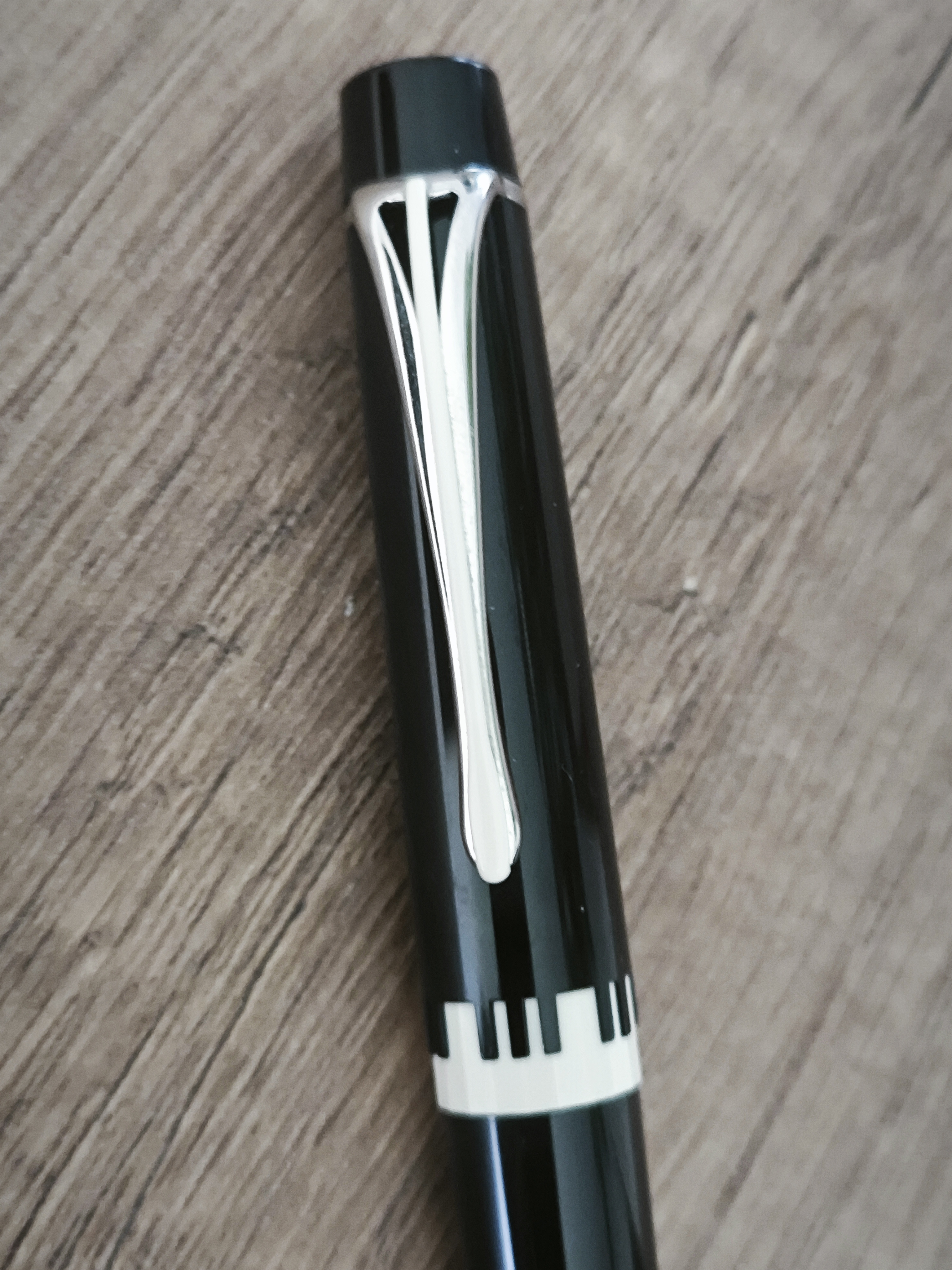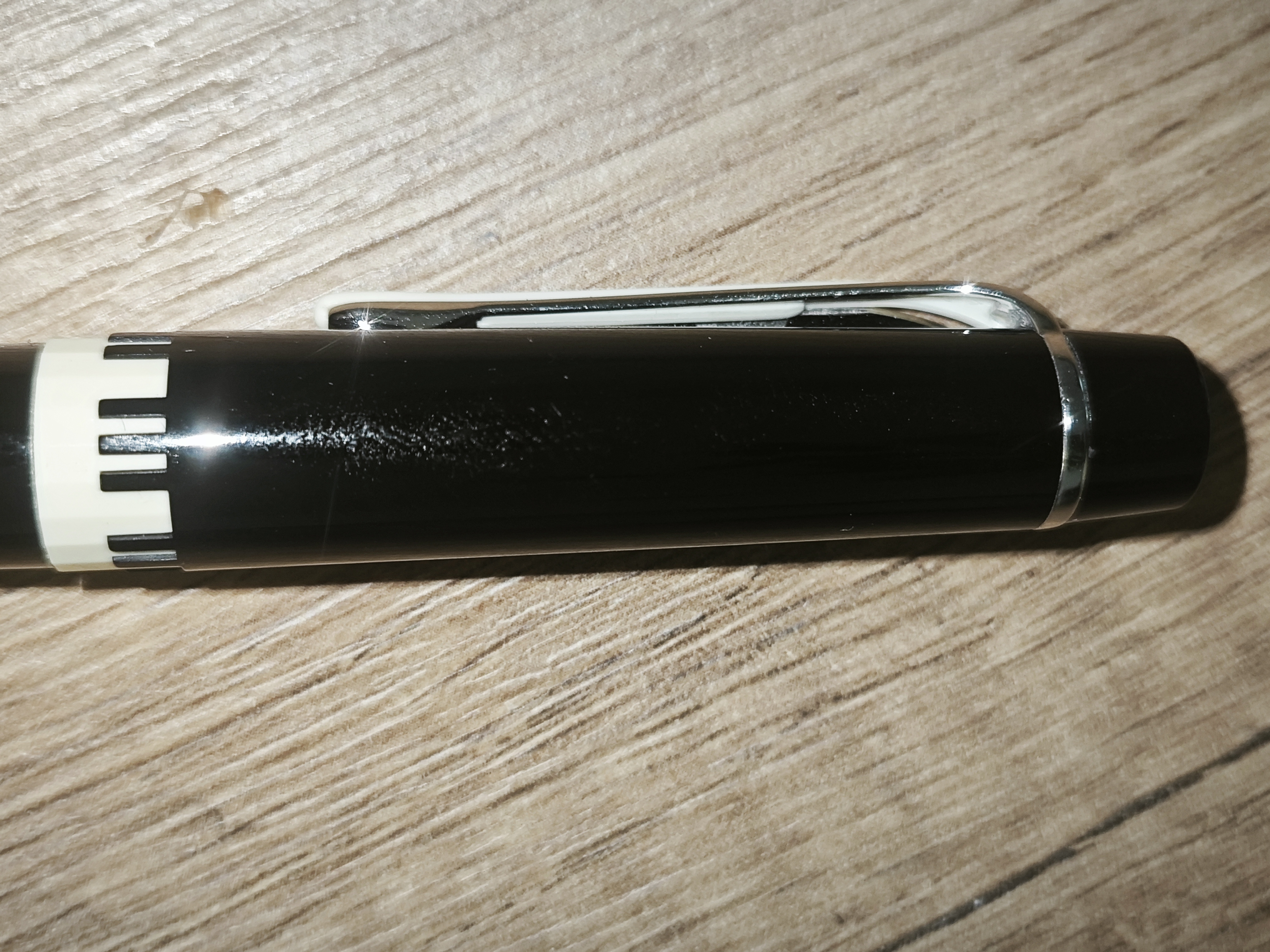 Tuttavia, i tasti che simulano la tastiera del pianoforte, sono in rilievo e illuminando il corpo della penna, appaiono nette irridescenze rossastre che potrebbero testimoniarne la costruzione in resina.