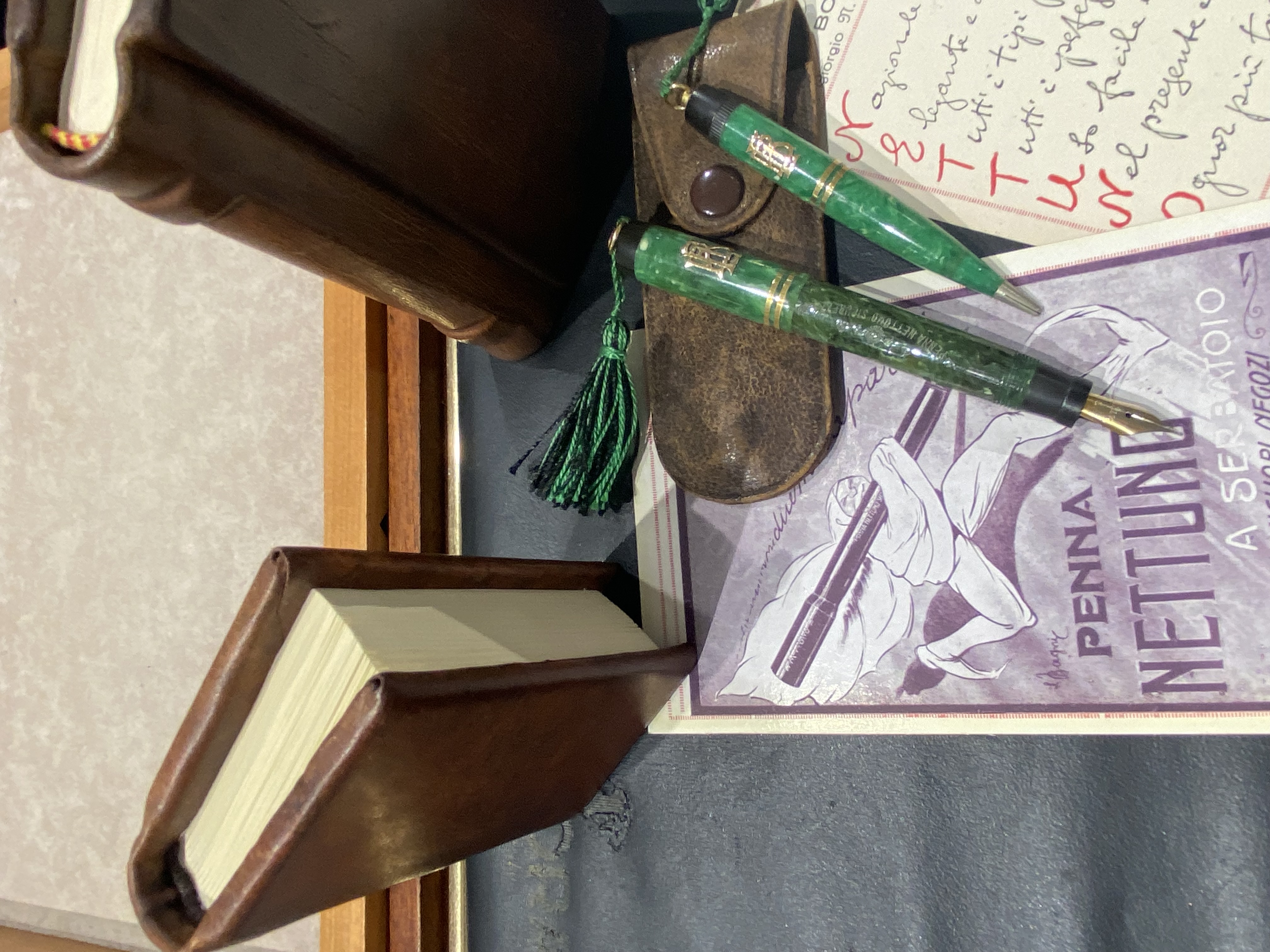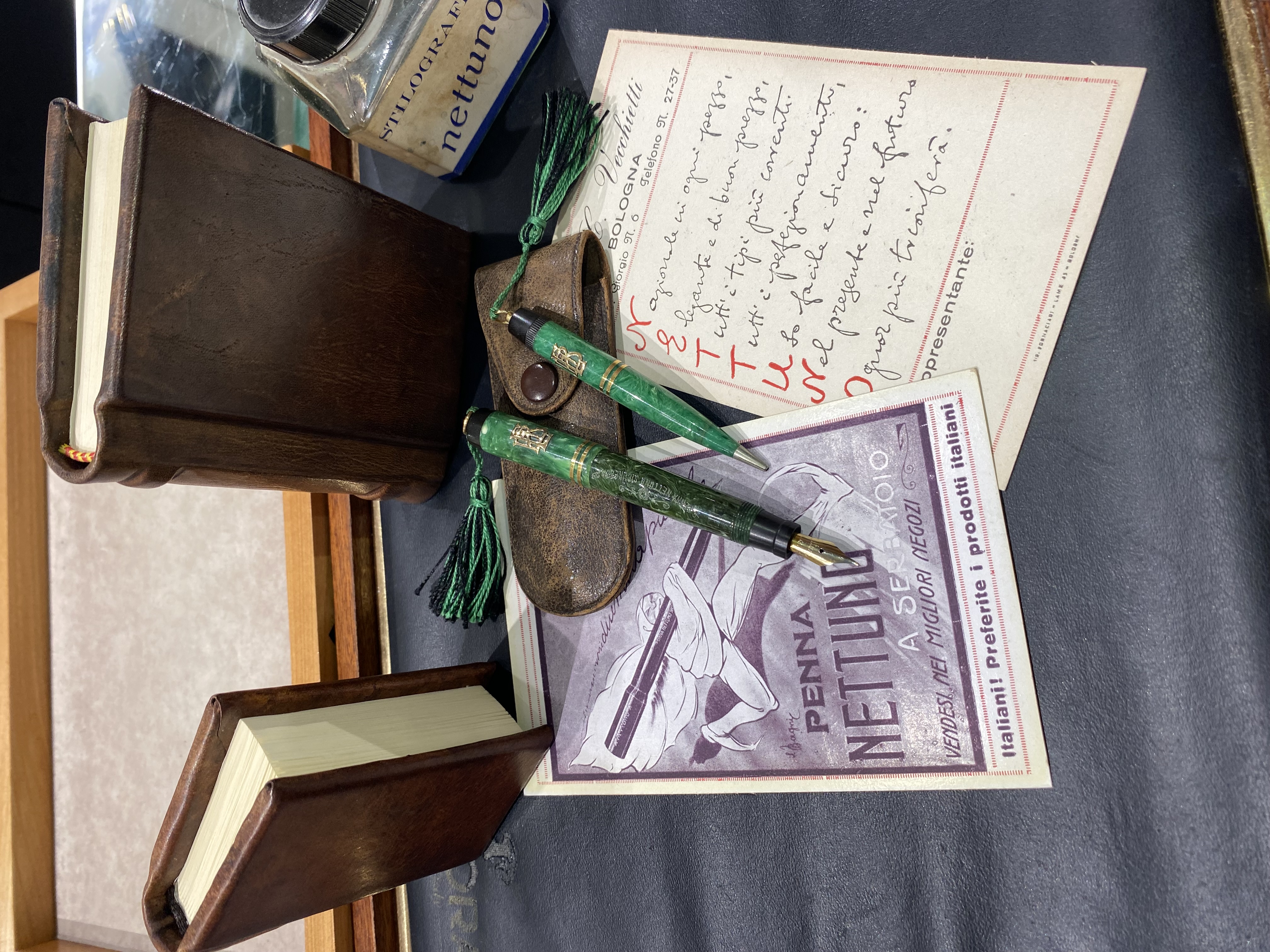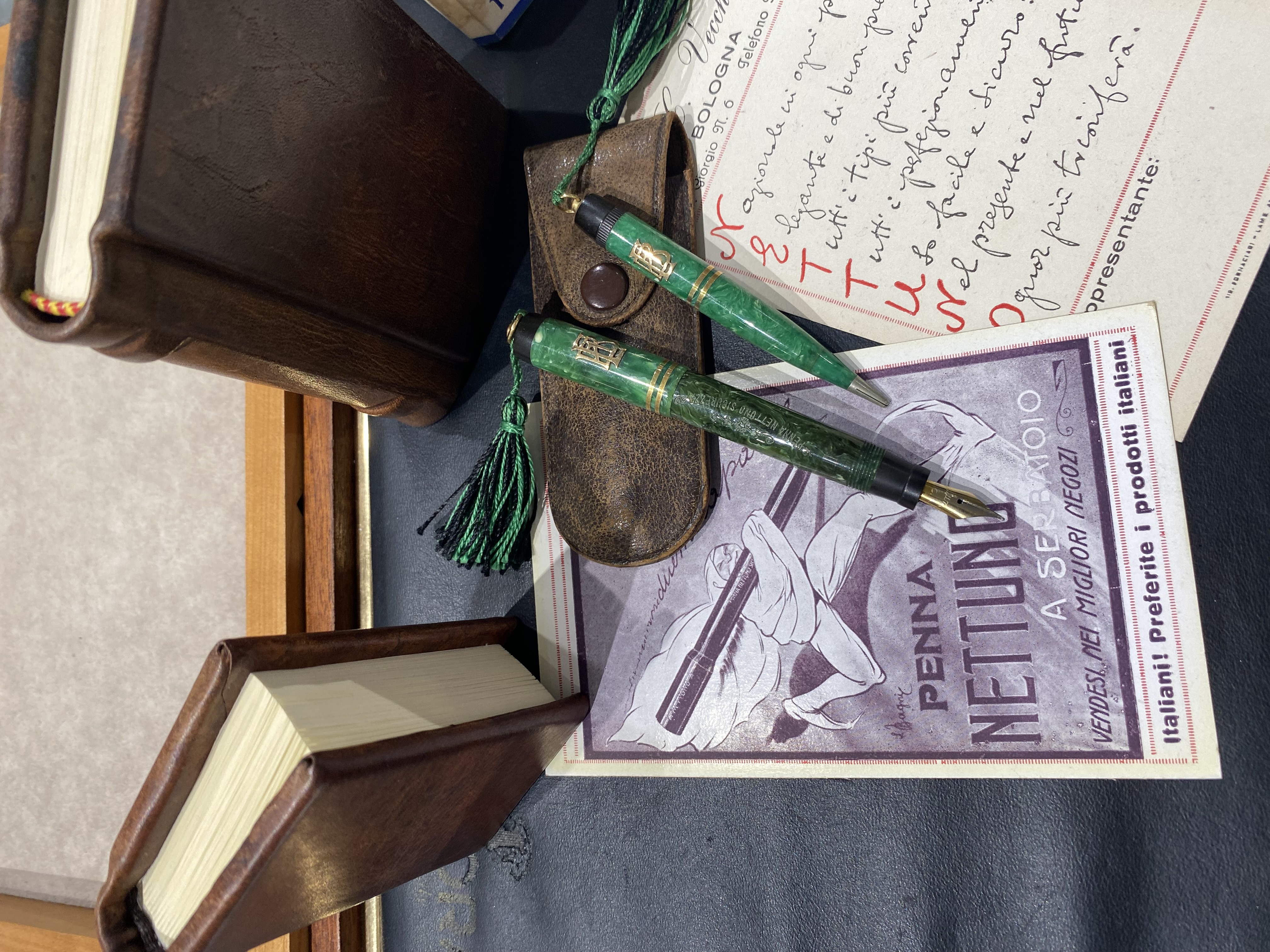 con ogni probabilità risalente agli anni ’30-’40 – ma come sempre mi affido all’esperienza di Simone per una datazione più precisa – vi presento questa parure Nettuno Sicurezza in celluloide verde, composta da penna e matita.