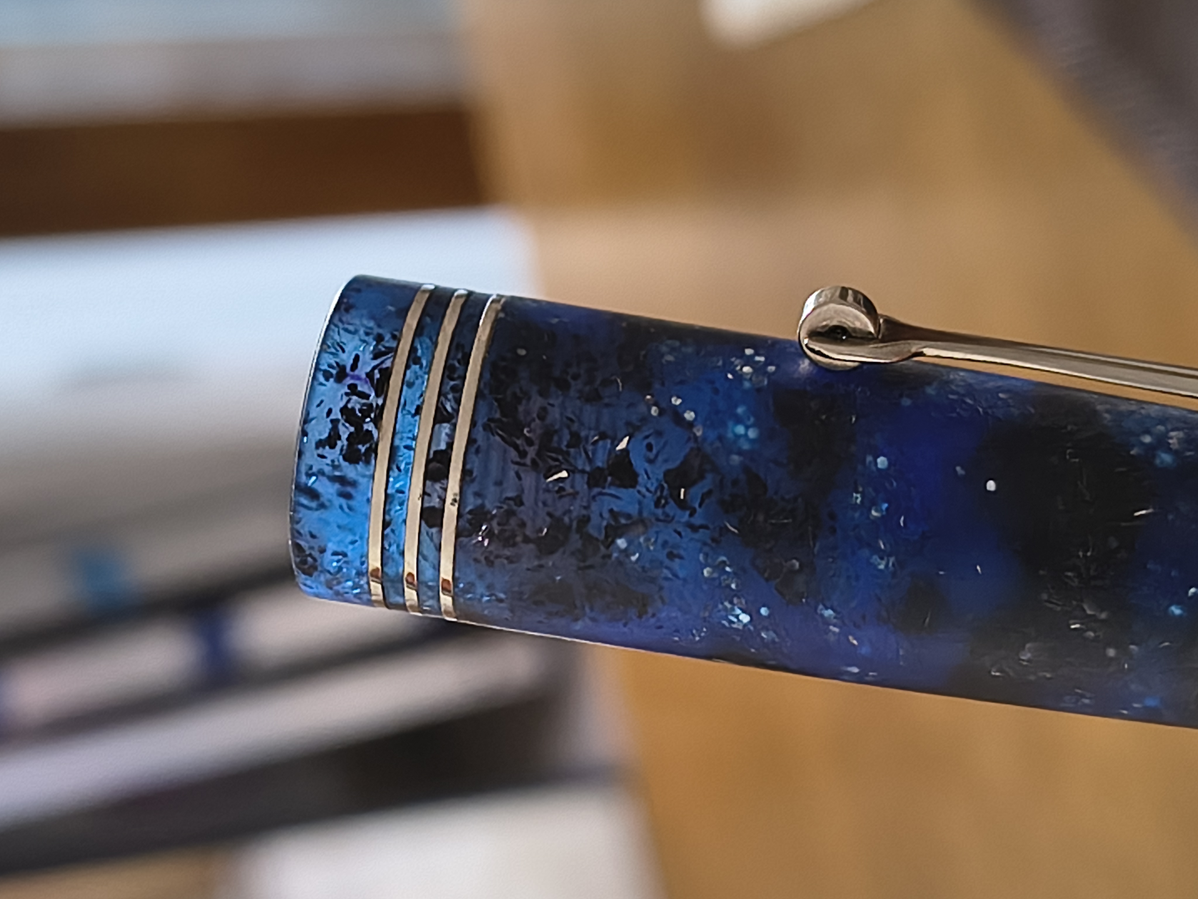 La particolarità di questa resina, a differenza delle Galaxy di Brooks, è che i glitter sono delle vere e proprie particelle metalliche abbastanza grandi. La penna ha un effetto matte molto setoso e a prima vista non si direbbe mai che il corpo è traslucido: