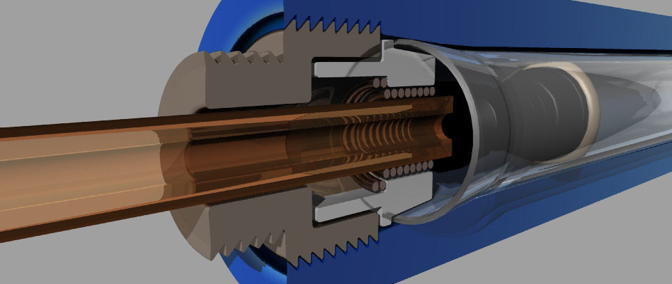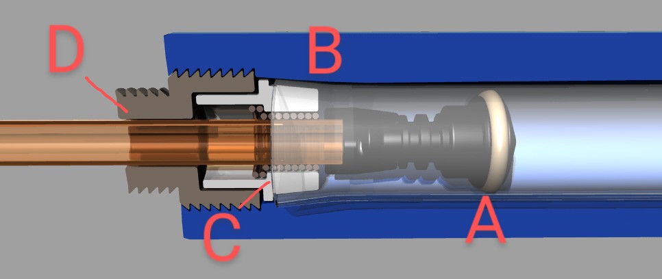 Il cilindro deve essere inserito nell'anello C e poi infilato nel pezzo D che lo preme contro la parete interna del corpo o della canna.