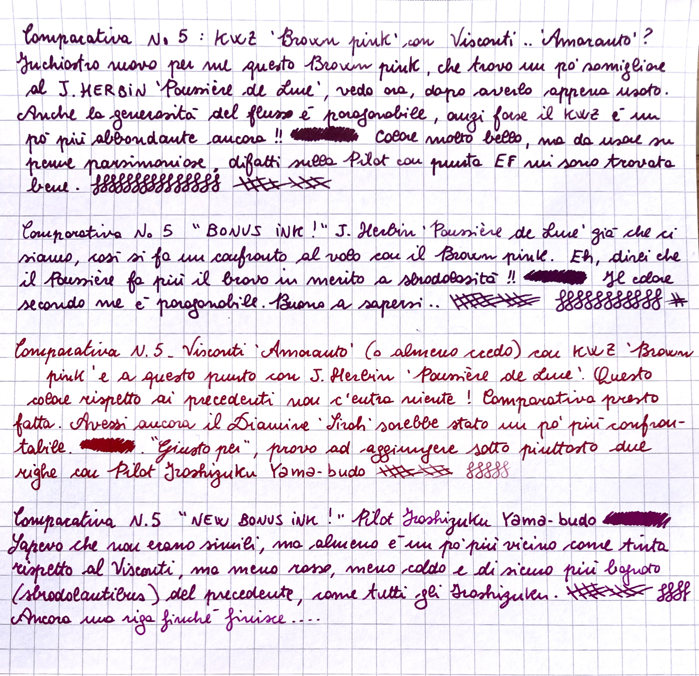 Aggiungo una nota: nel forum fountaipennetwork, in un thread sul Brown Pink, un'utente che lavora in KWZ scrive: “(...) It seems to me that this is a test of Grey Plum though and it is possible that you have a mislabelled ink, as we had few accidental swaps within the batches numbered 091016 of Grey Plum and Brown Pink. We thought we had replaced all the mistaken ones, but it seems we owe you a replacement too! I'll contact you by PM.- Agnieszka vel Mrs.KWZI”