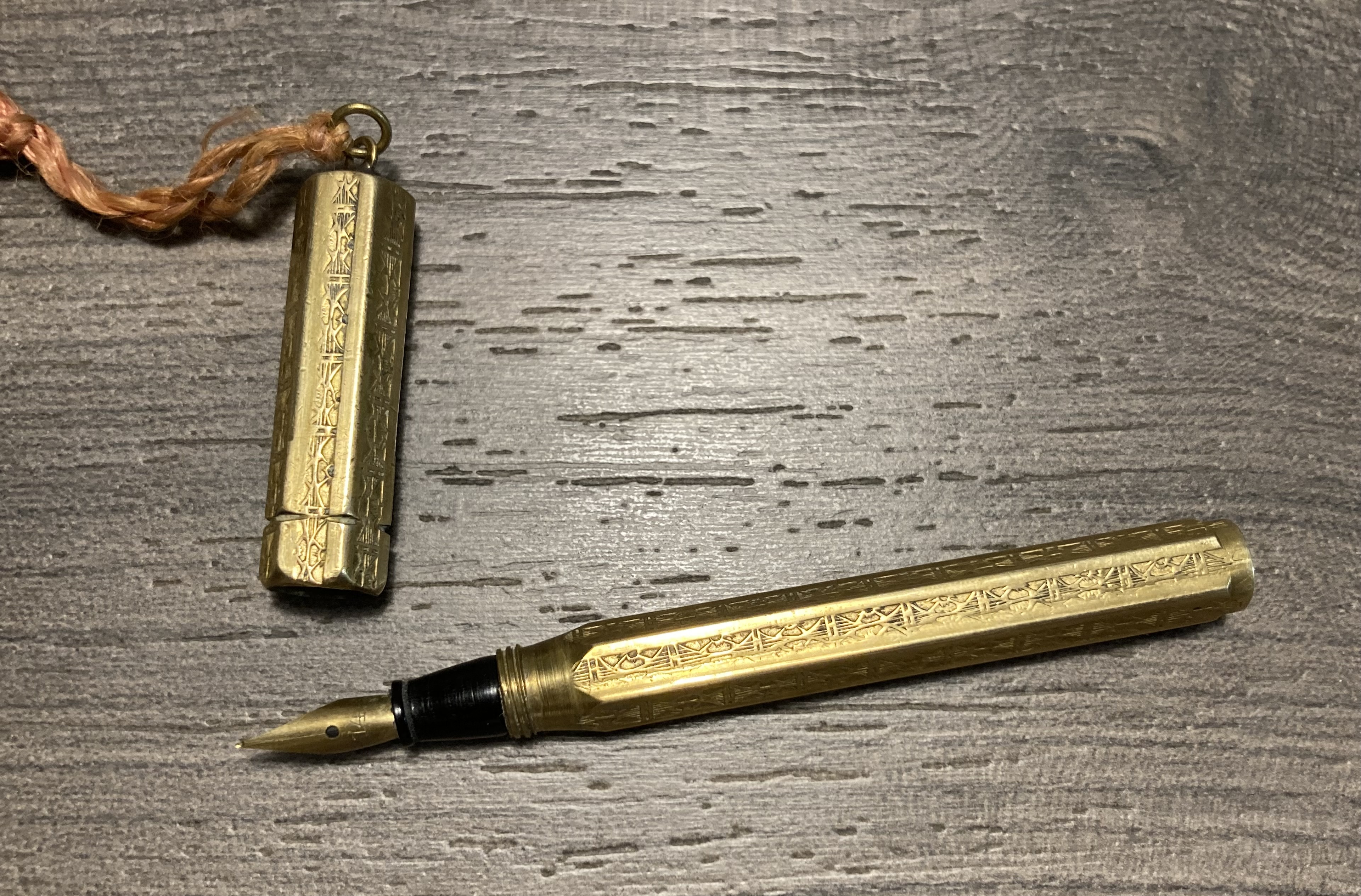 Mi sono portata a casa invece questa piccoletta di circa 10 cm in ottone, che credo sia da caricare con il contagocce o siringa direttamente nel fusto, dove l’alimentatore si inserisce a vite. Il pennino dice solo “14”, che non so se intenda una vecchia misura o l’oro. Sembra in buono stato ed è un po’ flessibile (ho provato piano piano per vedere come reagiva). L’incisione su fusto e cappuccio ricorda un disegno geometrico o un geroglifico ripetuto! Sapete indirizzarmi su cosa mi sono portata a casa? :lol: La nappina è un po’ conciata, quindi la sostituirei presto e volentieri. Non so neanche se sia la “sua” originale o meno. Nel primo caso la conserverei per dovere storico, altrimenti via! In mano è davvero un bel materiale: non pensavo facesse questo effetto l’ottone. Sembra.. morbido :D Vien voglia di continuare a passarci le dita.