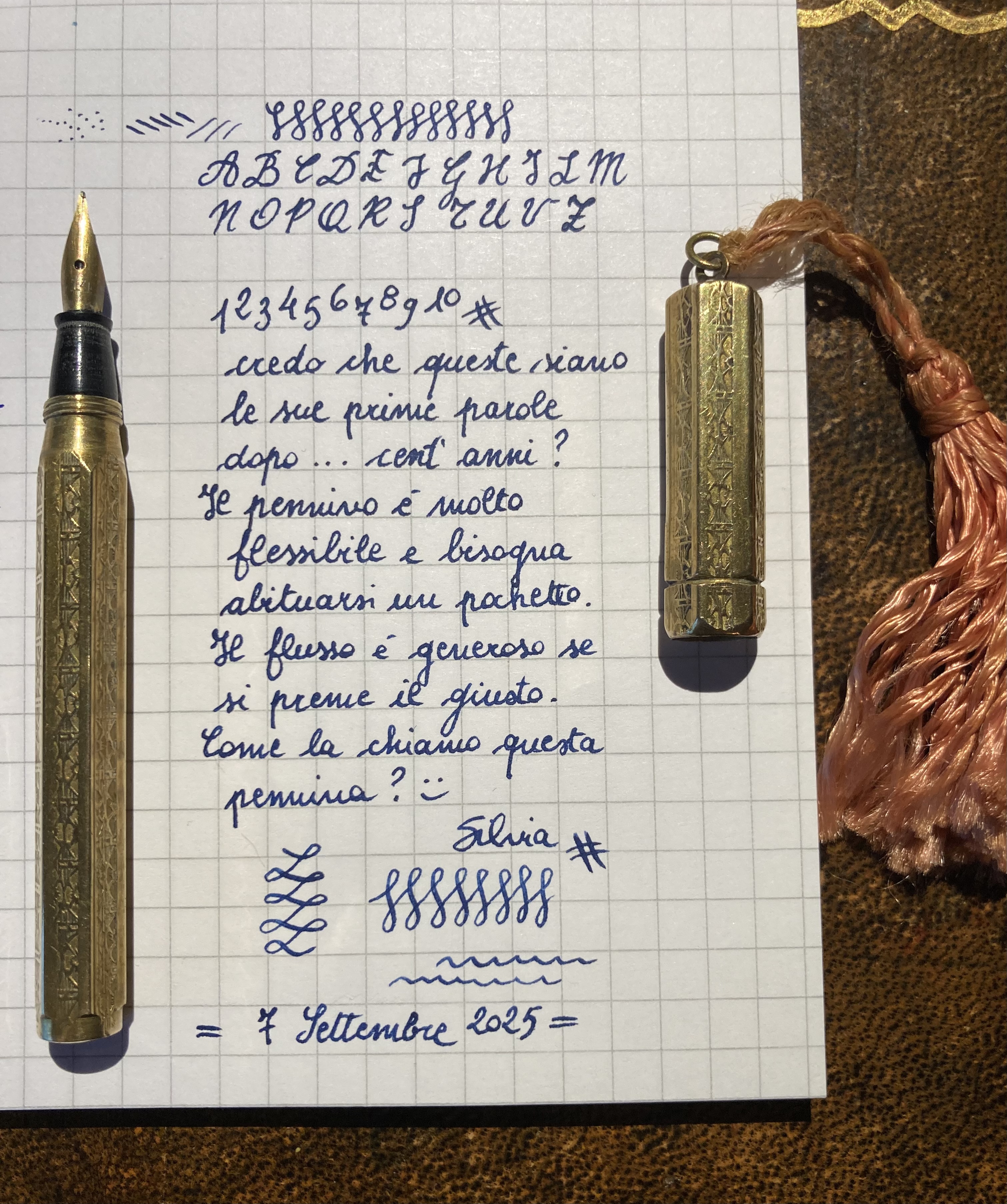 Stasera la provo. Così vedo come funziona nello stato in cui si trova; soprattutto il pennino voglio capire. È molto morbido, delicato. Il rebbio dx sembra un poco più basso ma appena appoggi si allinea col fratello. Voglio vedere in scrittura! Spero non abbia problemi