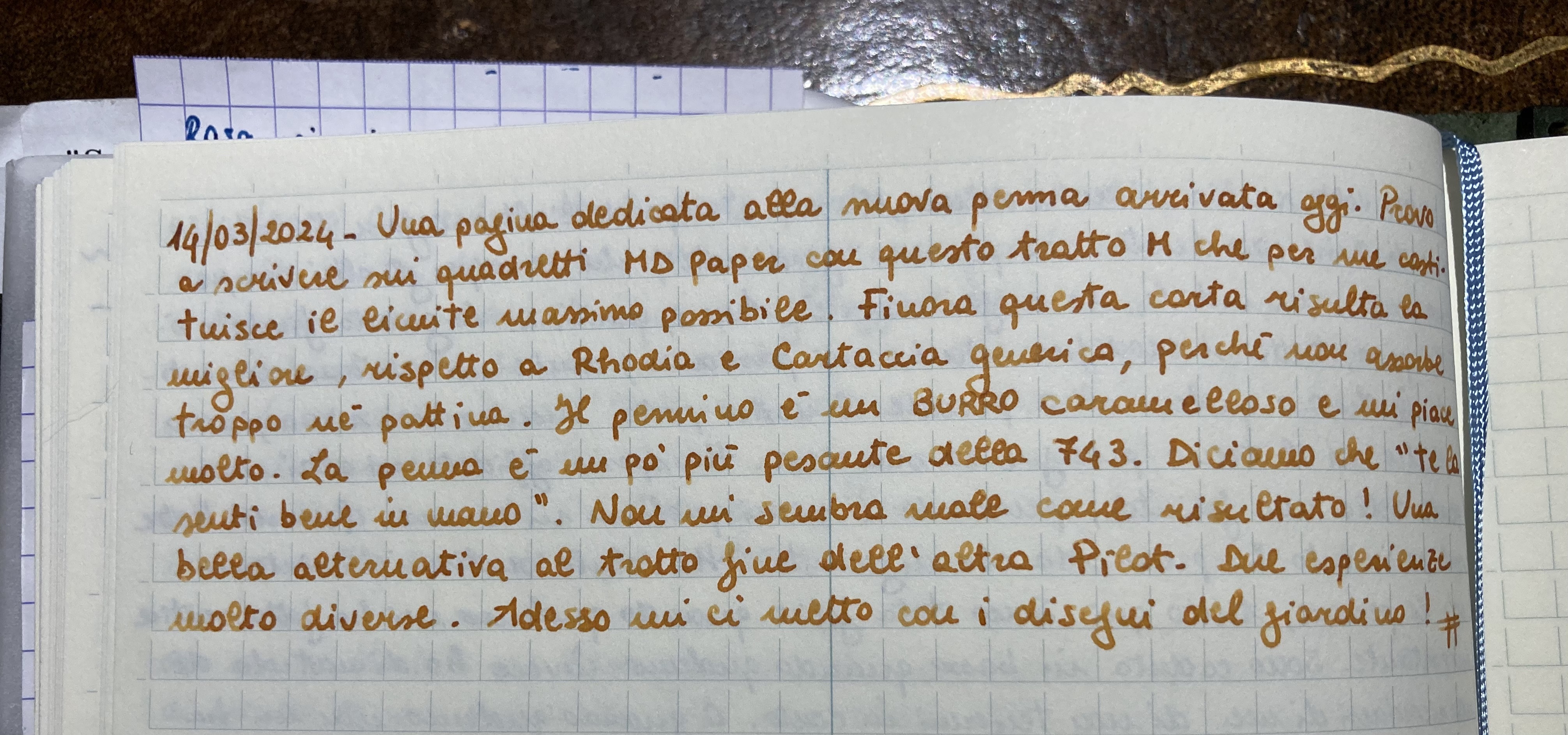 Questa mattina ho provato un' altra 823 F di un utente del forum, era caricata con Seiboku e ho trovato il suo pennino ancora più molleggiato del mio. Lo trovo un pennino fantastico, non liscio scivoloso come molti pennini Pilot e come appunto la misura M.