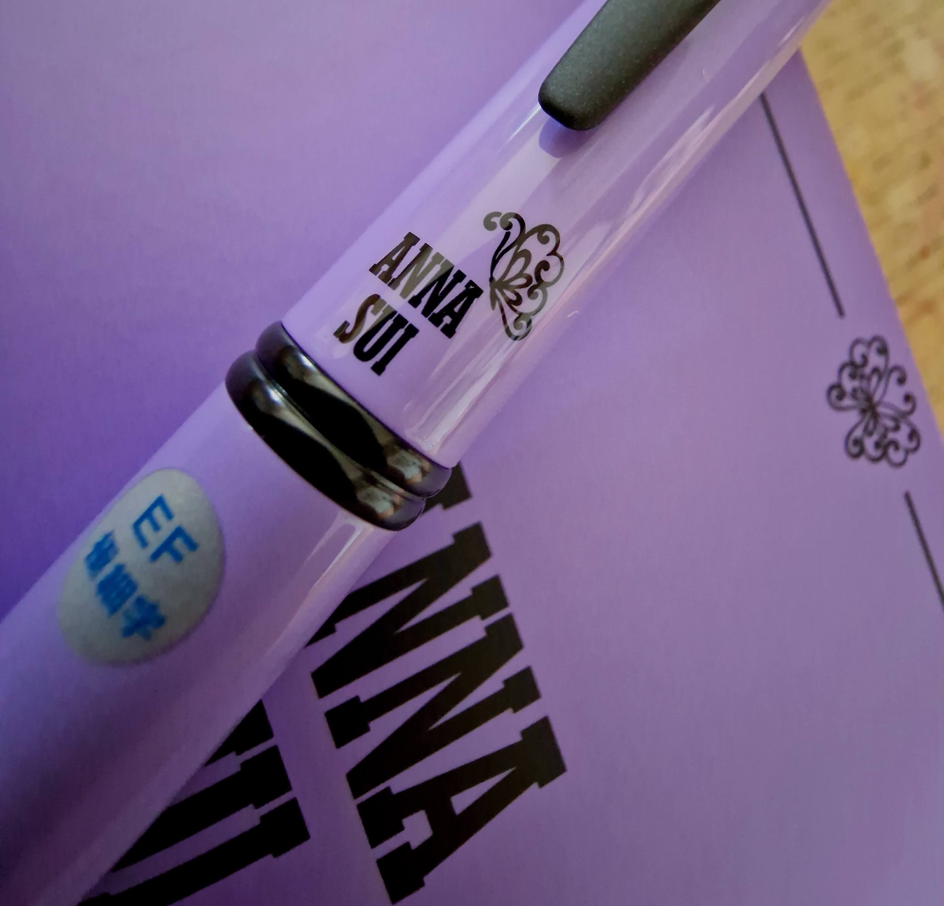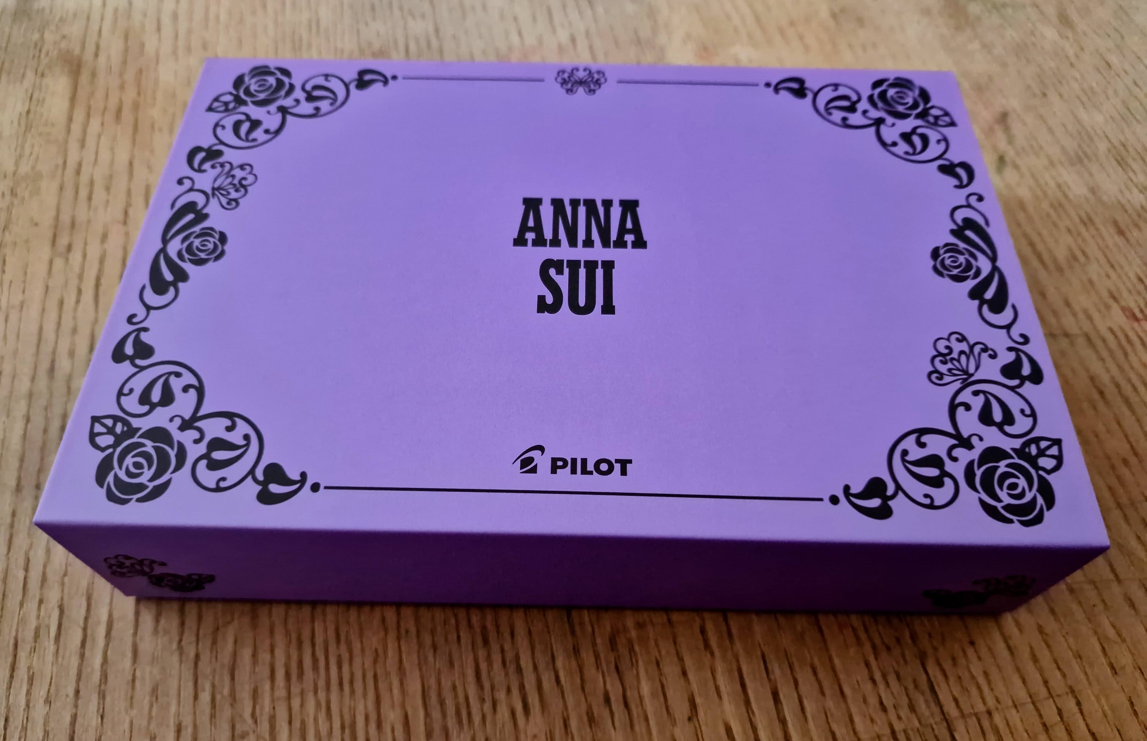 Si presenta con trim neri (grip, clip e bottone sono matificati, anelli centrali lucidi), corpo di un colore viola medio tendente al freddo, e branding in nero: scritta Anna Sui con una farfalla ad ali chiuse su un lato, una farfalla ad ali aperte sull'altro. La farfalla è disegnata in arabeschi. Entrambe le stesse farfalle si trovano sulla scatola, insieme a motivi di rose e foglie.