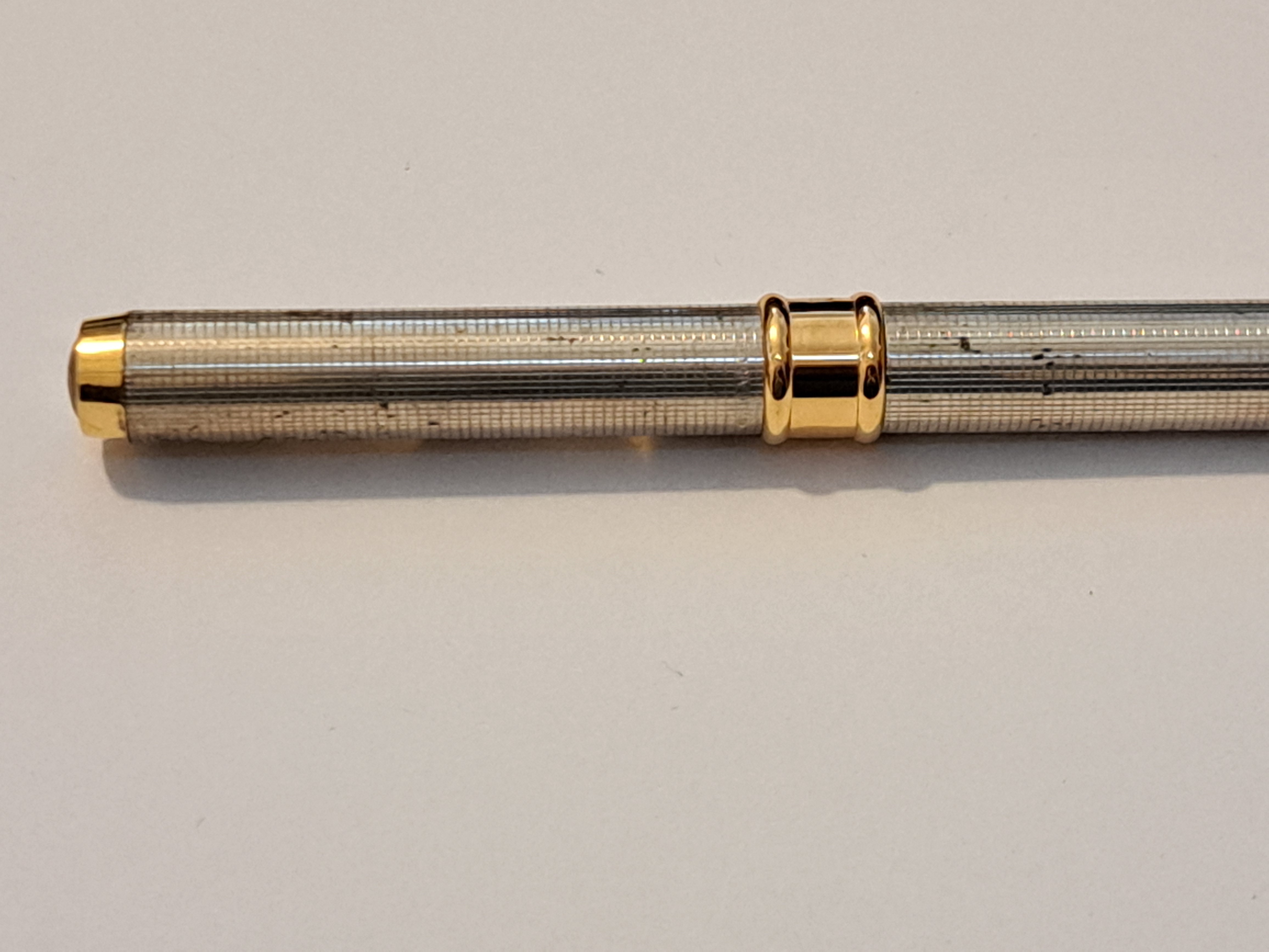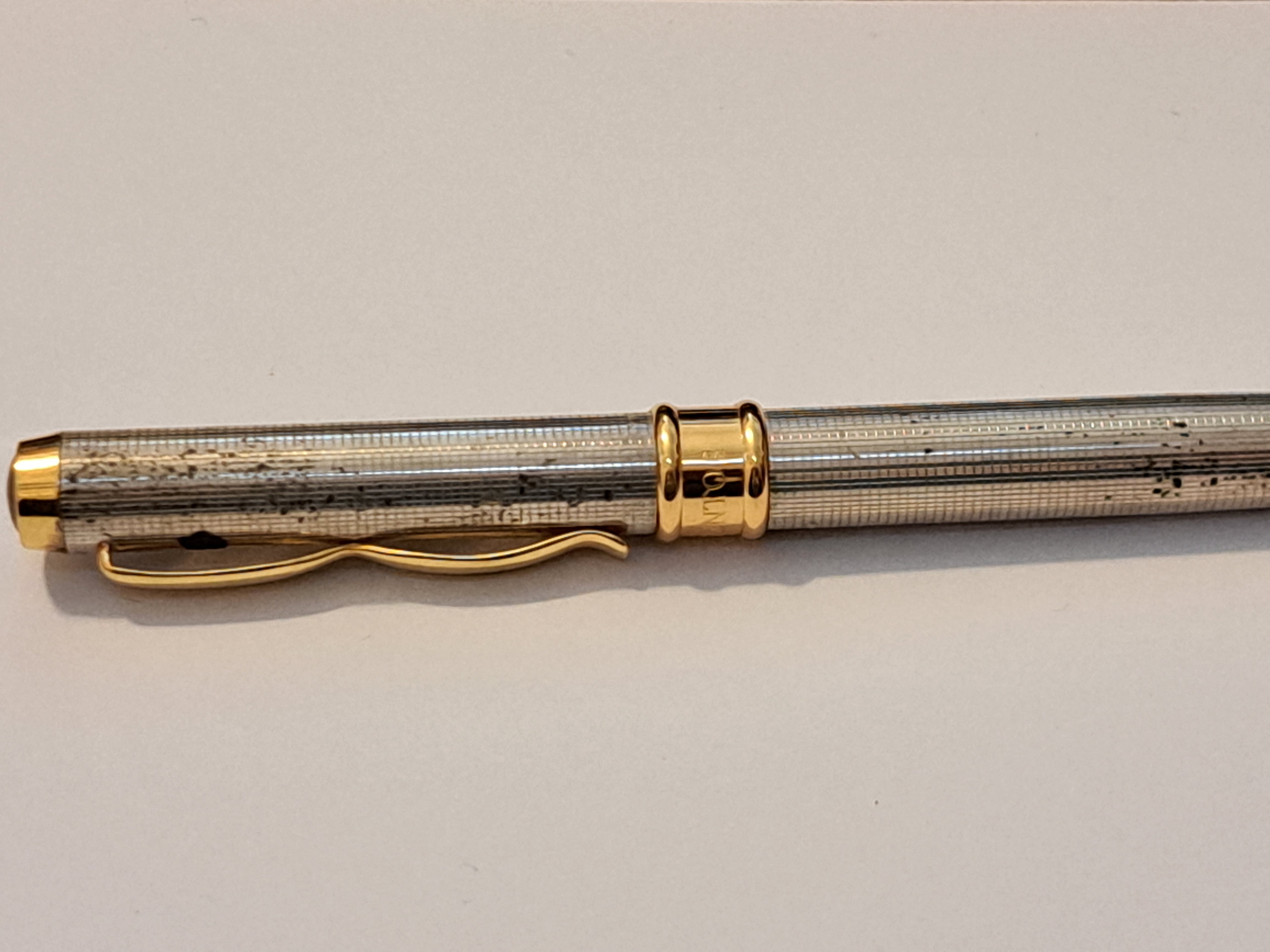 Il gruppo scrittura, come spesso succede nelle penne di oreficeria, è un generico iridium point di difficile attribuzione (prima del 2000 potevano essere europei, successivamente sono più facilmente cinesi). Vista la linea della penna, io direi ante 2000.