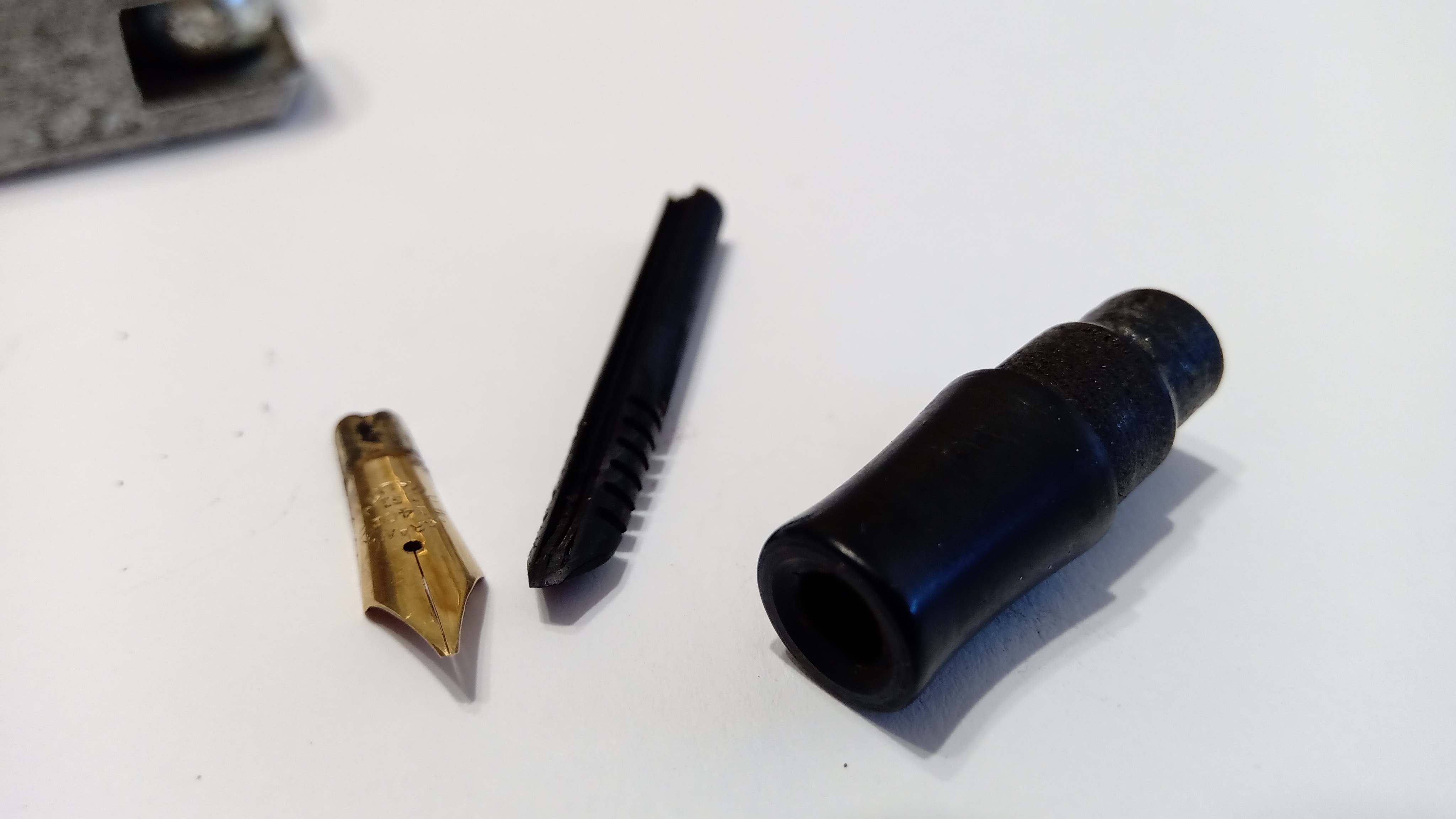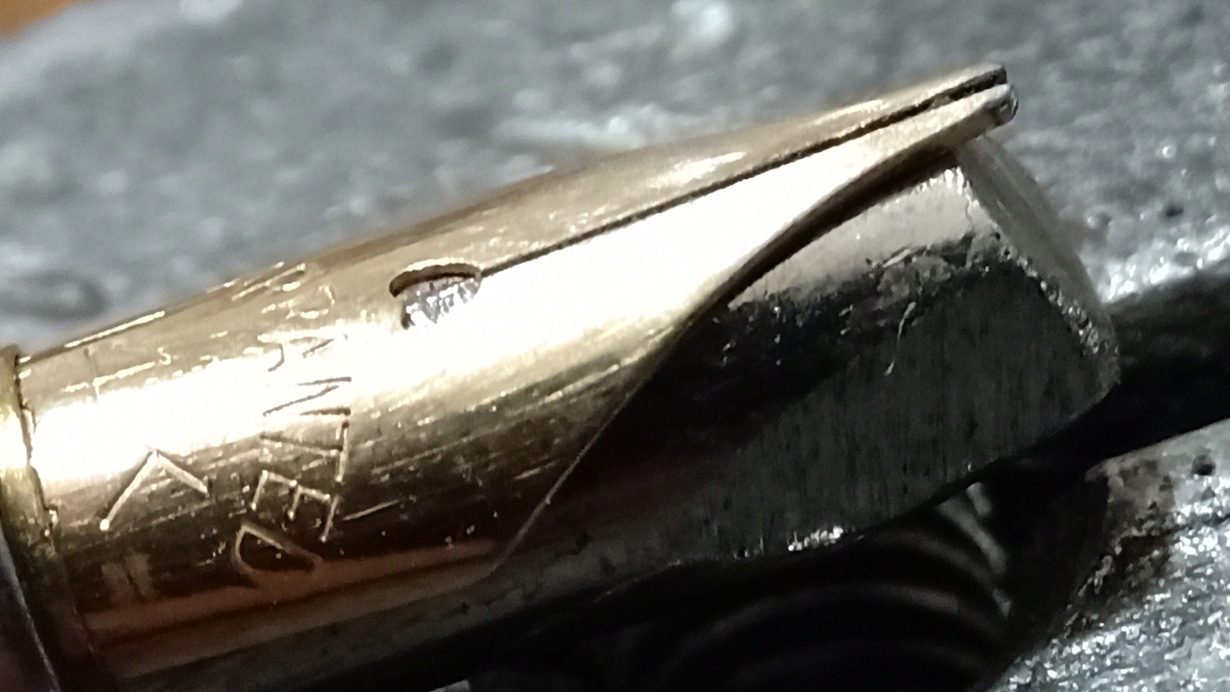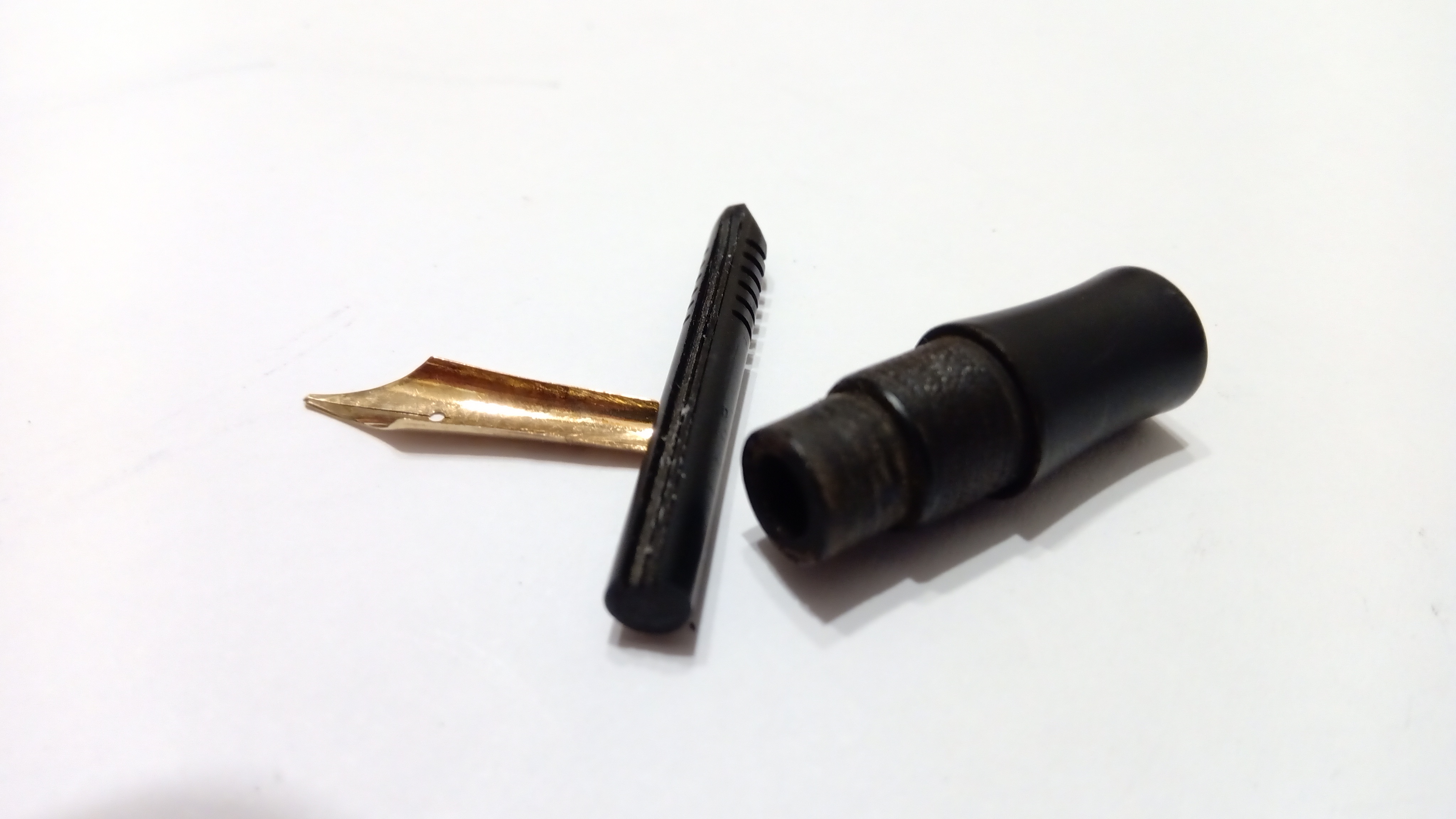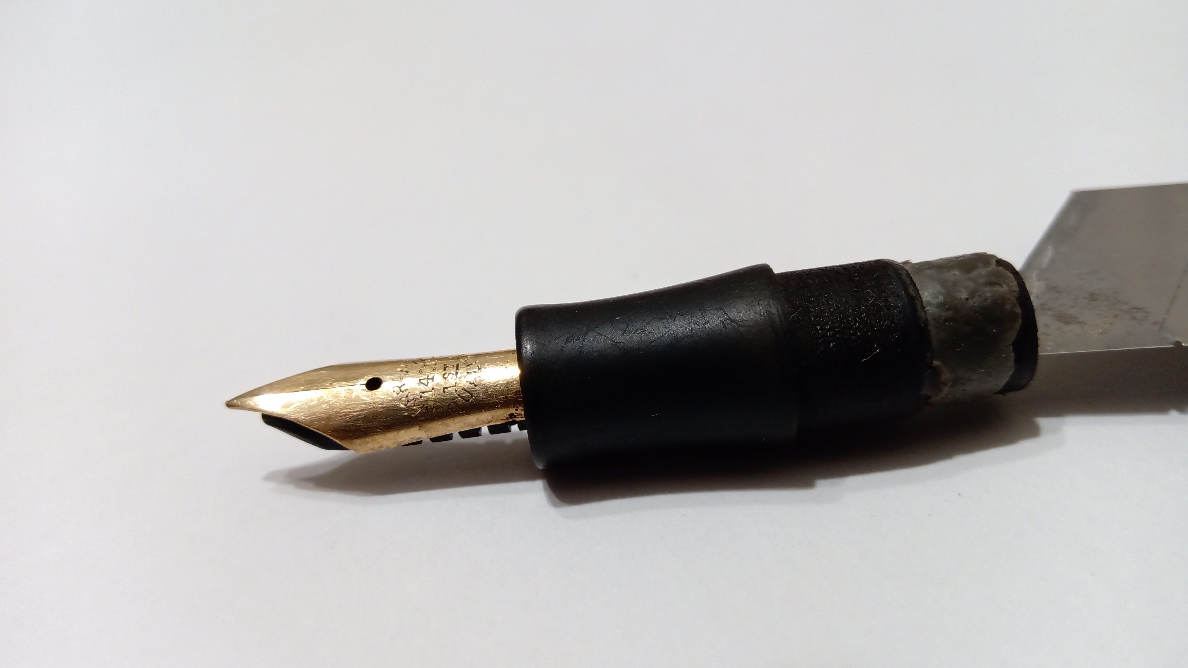 Purtroppo tutti i tentativi di utilizzare il pennino furono vani, poiché aveva perso completamente l'iridio e, essendo un pennino flessibile estremamente sottile, mi era impossibile creare una sorta di arrotondamento all'estremità, quindi finiva sempre per conficcarsi, graffiare o impigliarsi. Era più uno stiletto che un pennino.