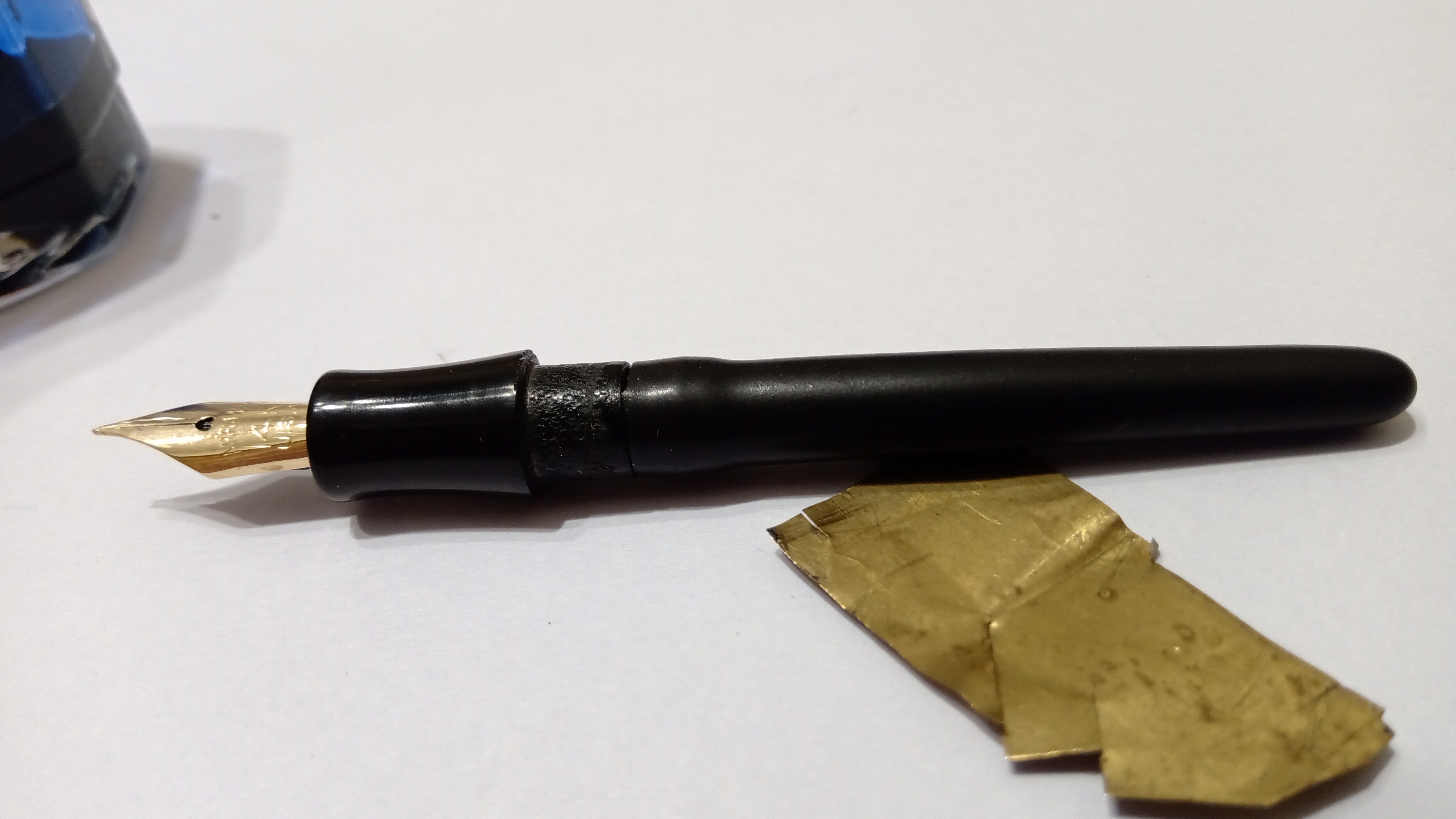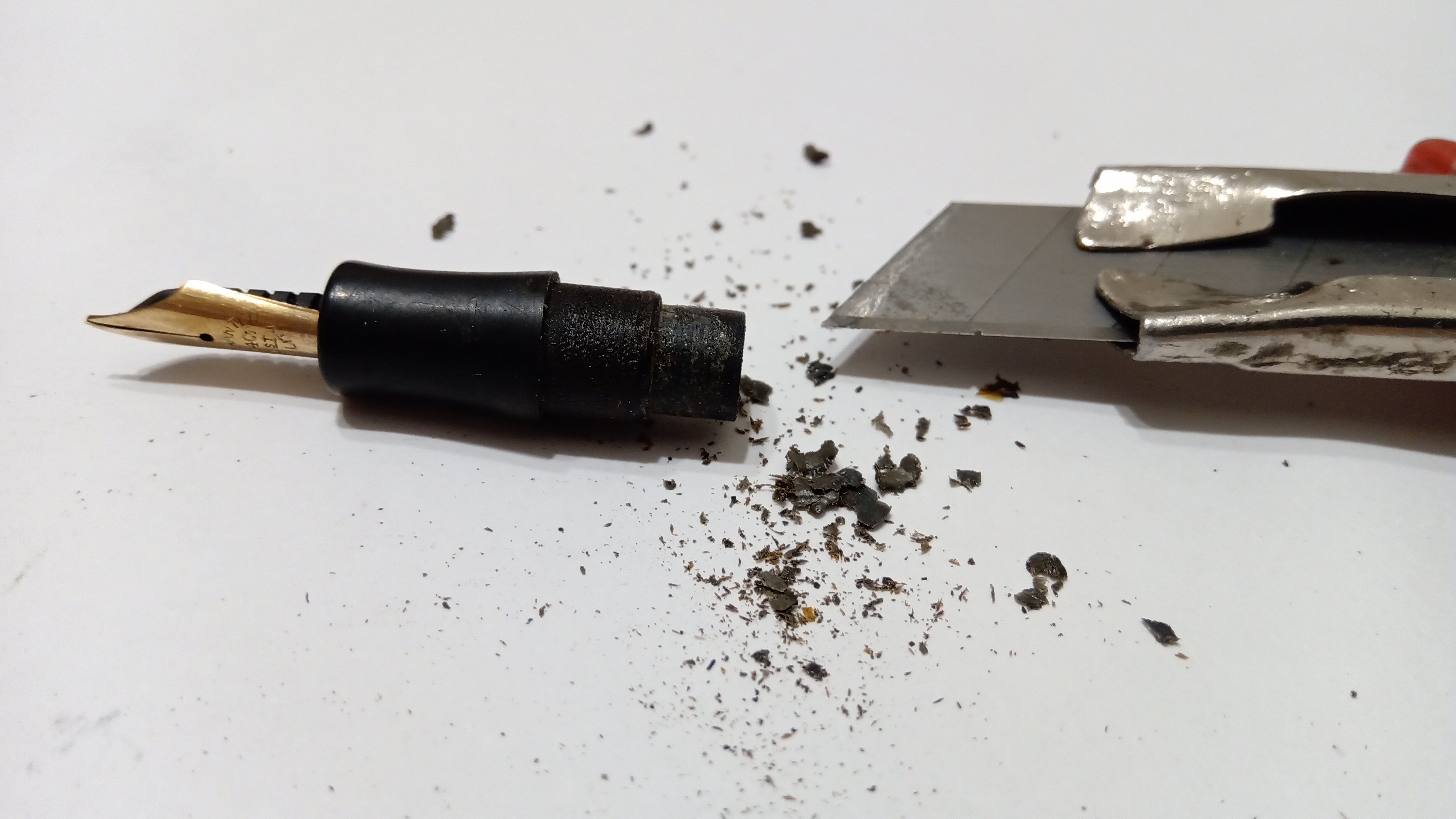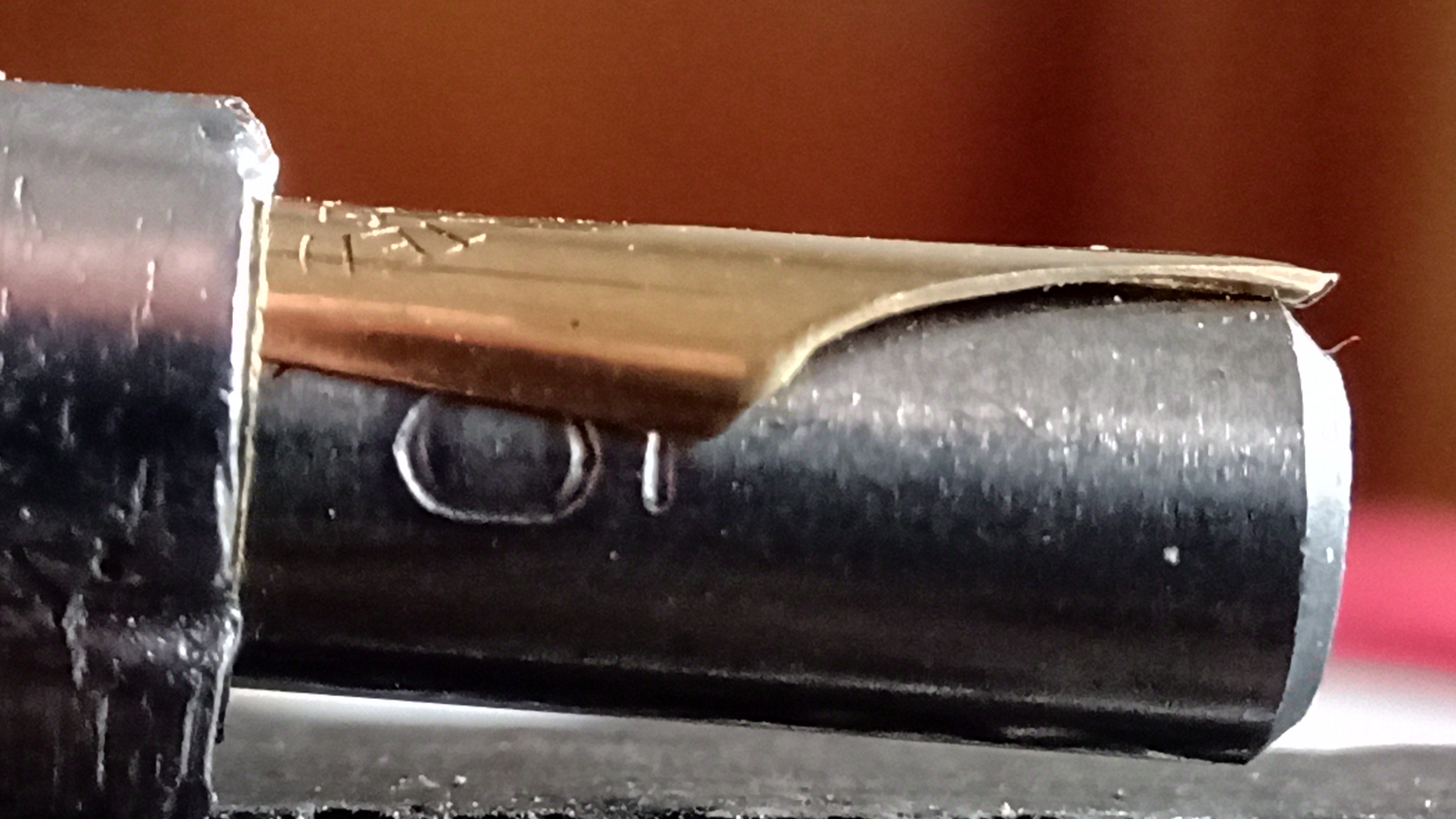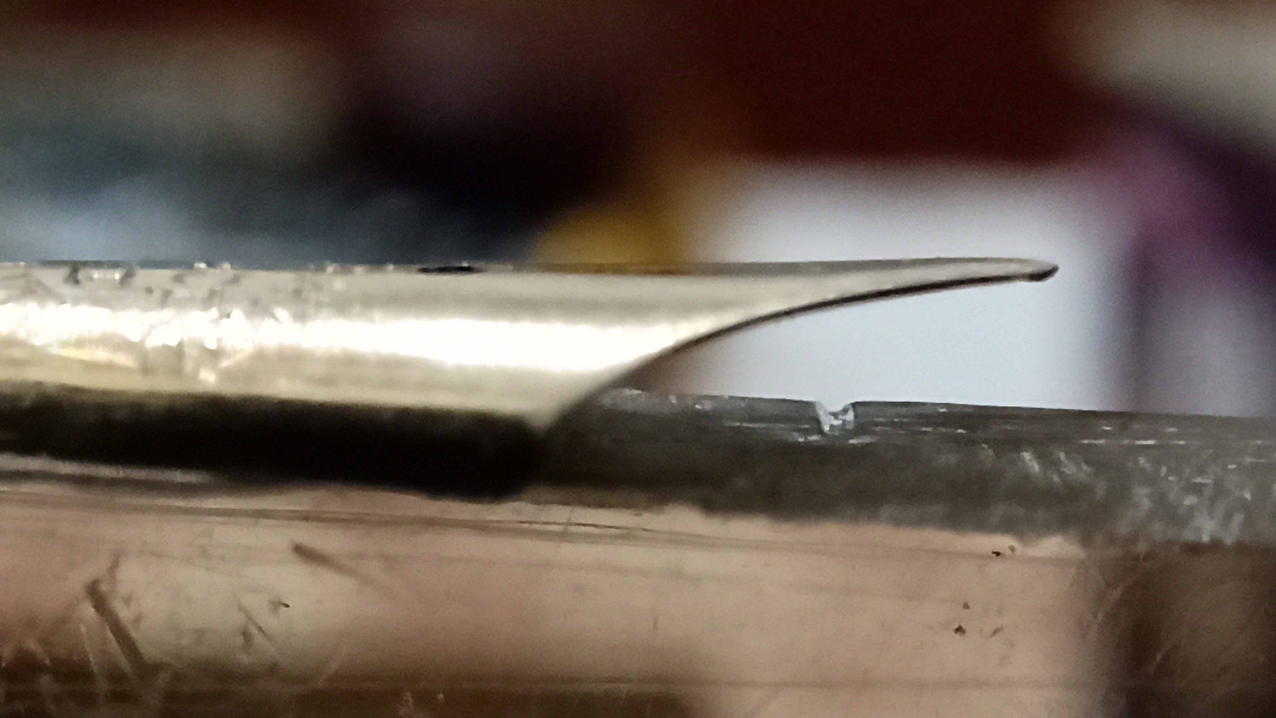 Purtroppo tutti i tentativi di utilizzare il pennino furono vani, poiché aveva perso completamente l'iridio e, essendo un pennino flessibile estremamente sottile, mi era impossibile creare una sorta di arrotondamento all'estremità, quindi finiva sempre per conficcarsi, graffiare o impigliarsi. Era più uno stiletto che un pennino.