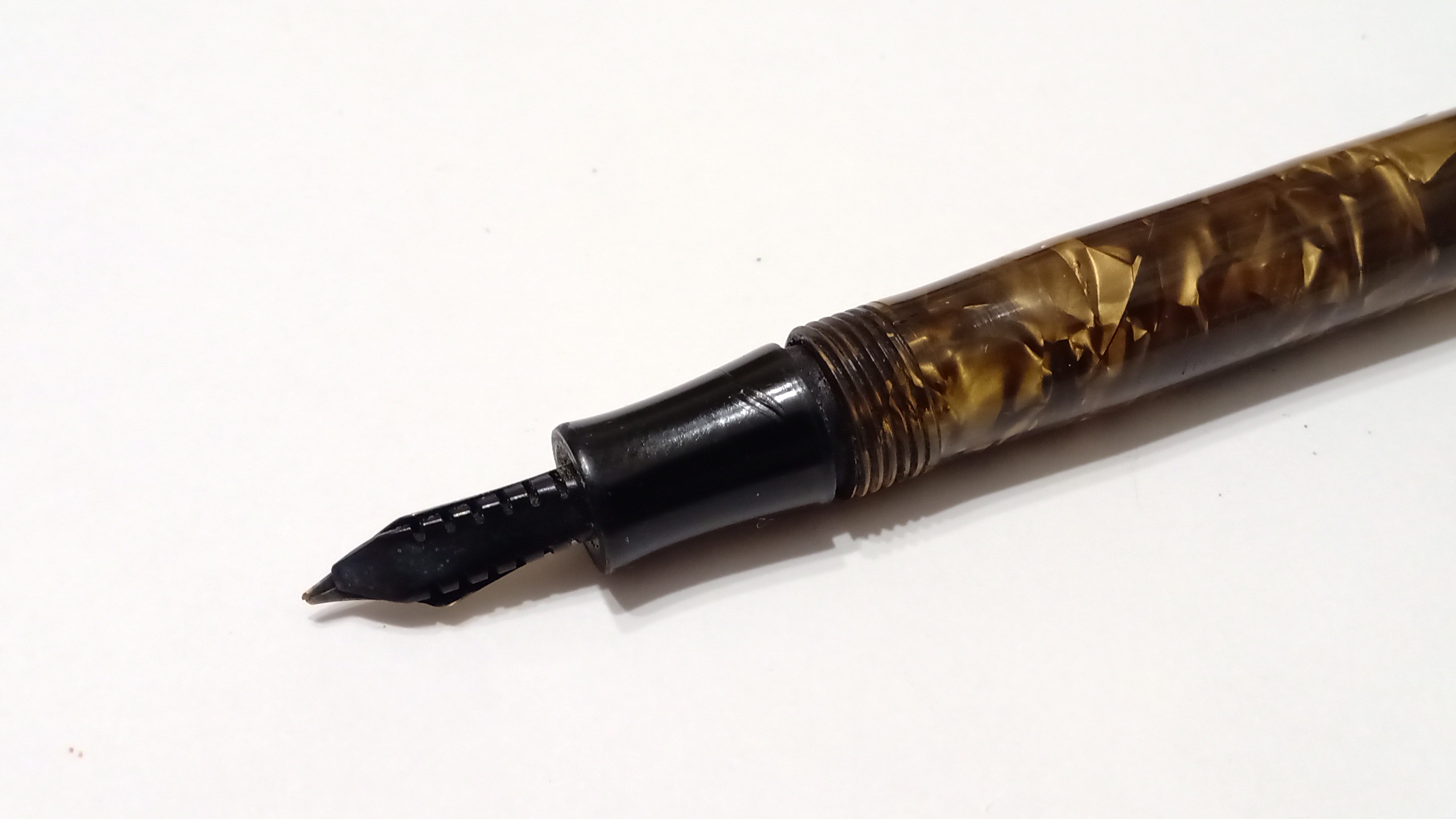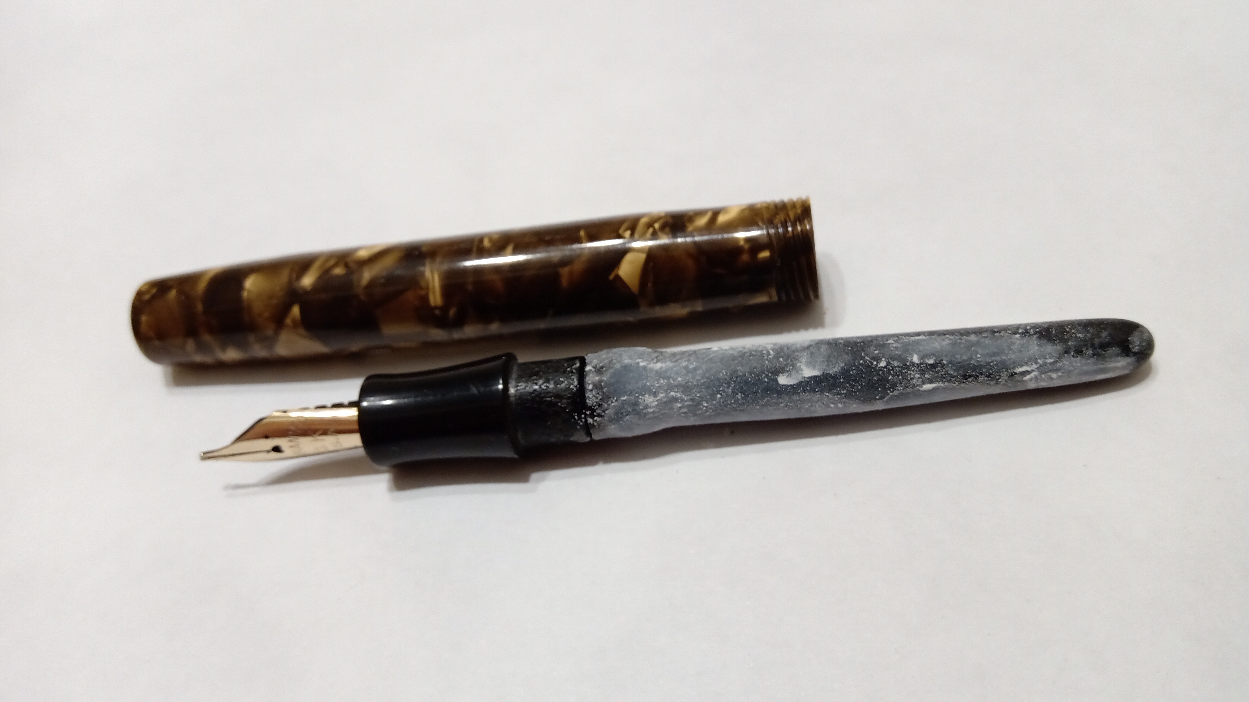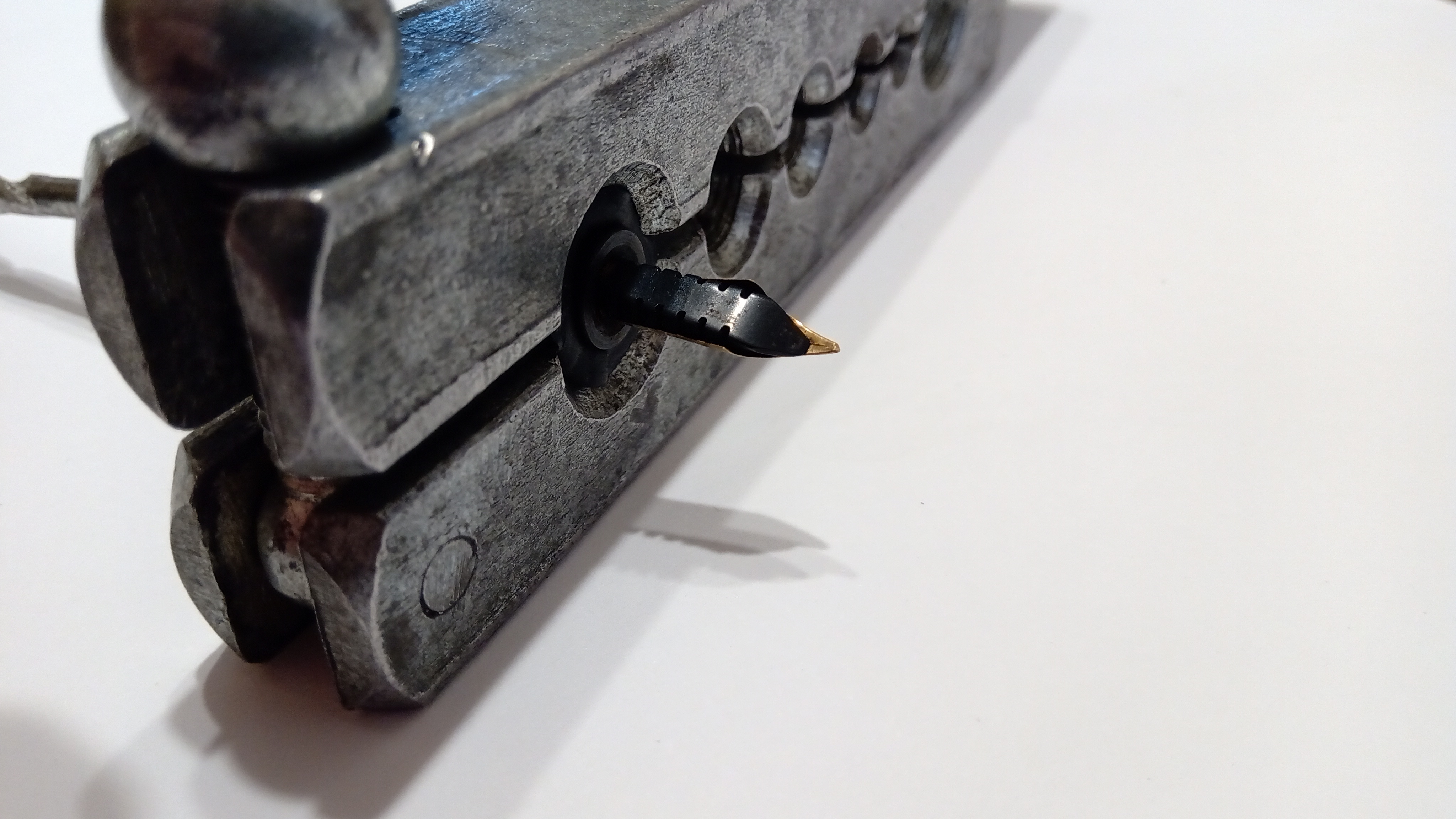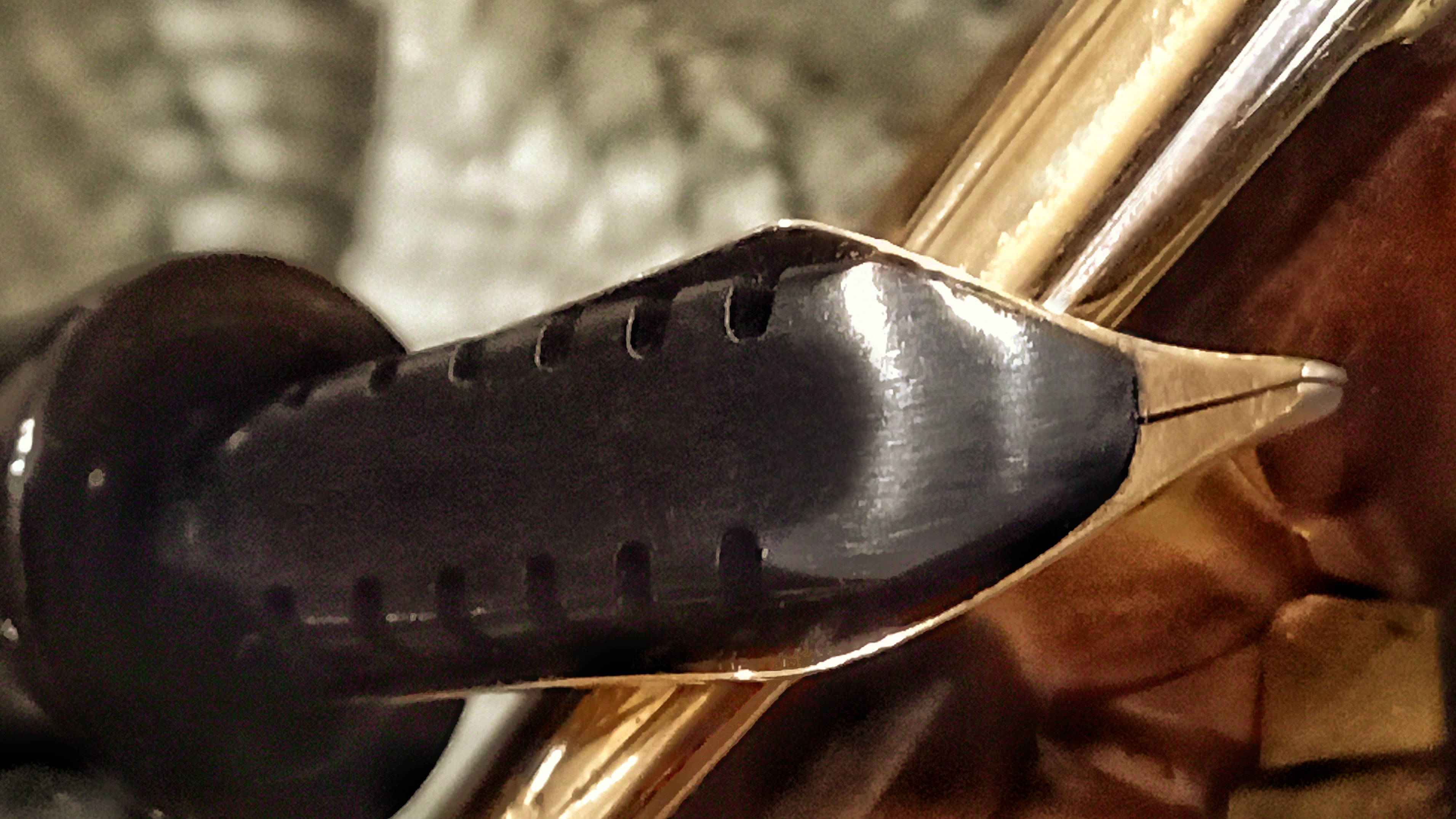 Purtroppo tutti i tentativi di utilizzare il pennino furono vani, poiché aveva perso completamente l'iridio e, essendo un pennino flessibile estremamente sottile, mi era impossibile creare una sorta di arrotondamento all'estremità, quindi finiva sempre per conficcarsi, graffiare o impigliarsi. Era più uno stiletto che un pennino.