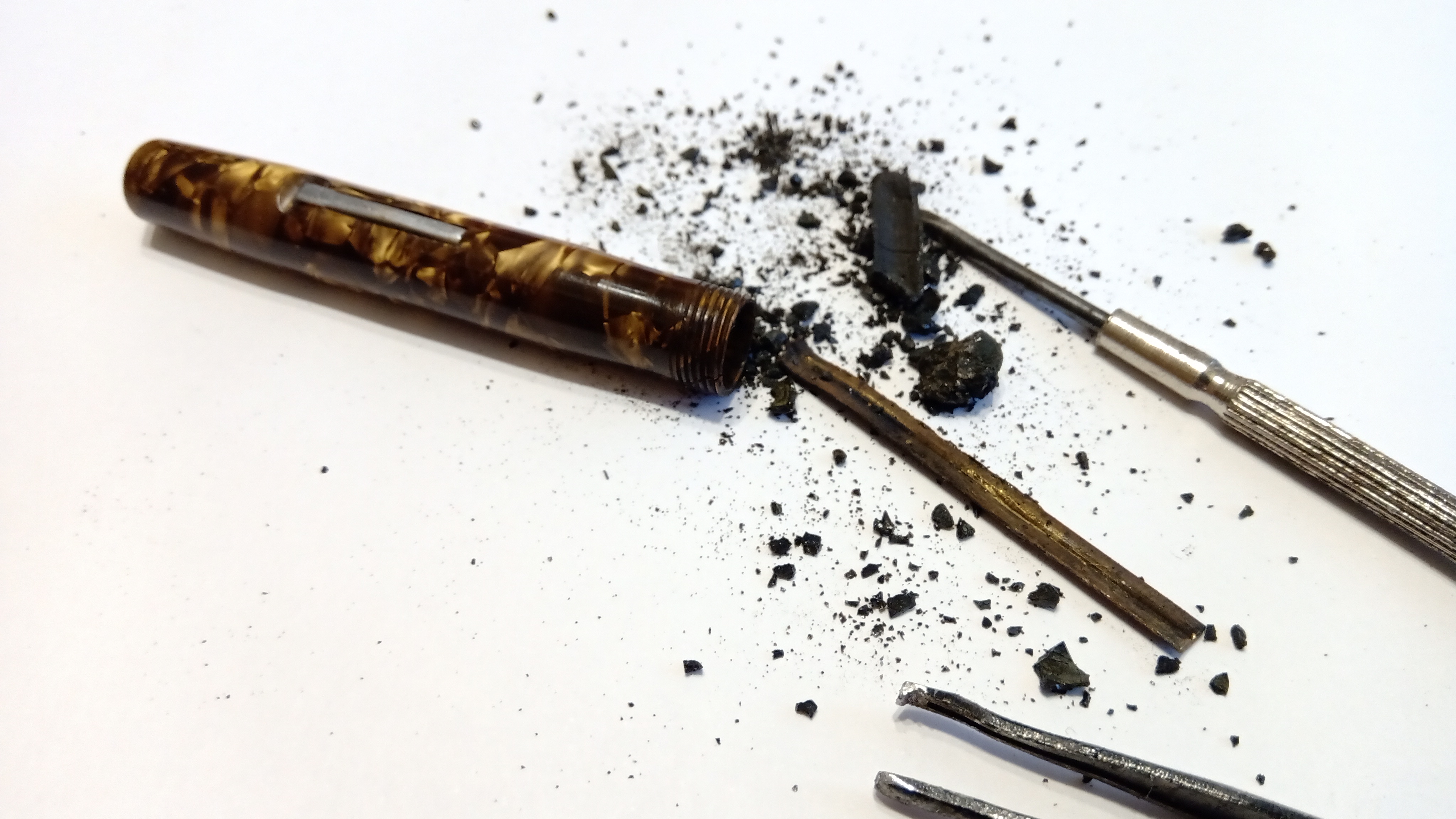 Emprendí entonces la limpieza del capuchón y barril comenzando por extraer de este último todos los residuos petrificados del saco de tinta y el fleje o patín de presión que estaba totalmente partido y corroído...