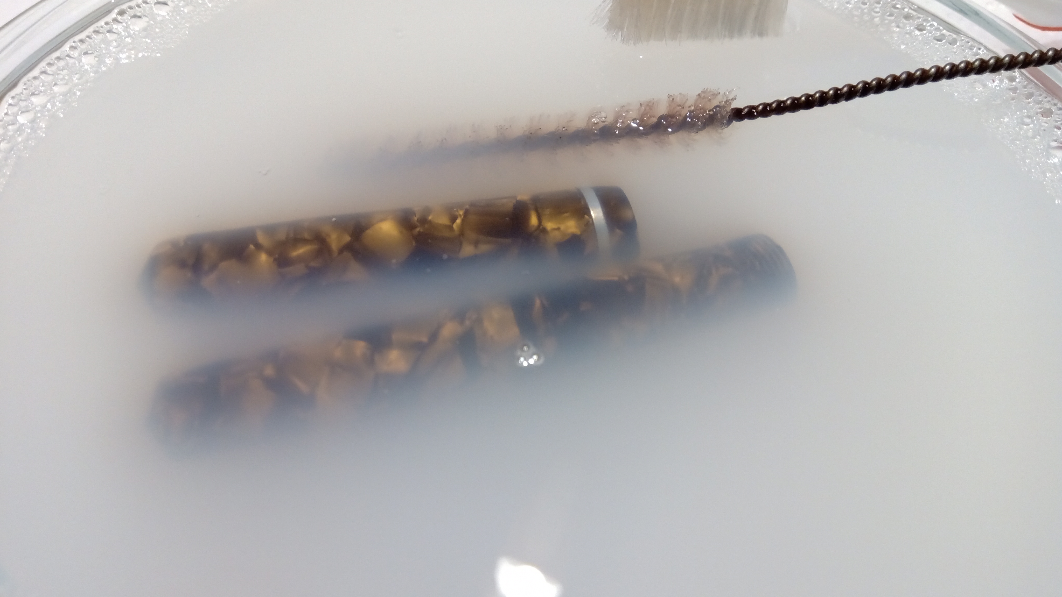 Ho continuato così con il gruppo impugnatura-pennino-alimentatore, lasciando il tutto immerso in una soluzione tensioattiva non anionica, innocua per i metalli e l'ebonite...