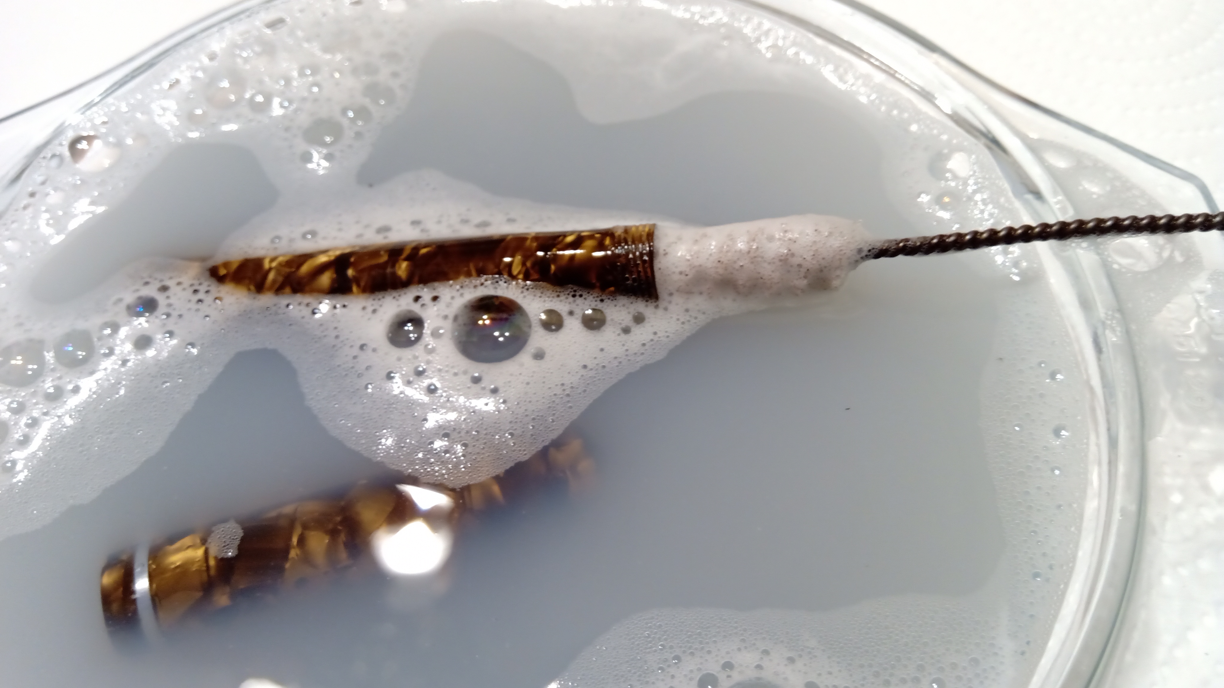 Este tubito había sido parte de una aerométrica de Parker que estaba bastante corroído en superficie, y reunía varias condiciones ideales.