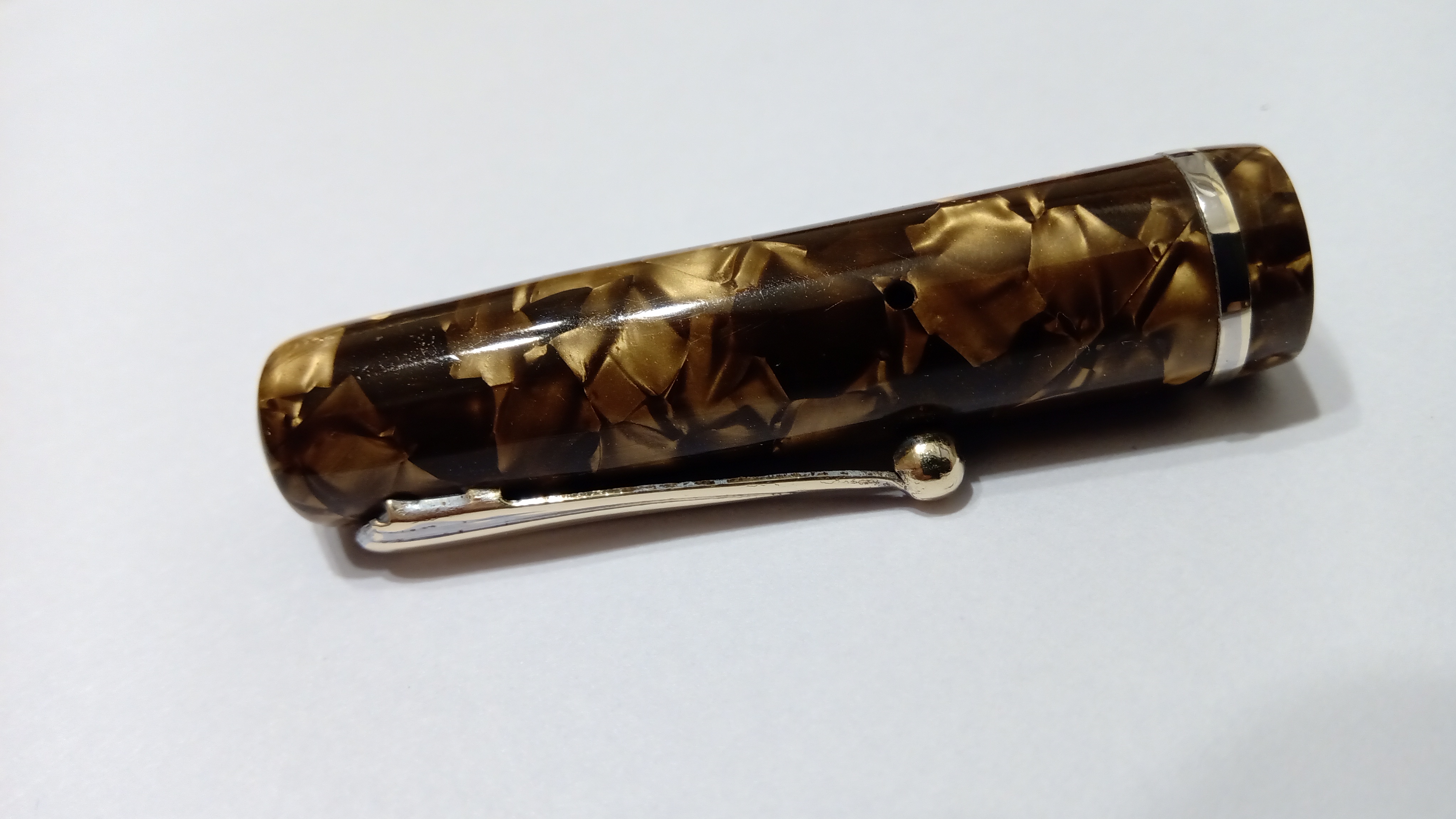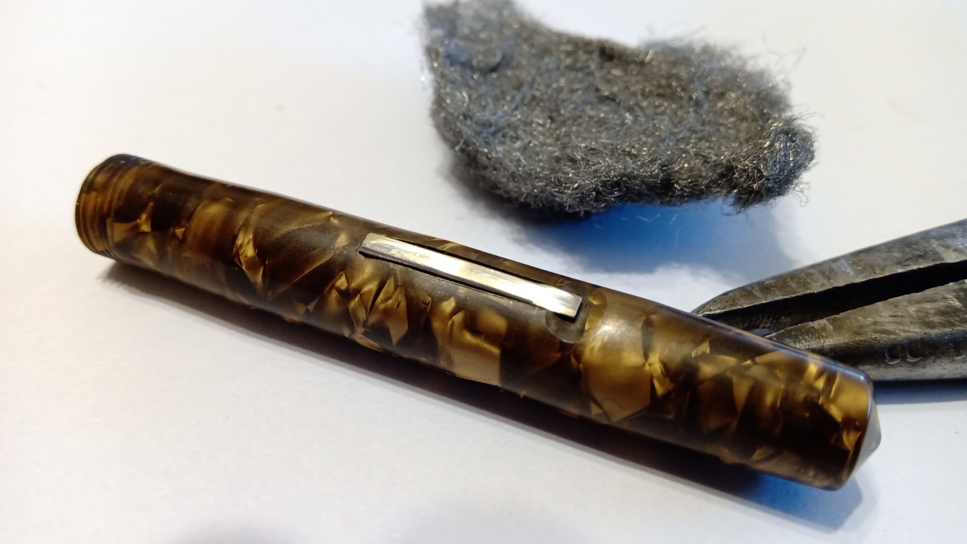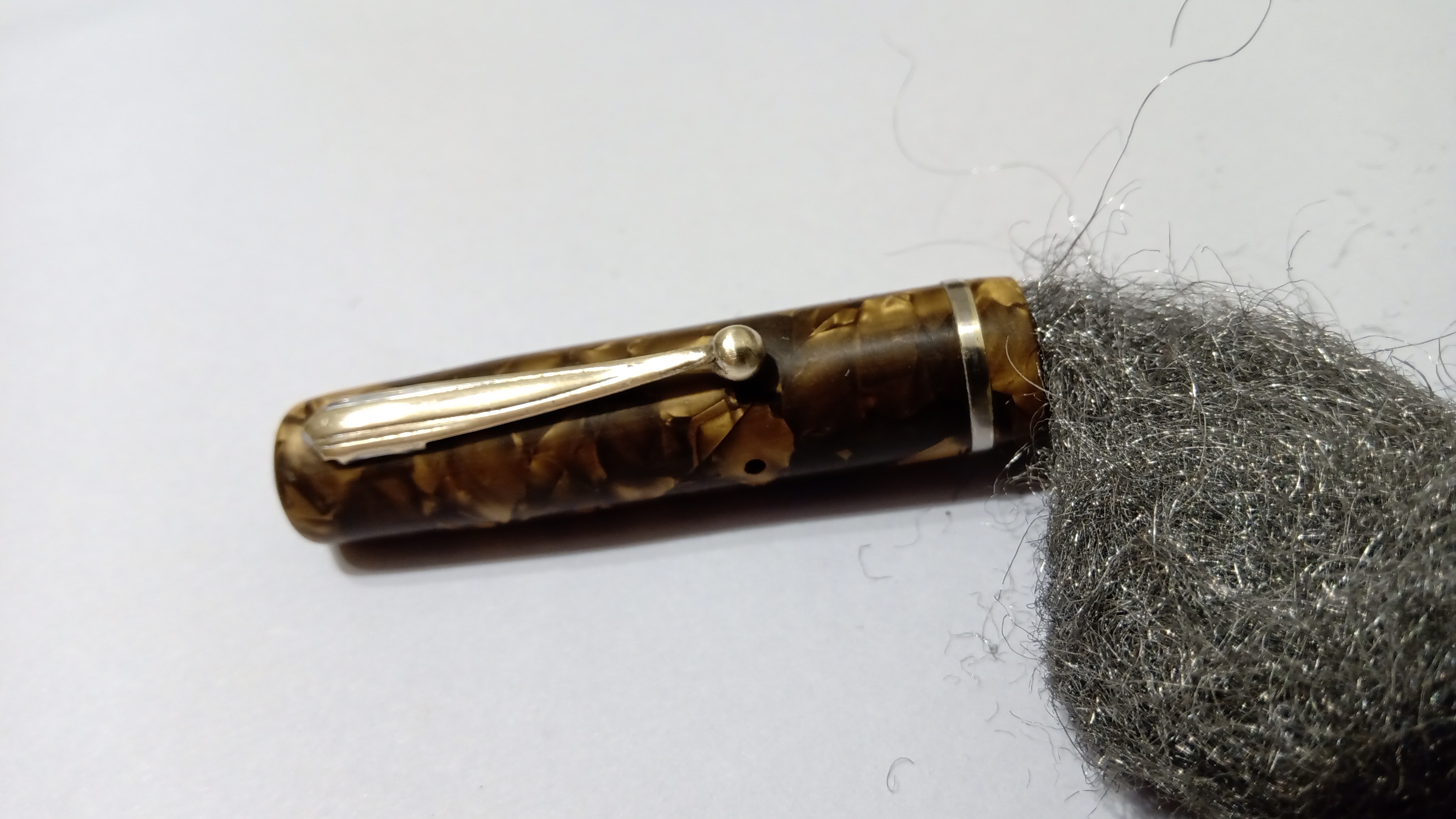 Ho quindi pulito sia il fusto che il cappuccio con un detergente neutro diluito al 50%, ma per precauzione ho dato una leggera levigata al cappuccio per verificare che il materiale fosse celluloide, e in effetti ha sprigionato quel piacevole e coinvolgente aroma di canfora...