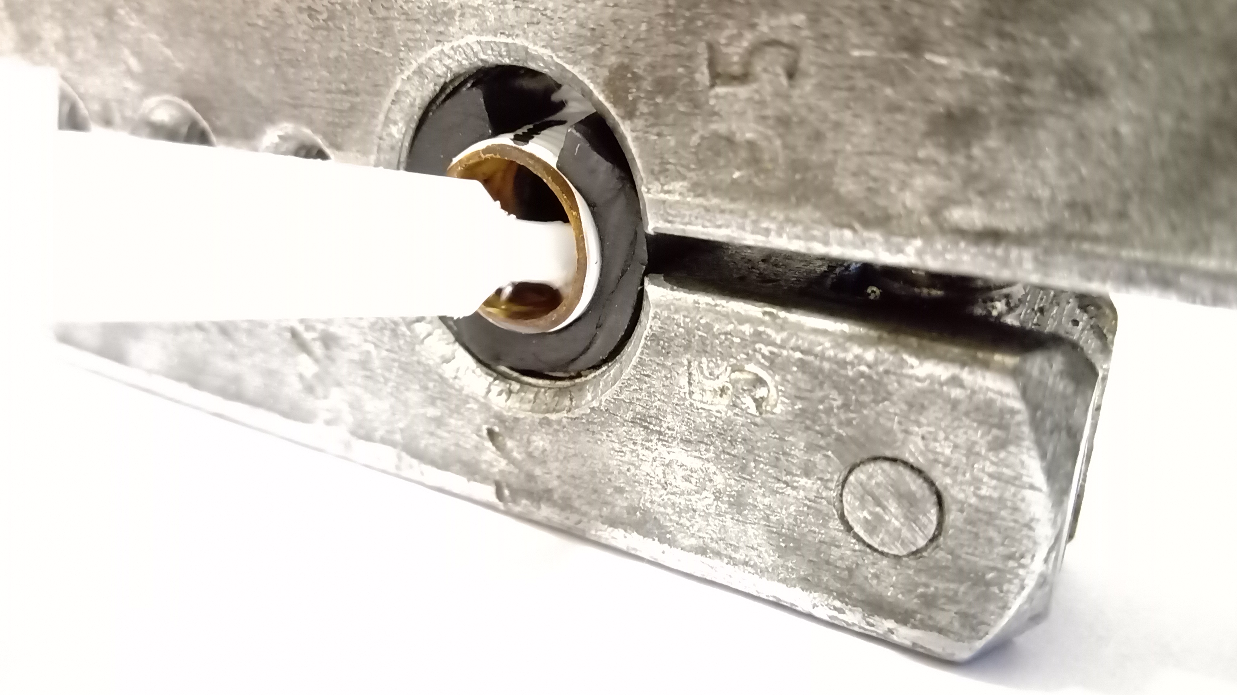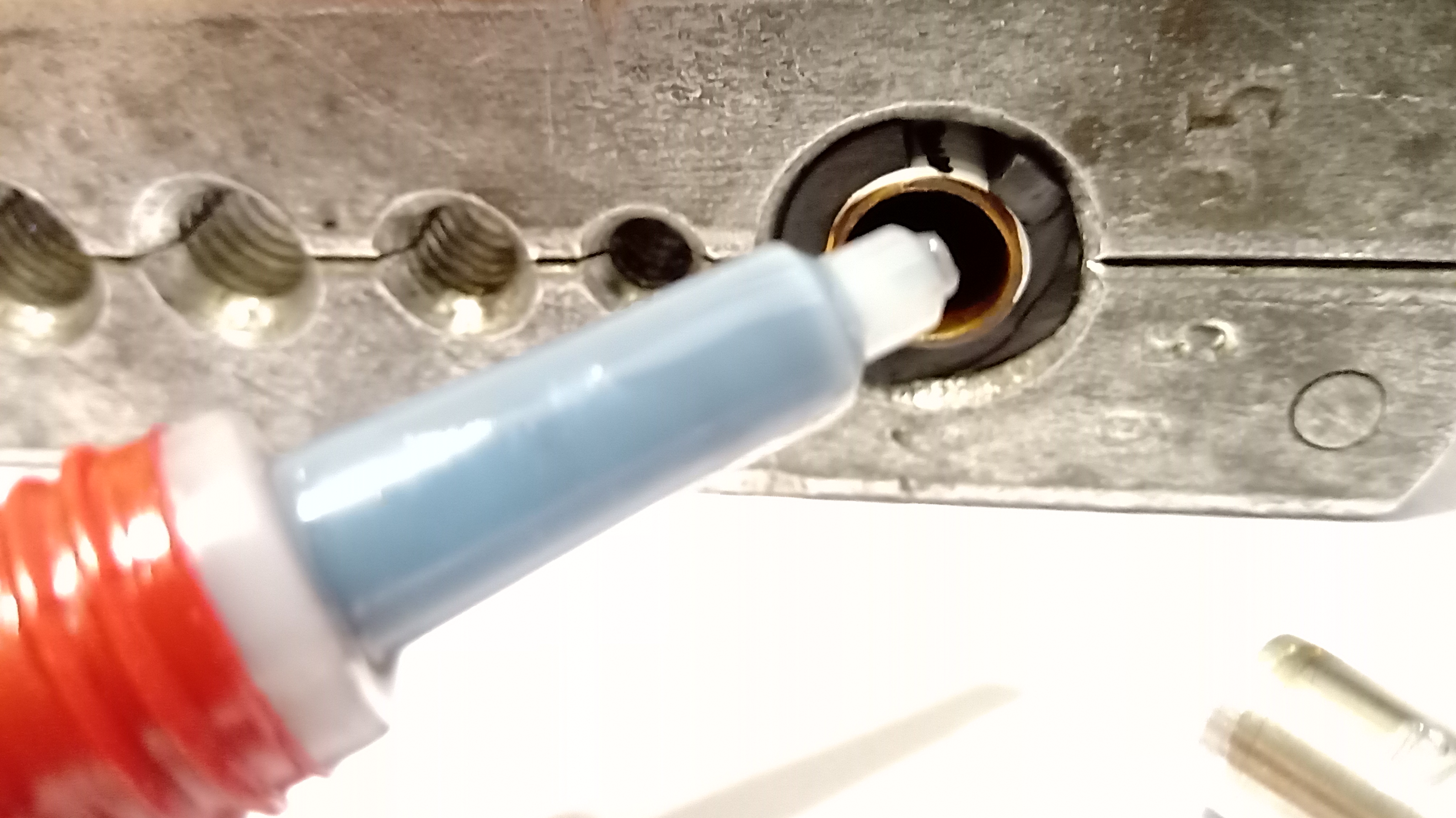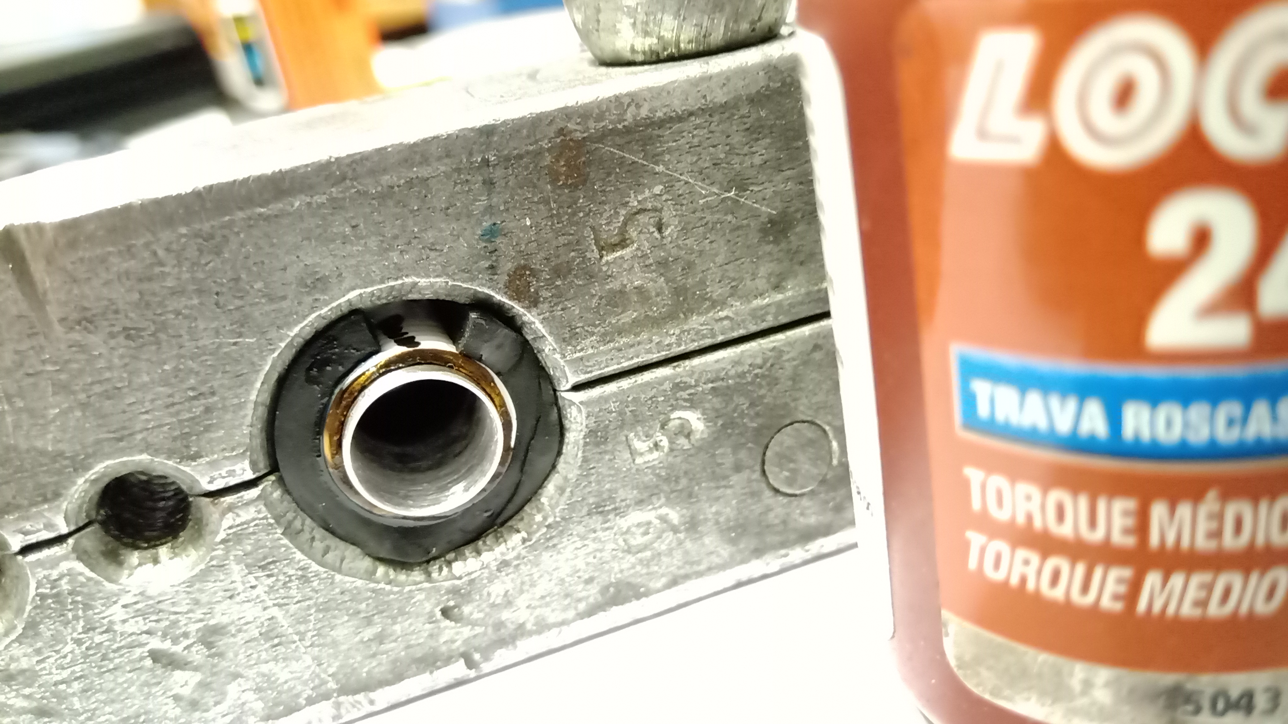 Dopo alcuni minuti, senza allentare la morsa, ho impregnato tutto il contorno interno dell'ingresso del fusto con un cianoacrilato molto meno aggressivo, il Loctite 243, normalmente utilizzato per il fissaggio di filettature a coppia media...
