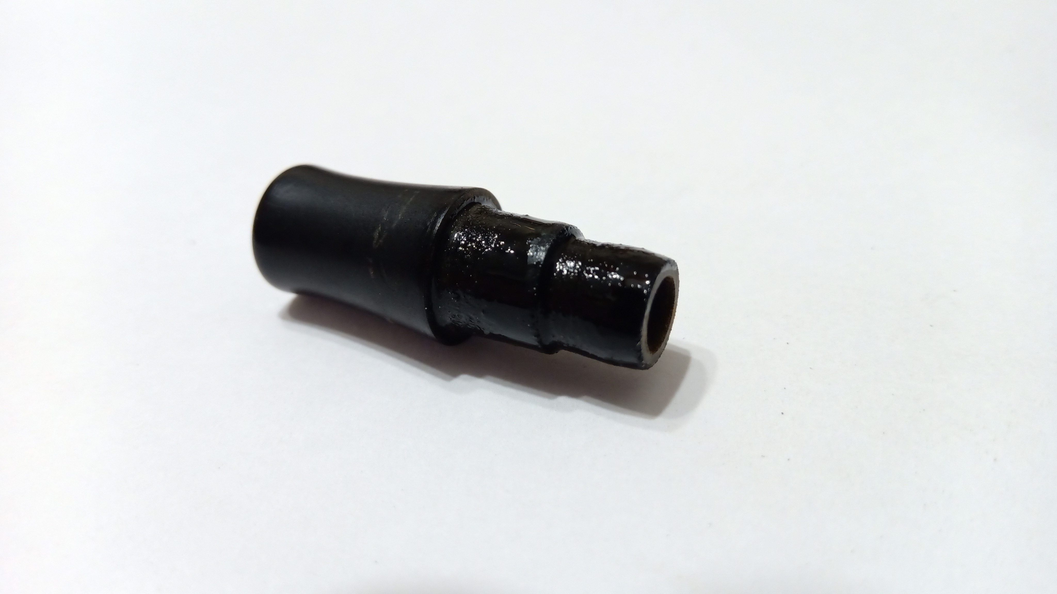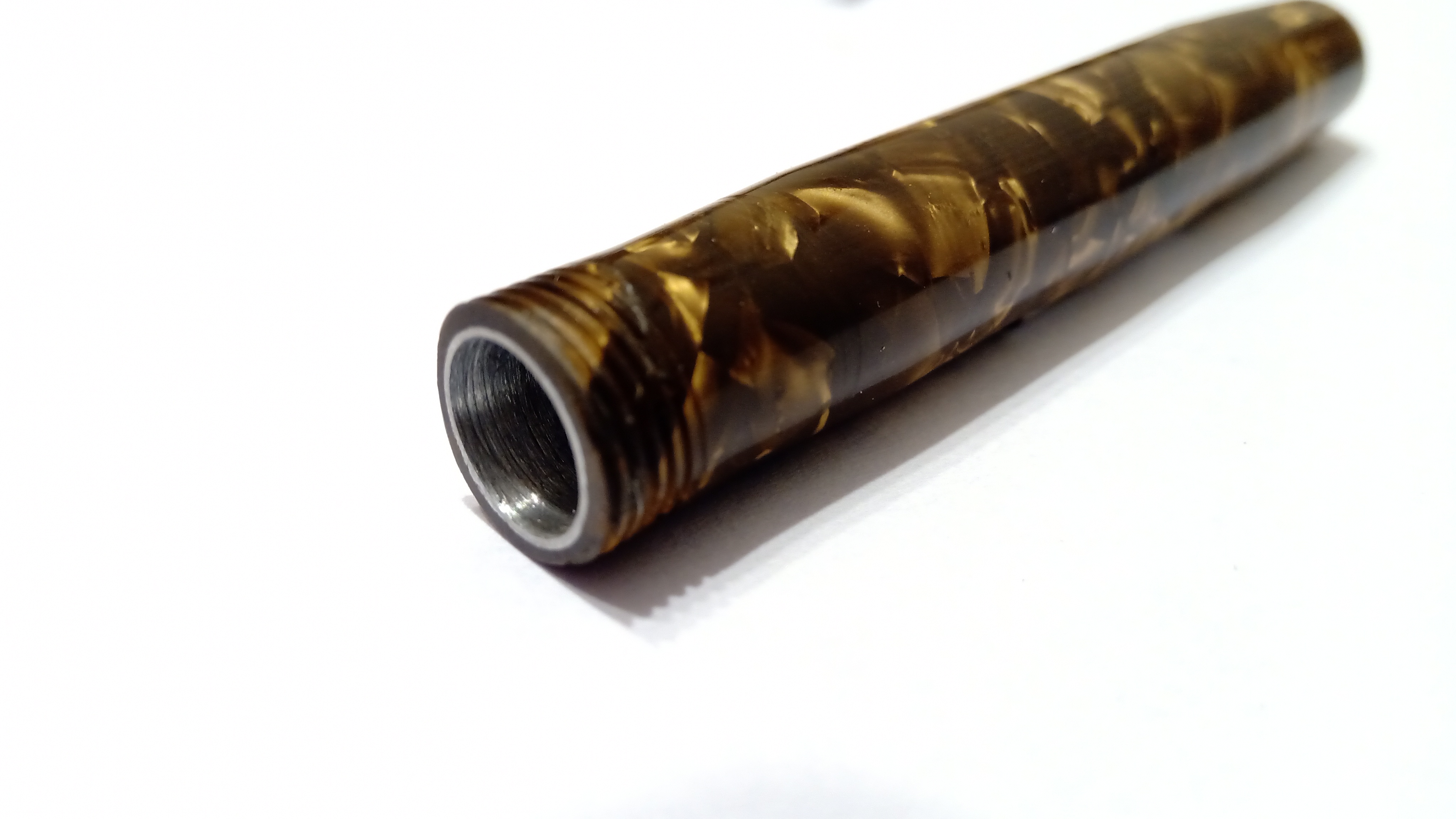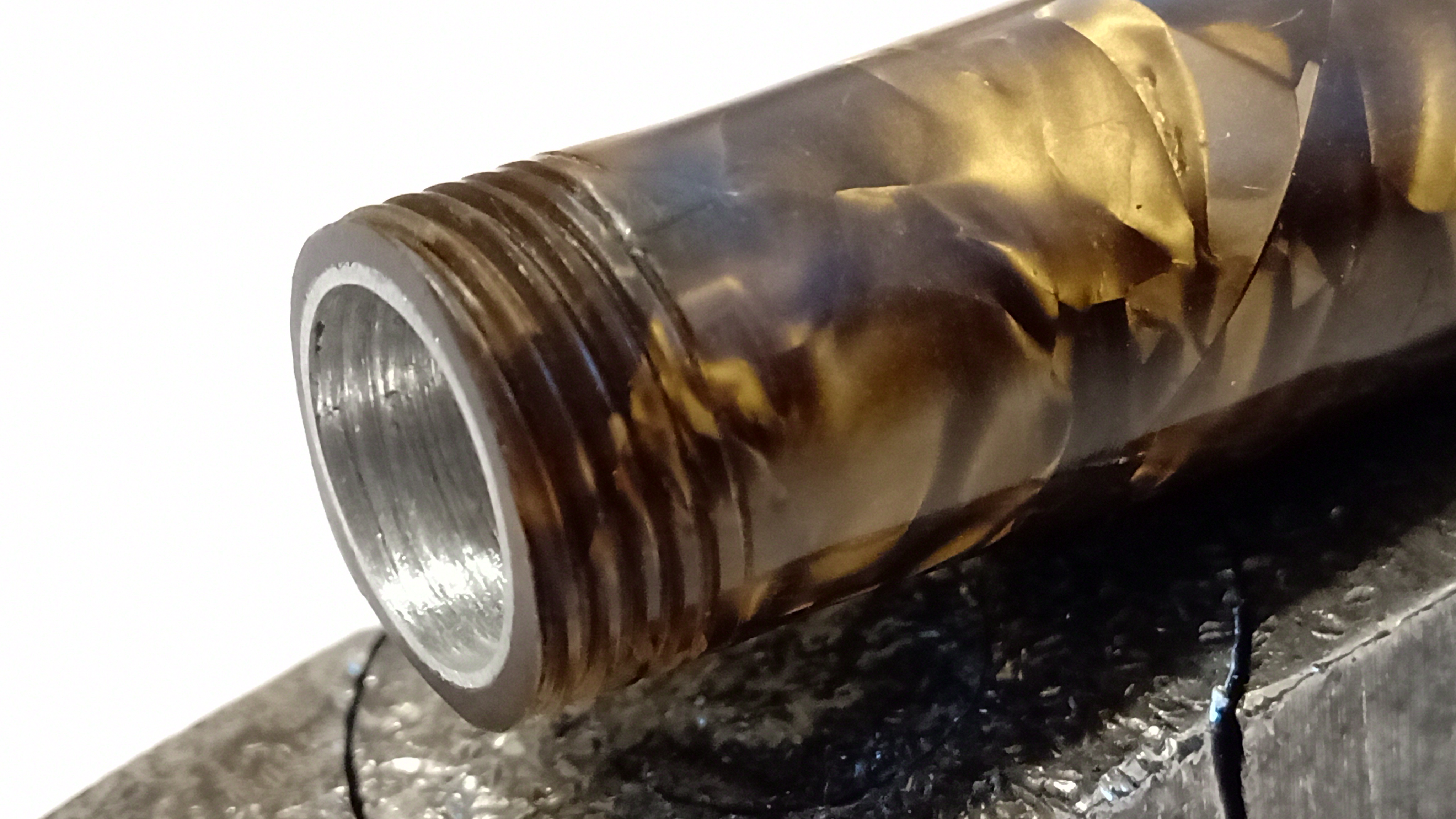Llegó entonces el momento del barril. Creo teniendo en cuenta la debilidad de la pieza en donde estaba la quebradura, sumado a la rosca, y a que siempre el grip allí encajado estaría expandiendo y forzando como una palanca, no sería el sólo volver a fusionar el celuloide una solución viable, o por lo menos duradera. Tarde o temprano seguramente se volvería a rajar, sino por el mismo lugar, tal vez por otro. Pensé entonces en colocar un encamisado interno de refuerzo en la zona de encaje y más un poco.