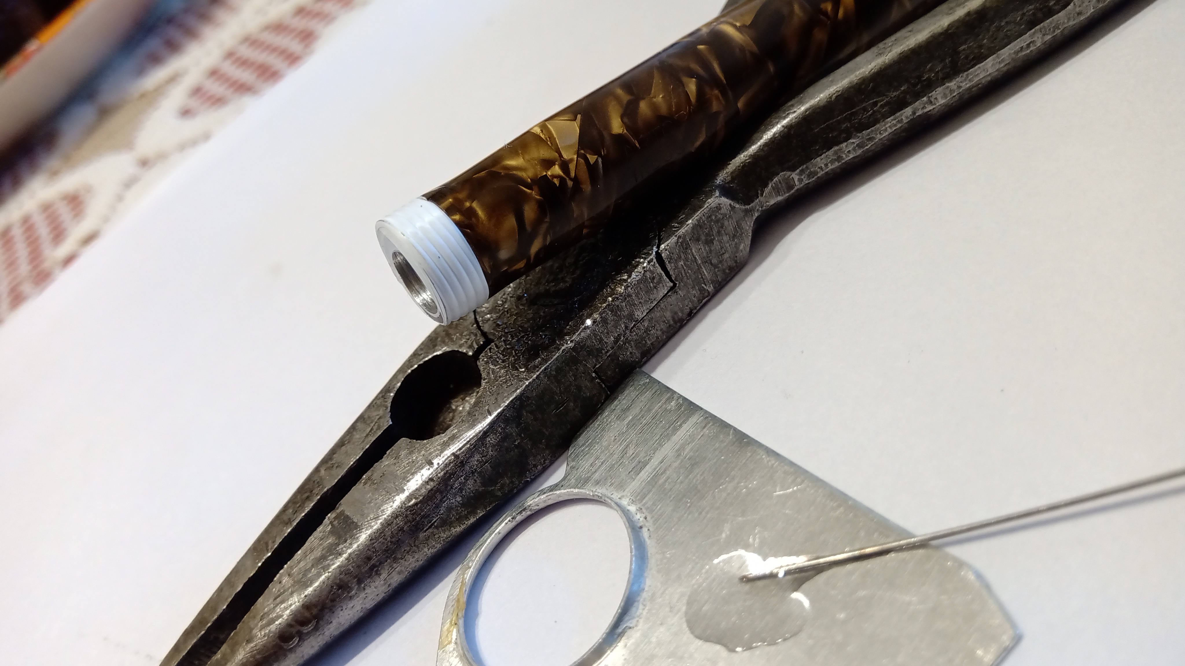 La idea fue entonces, colocar por dentro de la entrada del barril cianoacrilato líquido, que el mismo penetrara en la grieta, que diluyera y fusionara el celuloide, y que no invadiera la rosca.