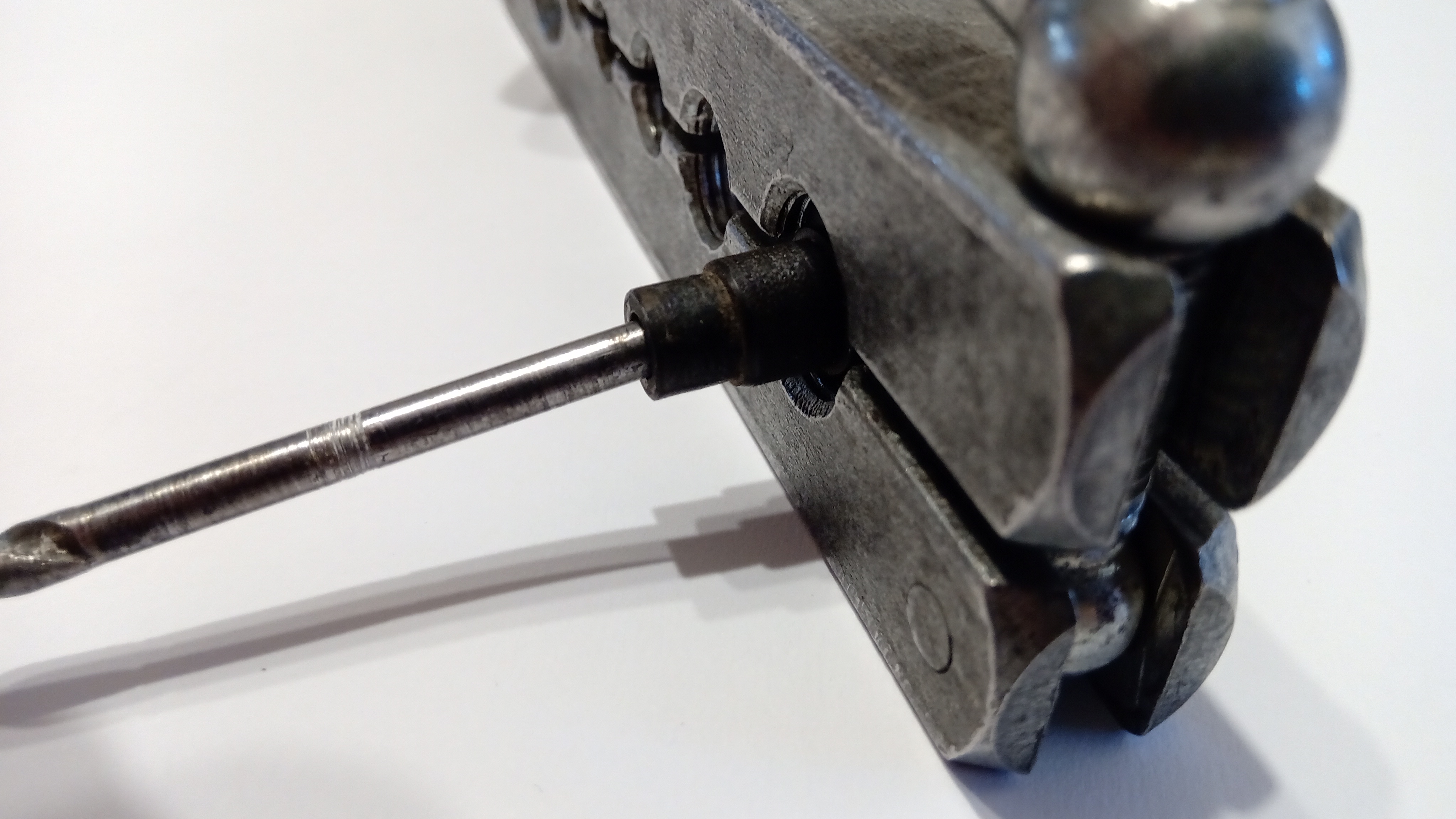 Una volta pulito il tutto, ho proceduto a posizionarlo nella morsa a sede cilindrica protetta con gomma, dove con una bacchetta di acciaio e alcuni colpi secchi ho estratto l'alimentatore e il pennino...