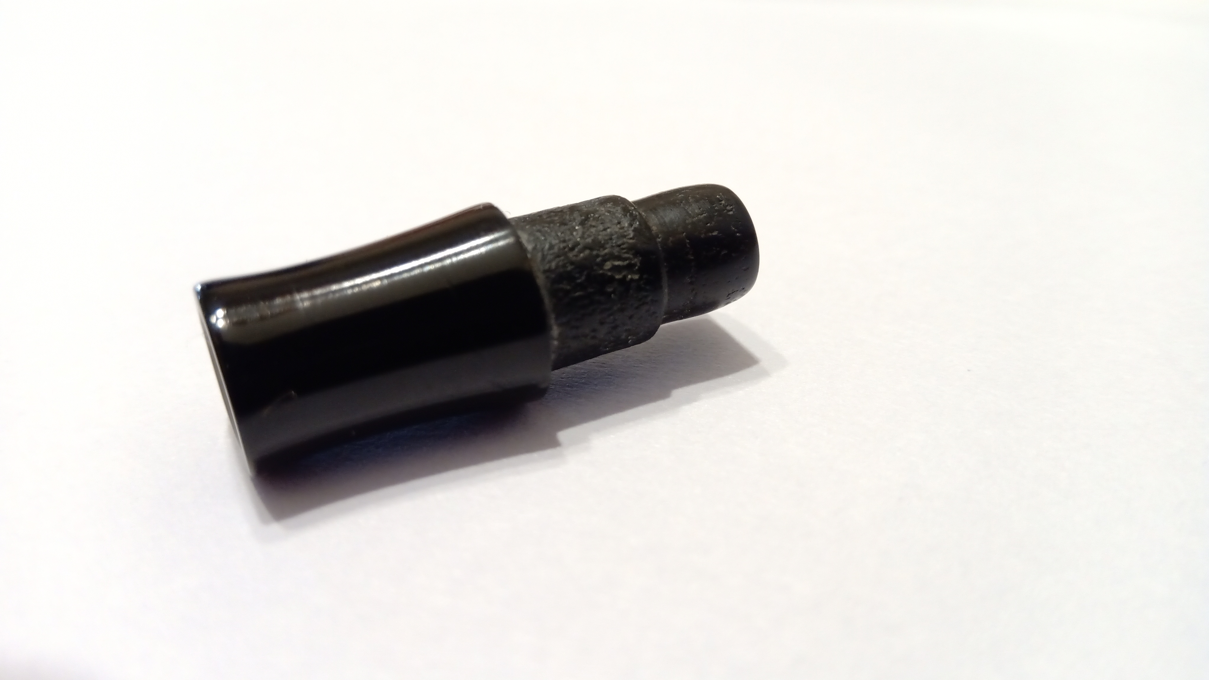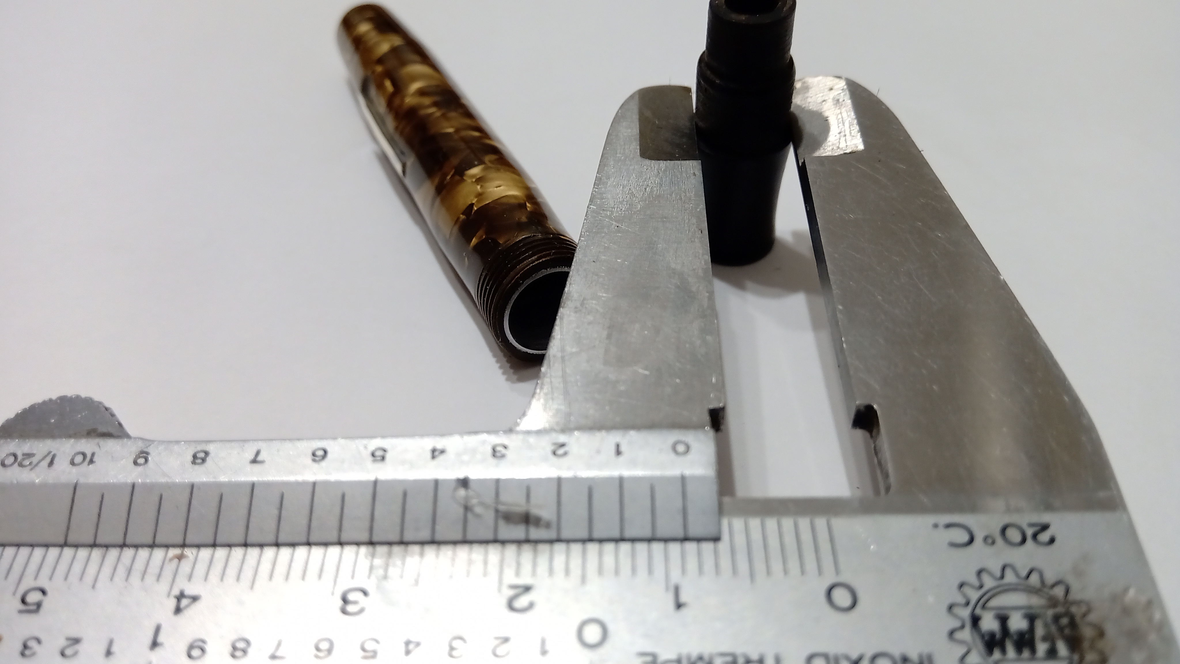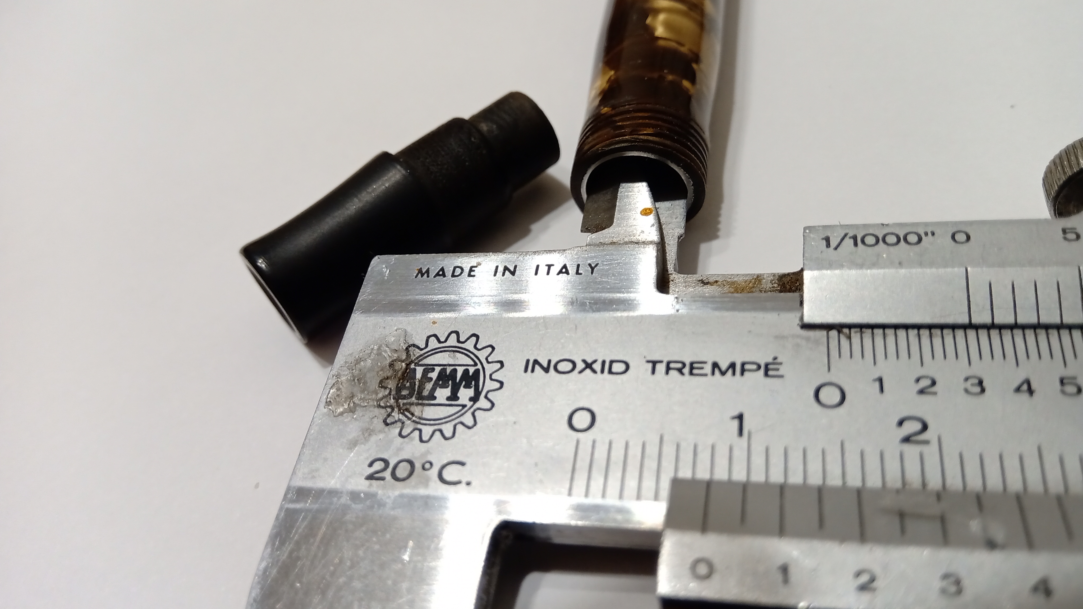 e poi ho iniziato a ridurre il diametro della sede del sacchetto dell'inchiostro, cercando di limare il meno possibile, per non danneggiare l'estremità dell'impugnatura, ma lasciando spazio sufficiente affinché il sacchetto potesse inserirsi senza incepparsi nel nuovo ingresso del fusto...