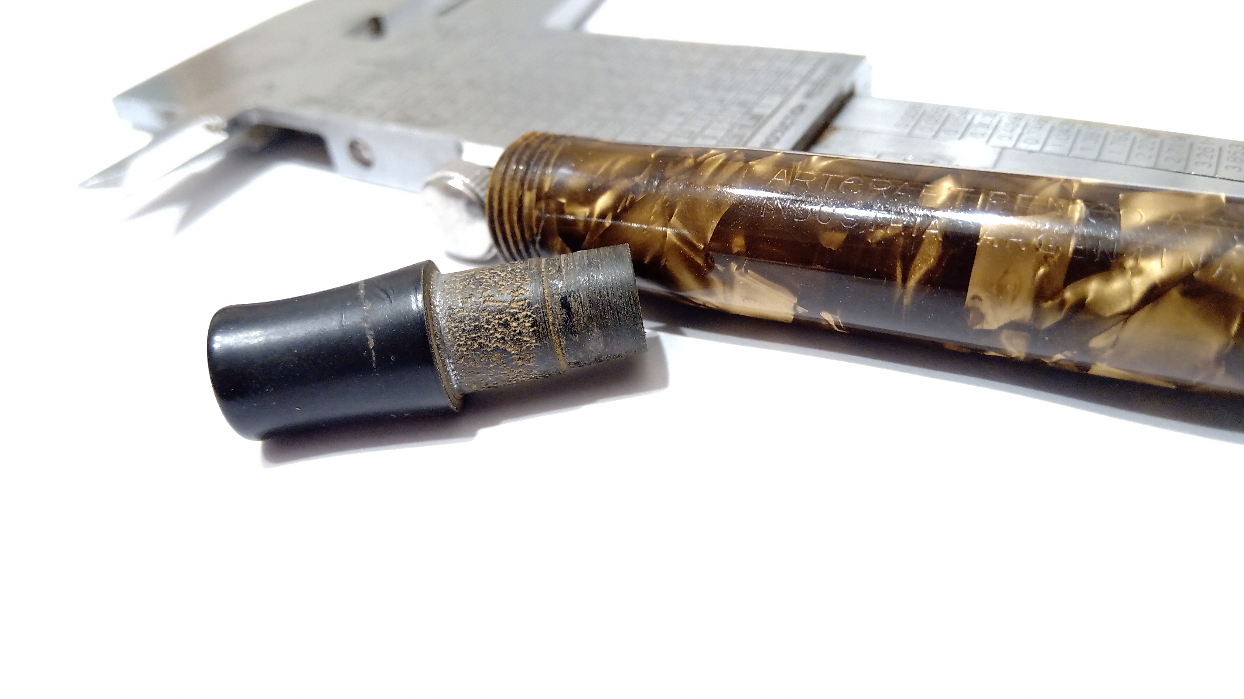 Il problema principale, che avrebbe richiesto un lavoro interessante, era l'incastro a pressione dell'impugnatura nel fusto, dove si era formata una profonda crepa, forse causata dalla diversa deformazione dei materiali, che comprometteva non solo la struttura del fusto, ma anche la sua funzionalità per scrivere e persino per avvitare il cappuccio...