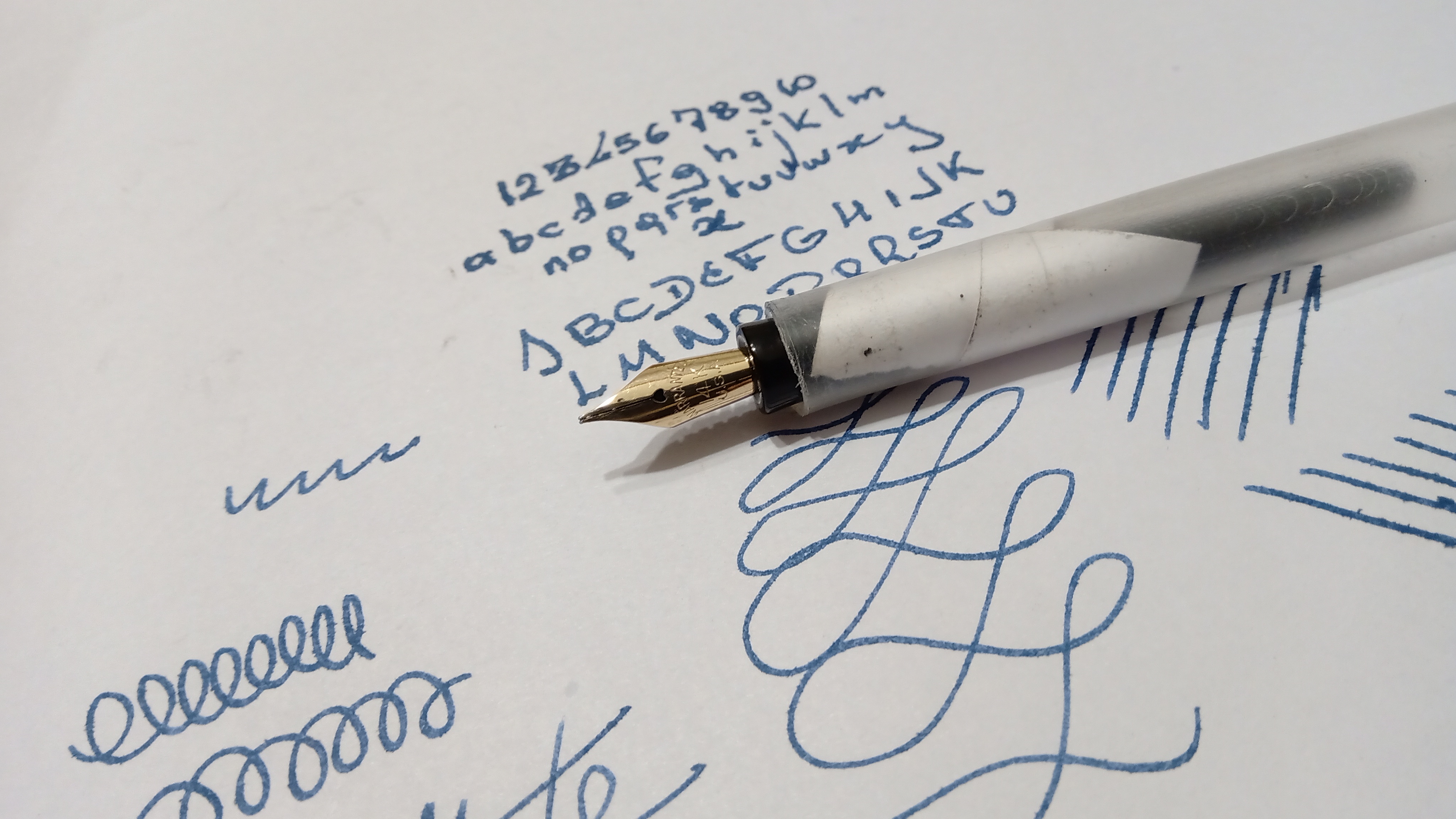 Devo dire, a titolo di precisazione, che mi ci è voluto parecchio tempo per ottenere una scrittura accettabilmente morbida e fluida, sia su carta da lavoro che su carta patinata, ma dopo diversi tentativi di estrarre e reinserire l'alimentatore con il pennino a diverse profondità (l'apertura finale varia tra i diversi pennini), raddrizzare l'alimentatore con il calore per ottenere un buon contatto con il pennino e scrivere più volte e in diverse posizioni su carta smerigliata grana 2000 per ammorbidire gli iridii, ho ritenuto di aver raggiunto l'obiettivo desiderato...