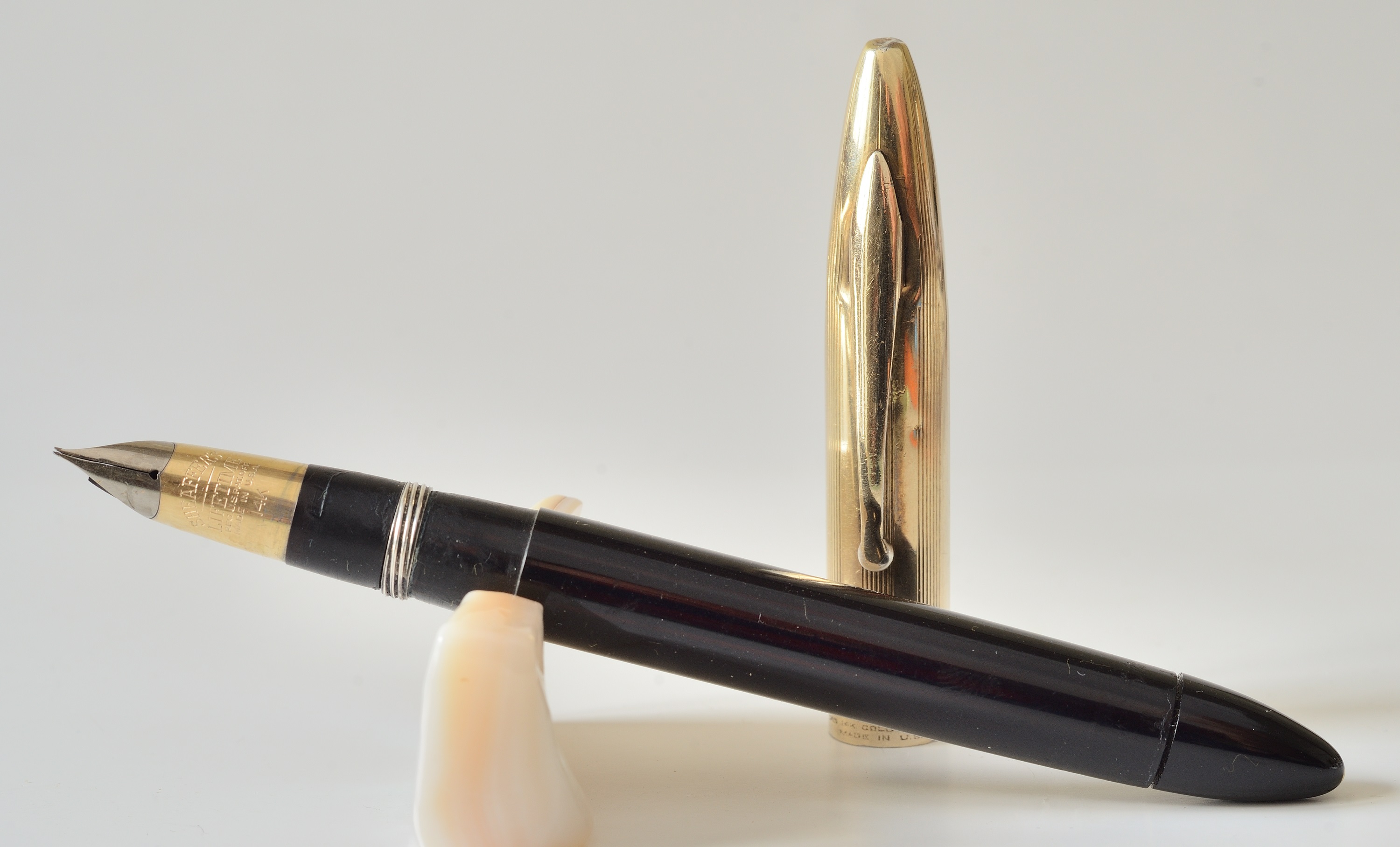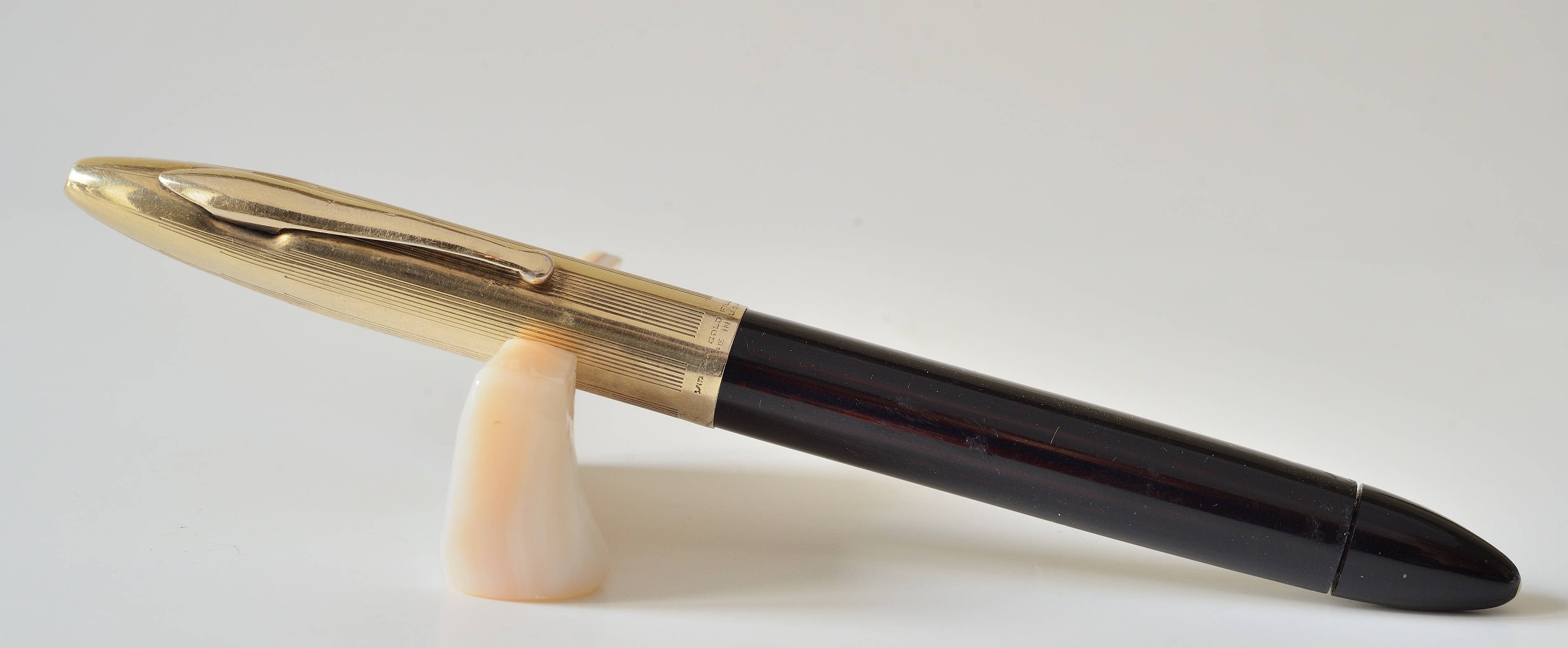 La seconda è una Sheaffer's, cappuccio laminato in oro, corpo in celluloide semitrasparente rossastra, pennino