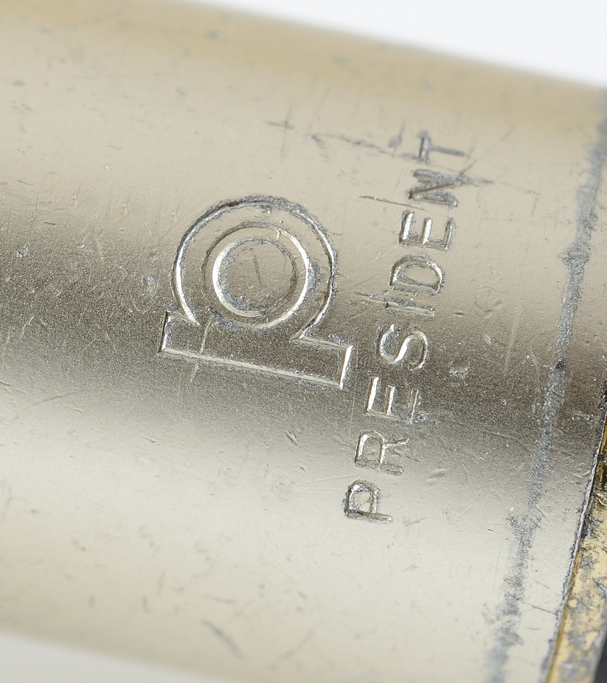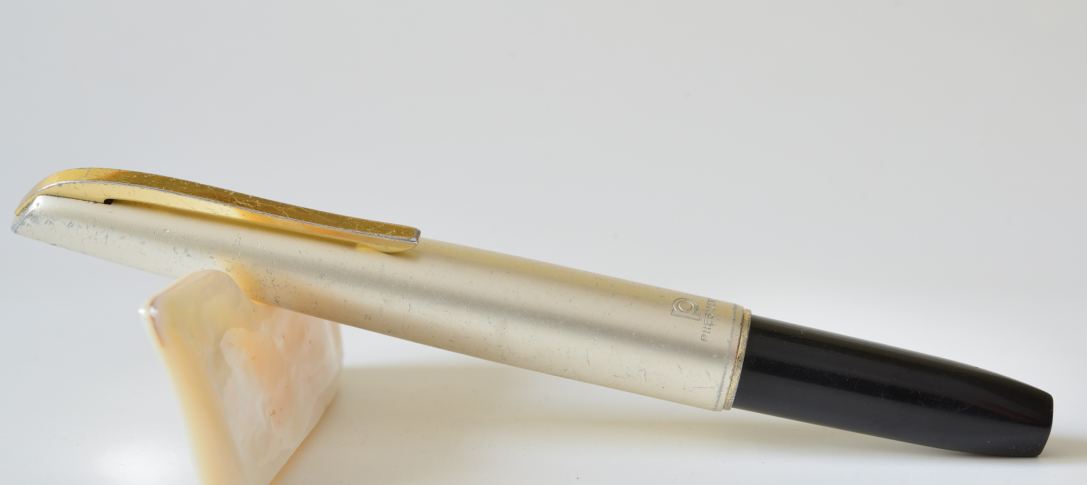 con attacco proprietario Platinum (è presente una cartuccia con quell'attacco compresa sferetta d'acciaio all'interno), clip con molla sommitale che permette una ampia apertura e tiene ben fermo l'aggancio. Pennino in oro 14 K con incisa la P della Platinum, alimentatore in plastica, di uno strano colore azzurrino. Stessa P incisa anche al bordo del cappuccio dove compare, però, la scritta PRESIDENT. Che roba è???