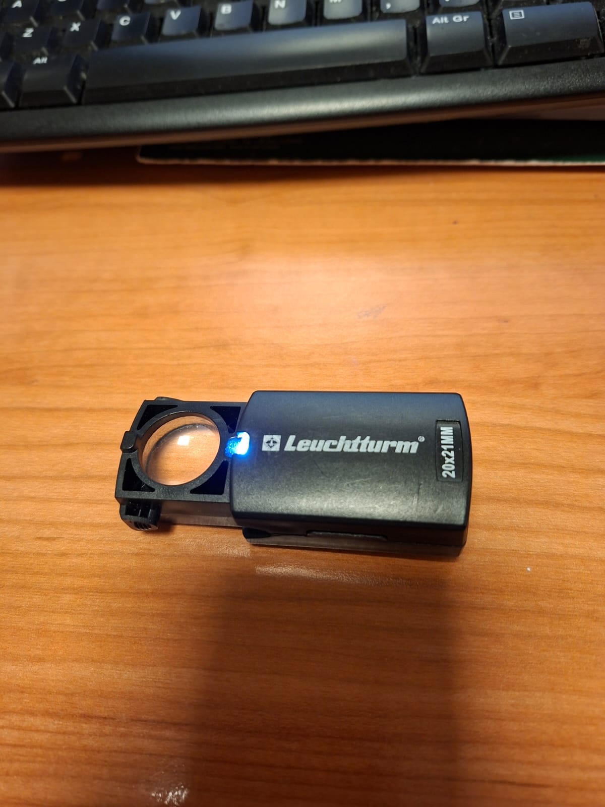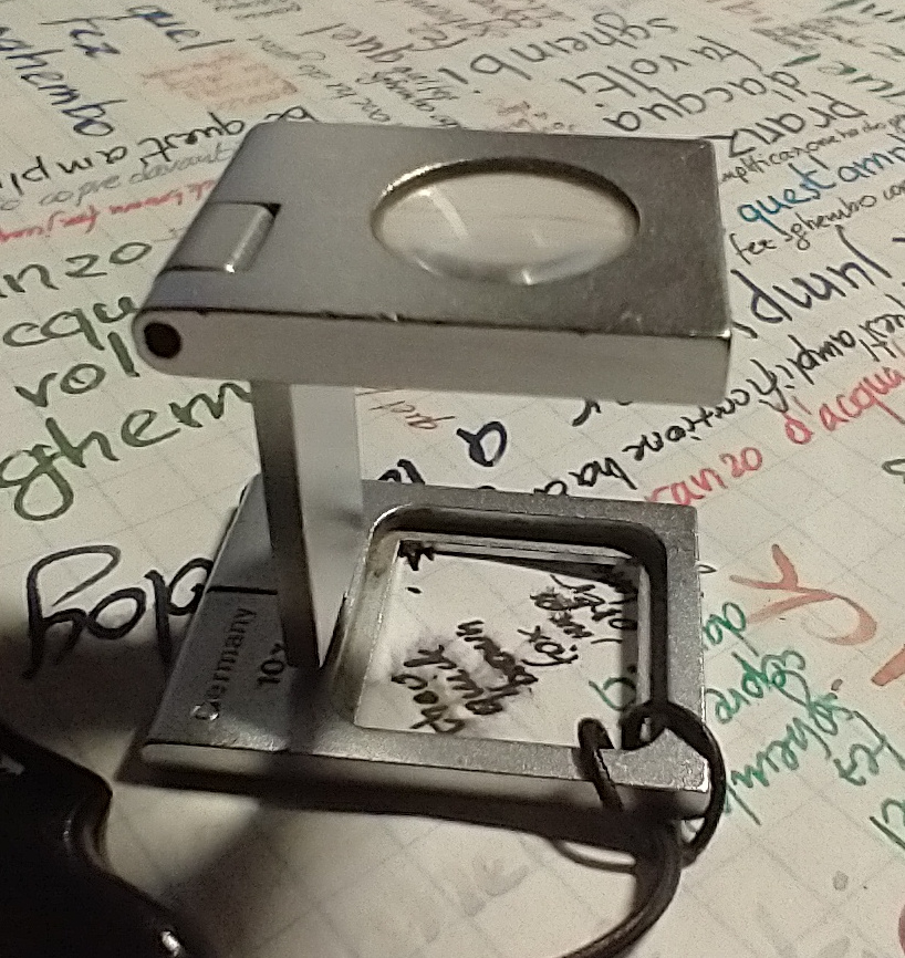 Ho dimenticato la lente... ma un collezionista mi ha prestato la sua... era una lente tascabile richiudibile nella custodia di almeno 10 cm di diametro e 2 cm di spessore.