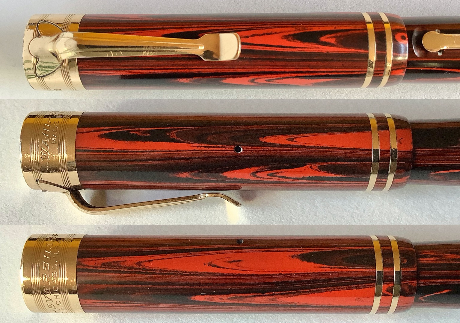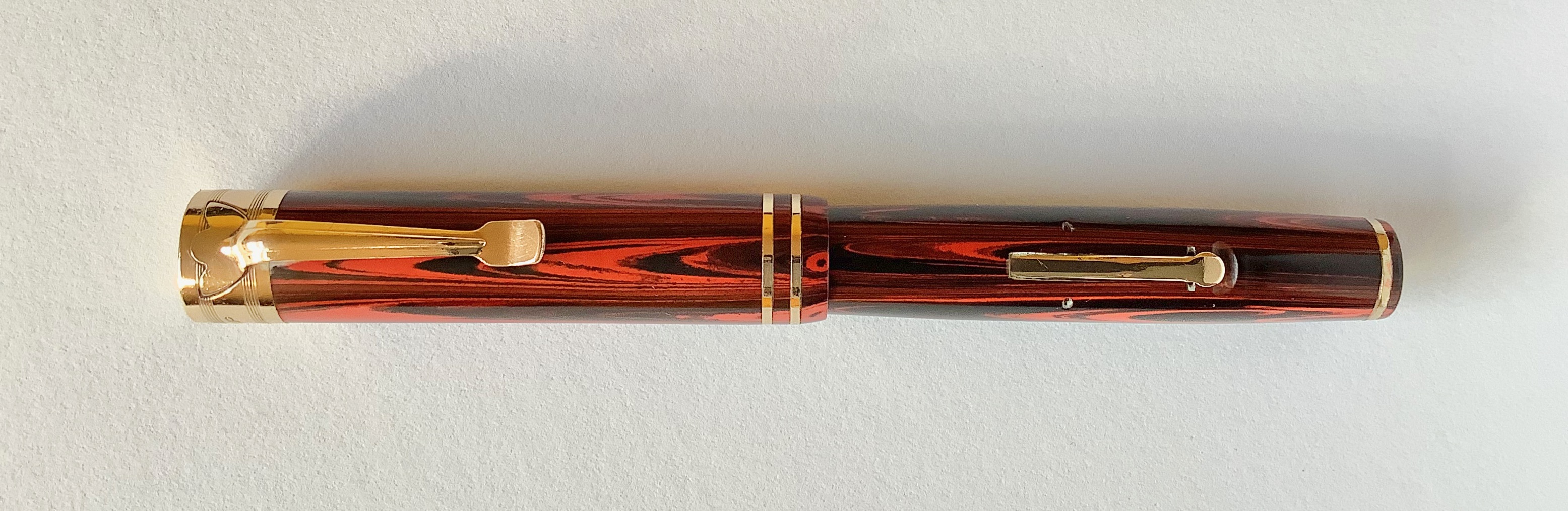 Penna in ebanite, come dicevo, con l'anima in metallo per aumentarne la robustezza. Levetta con il classico sistema di fermo adottato dalla casa di Chicago in tutte le sue penne. D'effetto la lucidatura della sommità della testina del cappuccio.