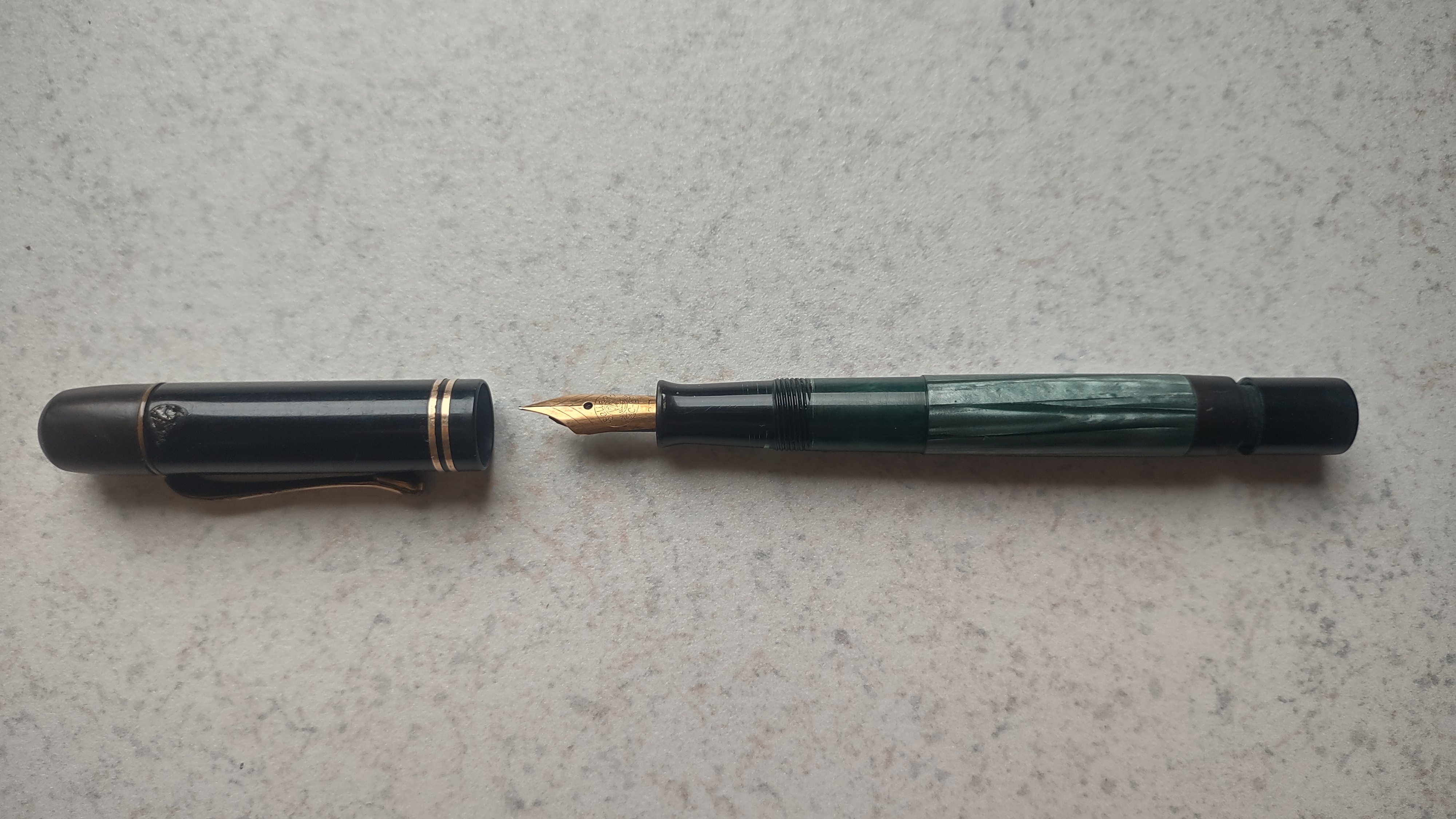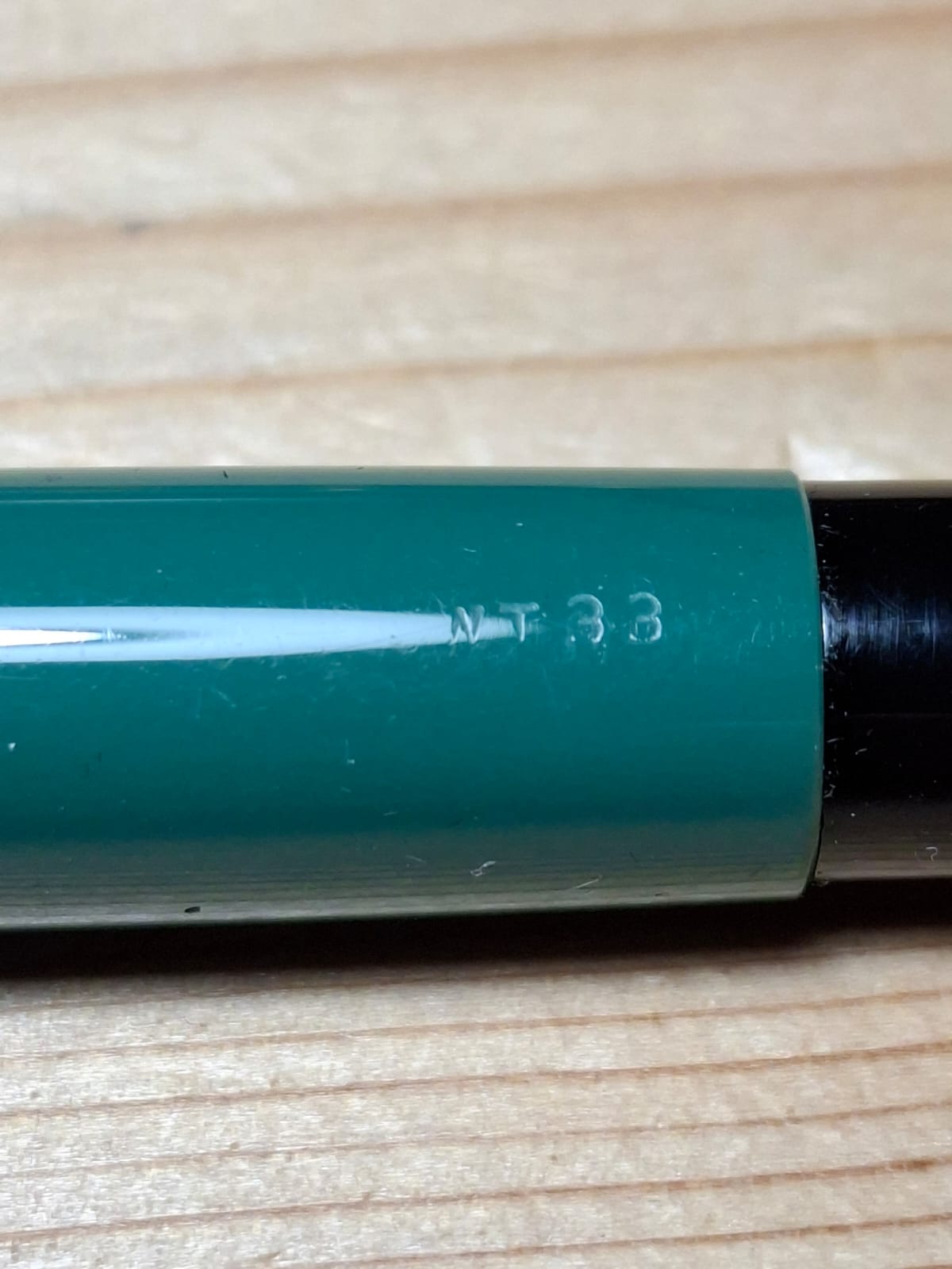 Però non sono affatto convinto che tutti i pezzi della penna siano coevi: la testa del cappuccio è in ebanite, con il logo ad otto pulli, ma il corpo è in celluloide; la penna è marchiata "export"; il pennino è del tipo nuovo, ad albero di natale. Avrei detto che il pennino è stato sostituito da una 100N, se non avessi trovato notizia che i pennini delle 100 e delle 100N non sono compatibili.