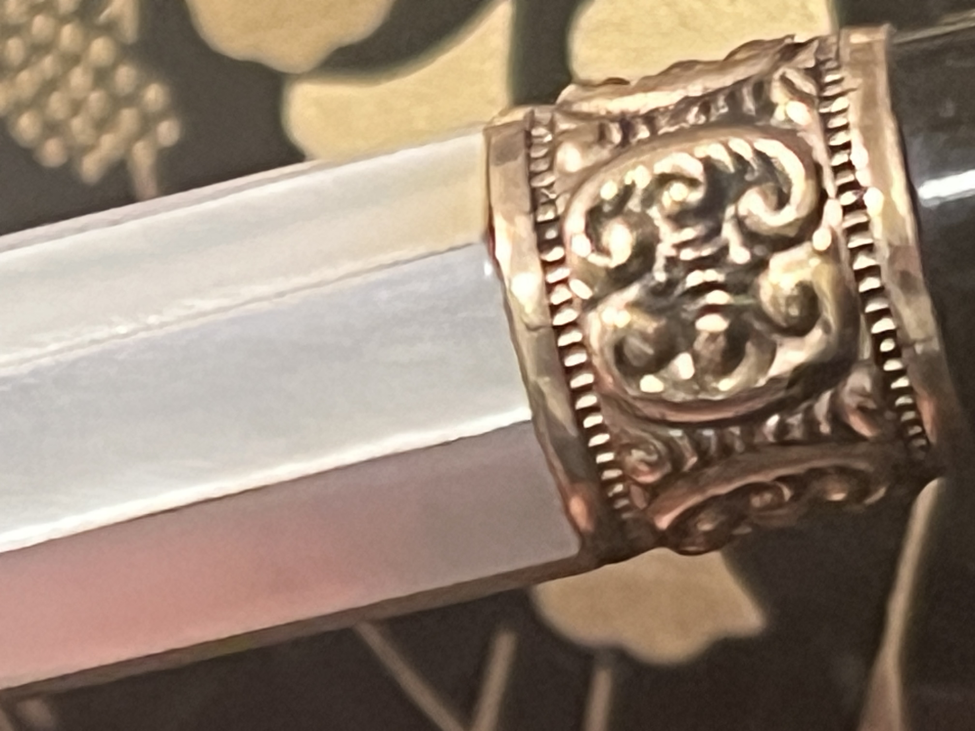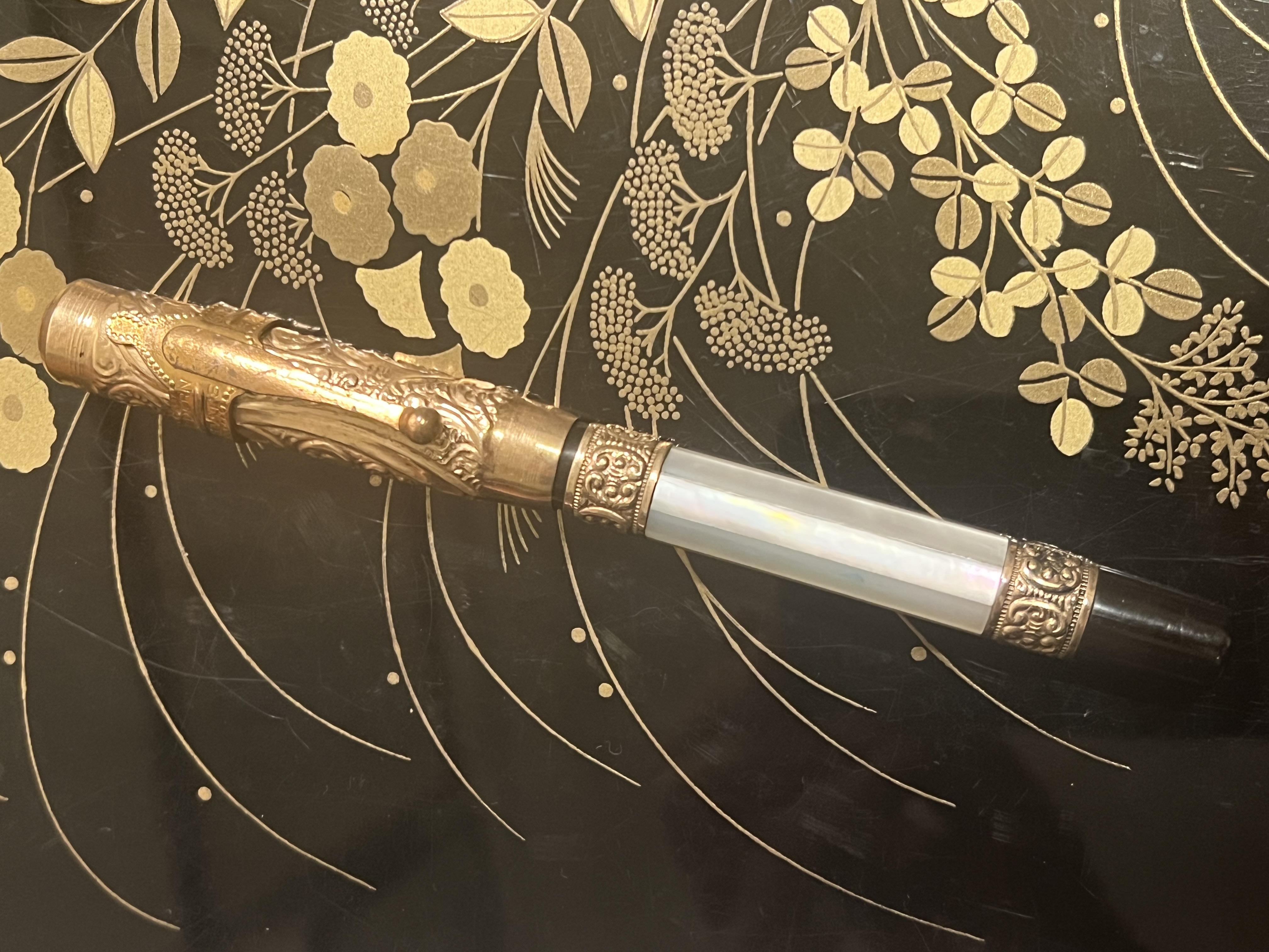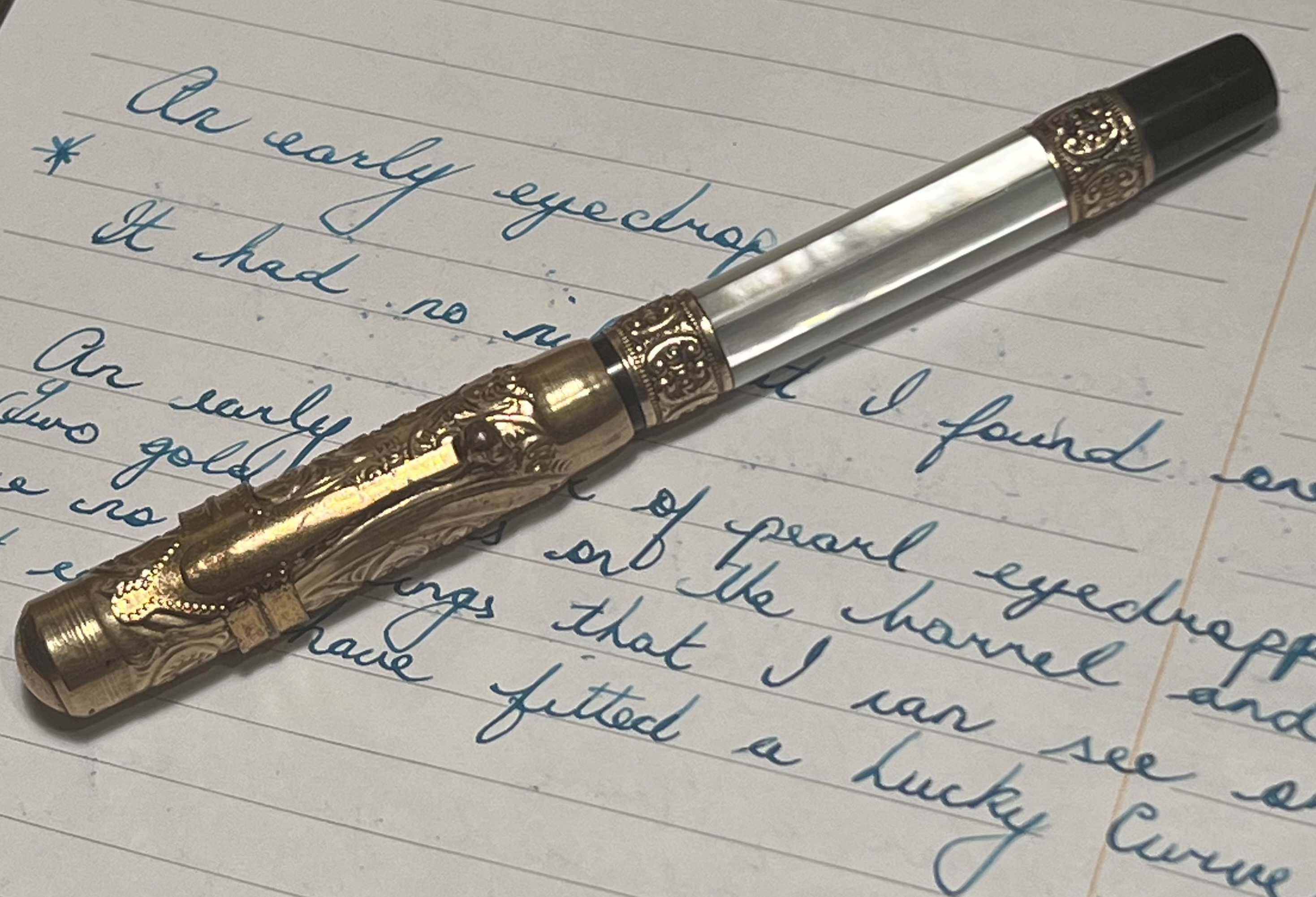 Buonasera, ecco alcune fotografie della mia ultima penna. È una penna stilografica in madreperla senza marchio del produttore, per quanto posso vedere. Non ho idea di chi l'abbia realizzata, ma è una penna bellissima. Non aveva il pennino, quindi ho montato un pennino Parker Lucky Curve e scrive molto bene. Qualsiasi aiuto per identificarla sarebbe molto apprezzato. Grazie.