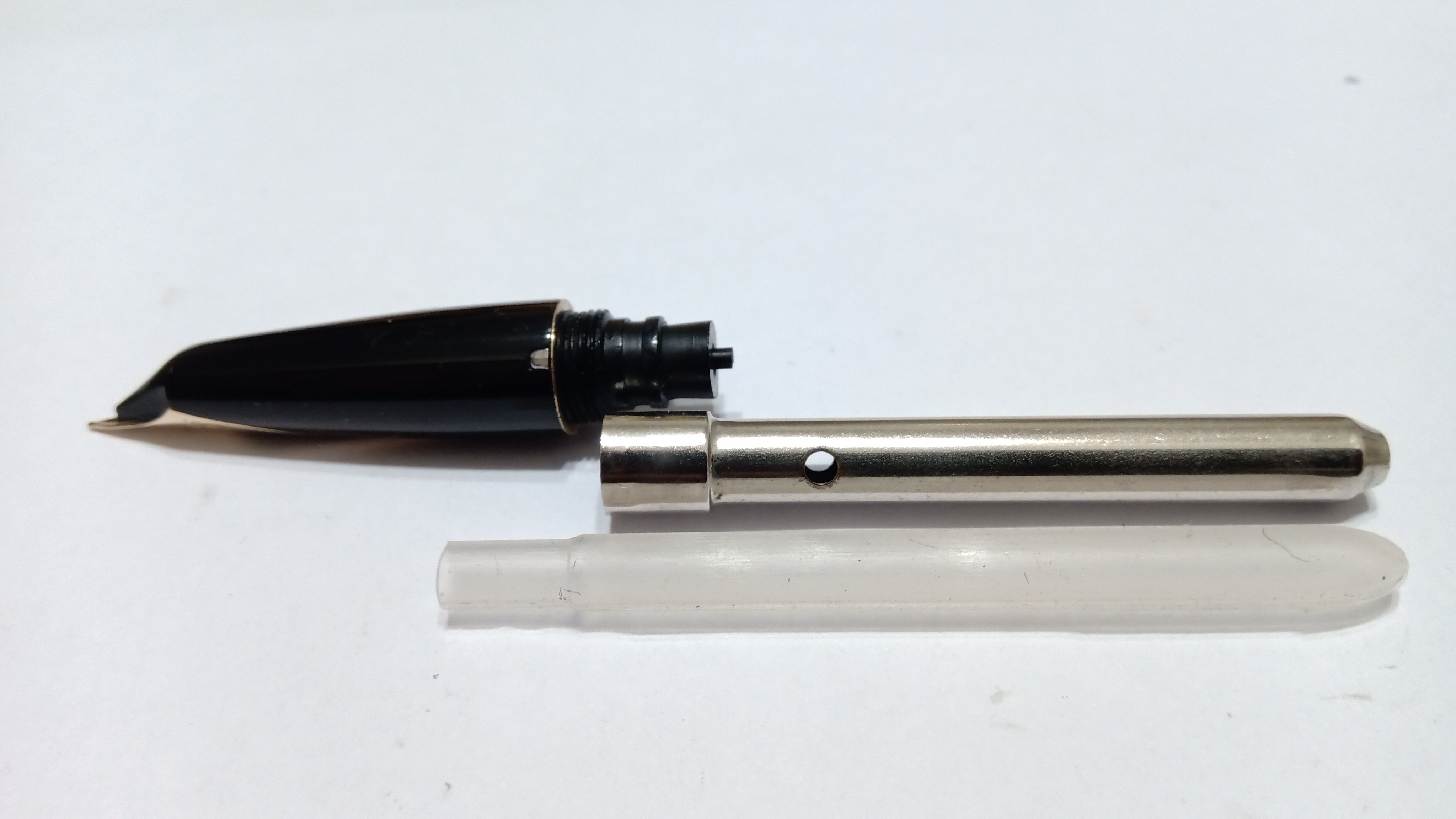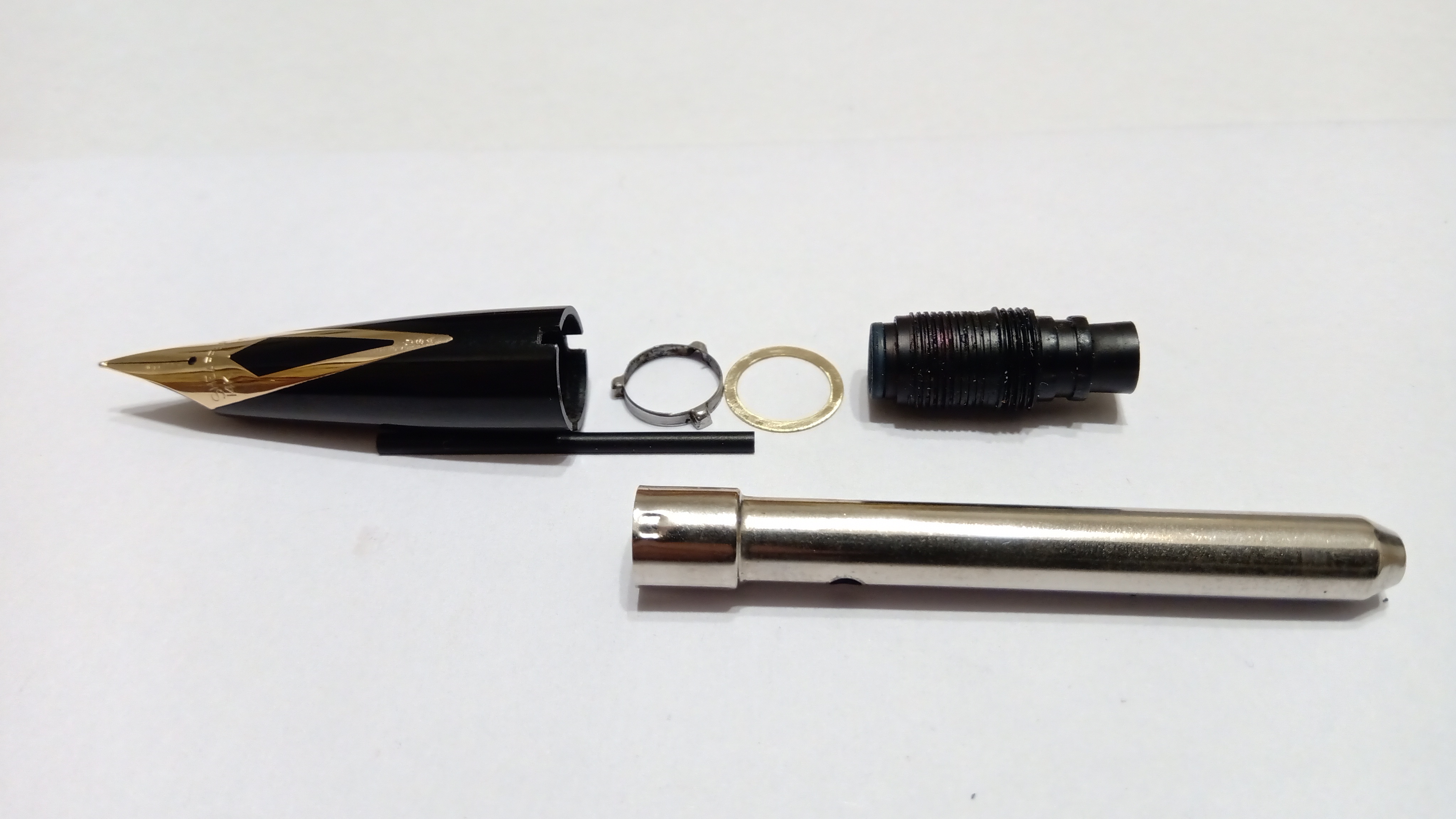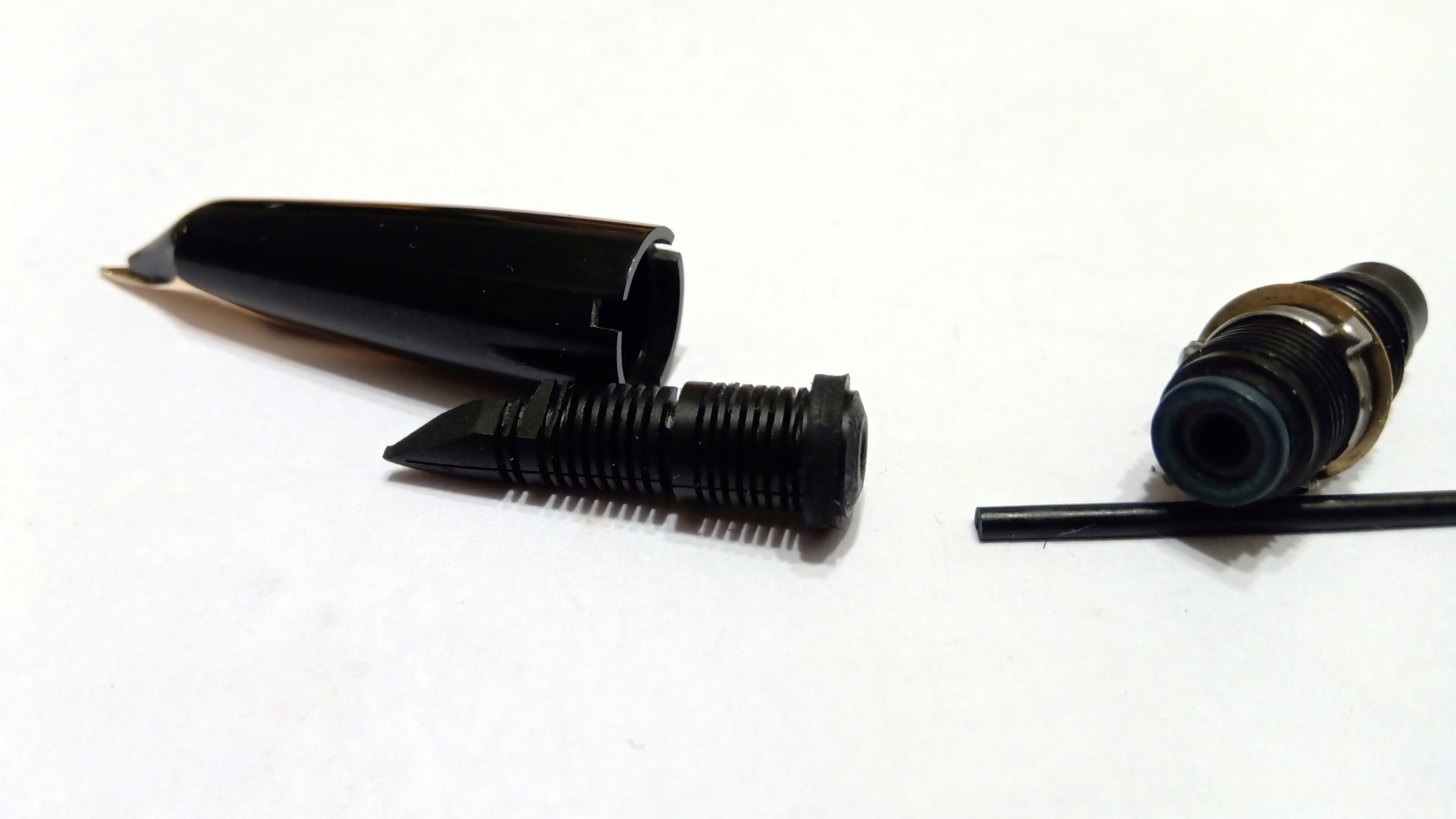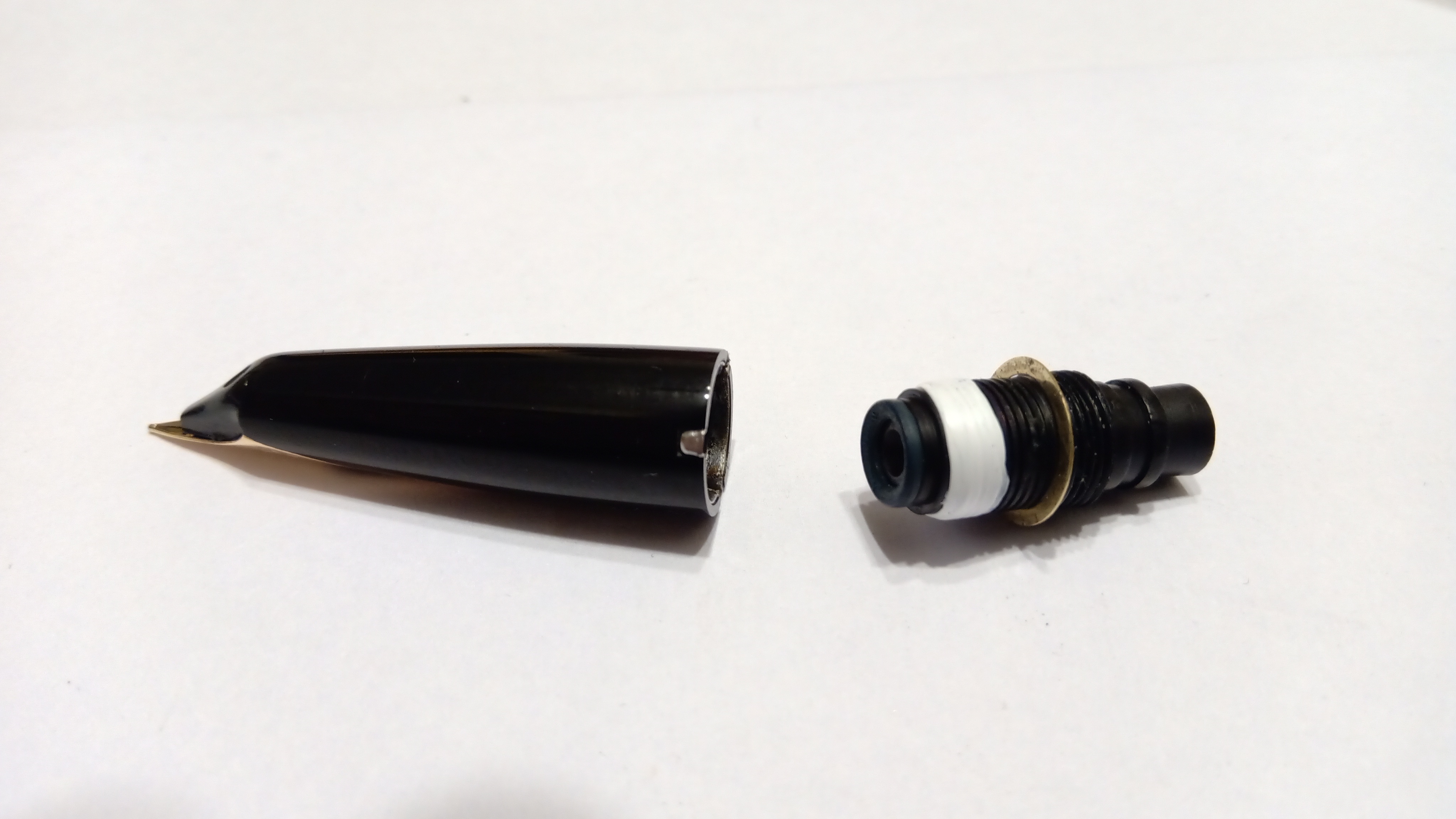 Pueden verse las arandelas de asiento en el capuchón, el grip con su plumín inlaid, y la entrada al grip con un pequeño canal de ebonita que conducirá la tinta desde el saco al alimentador.