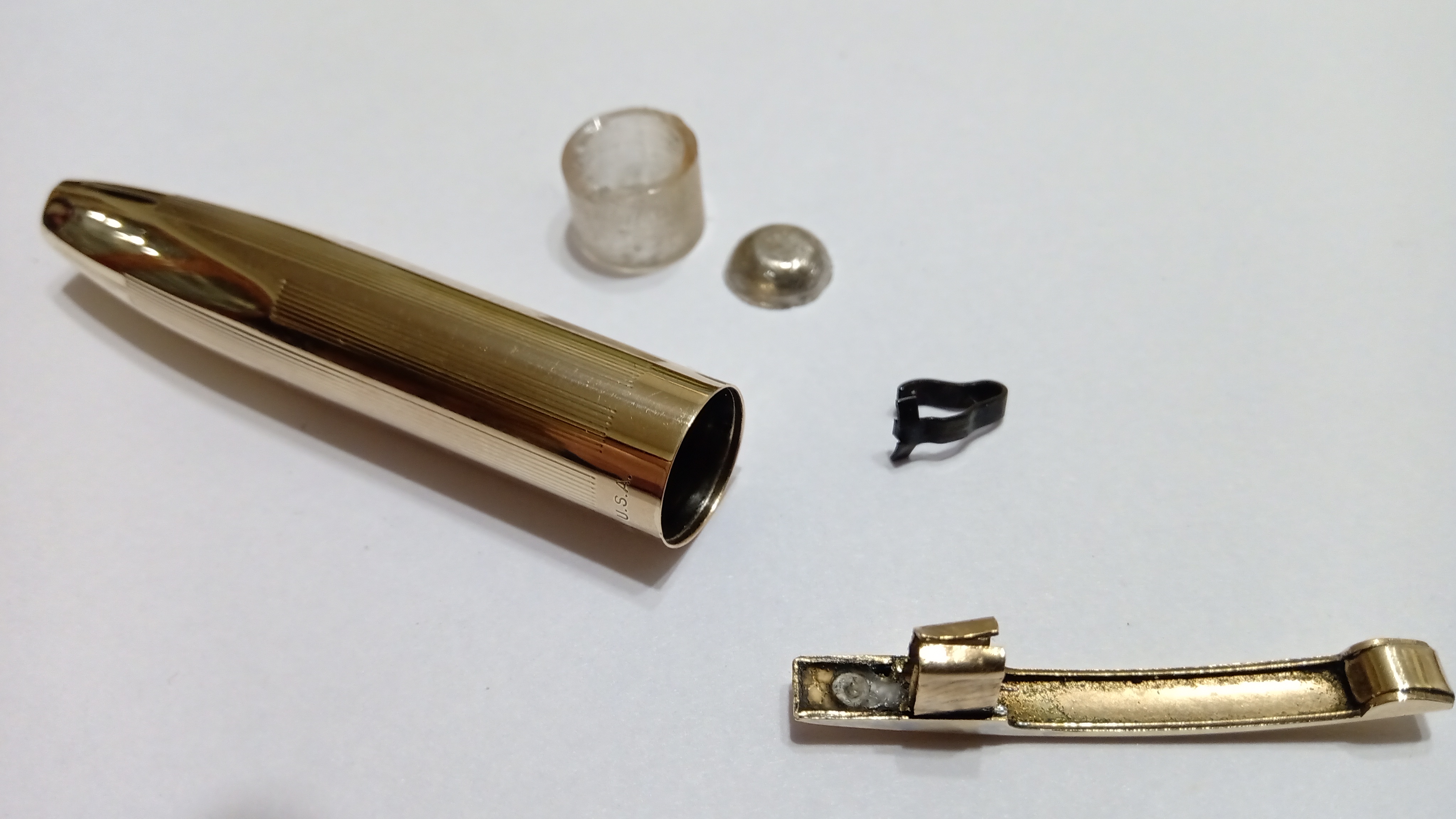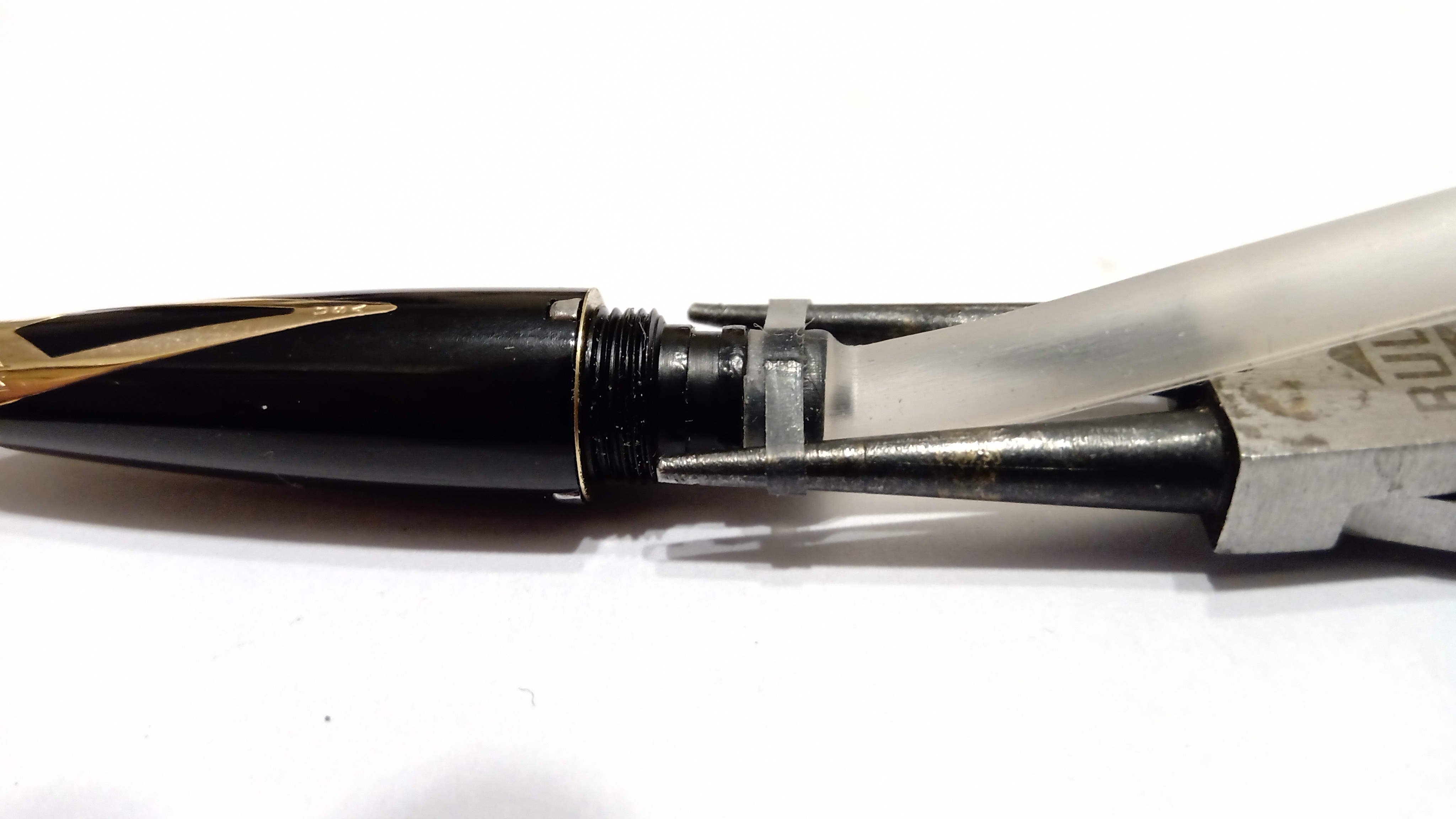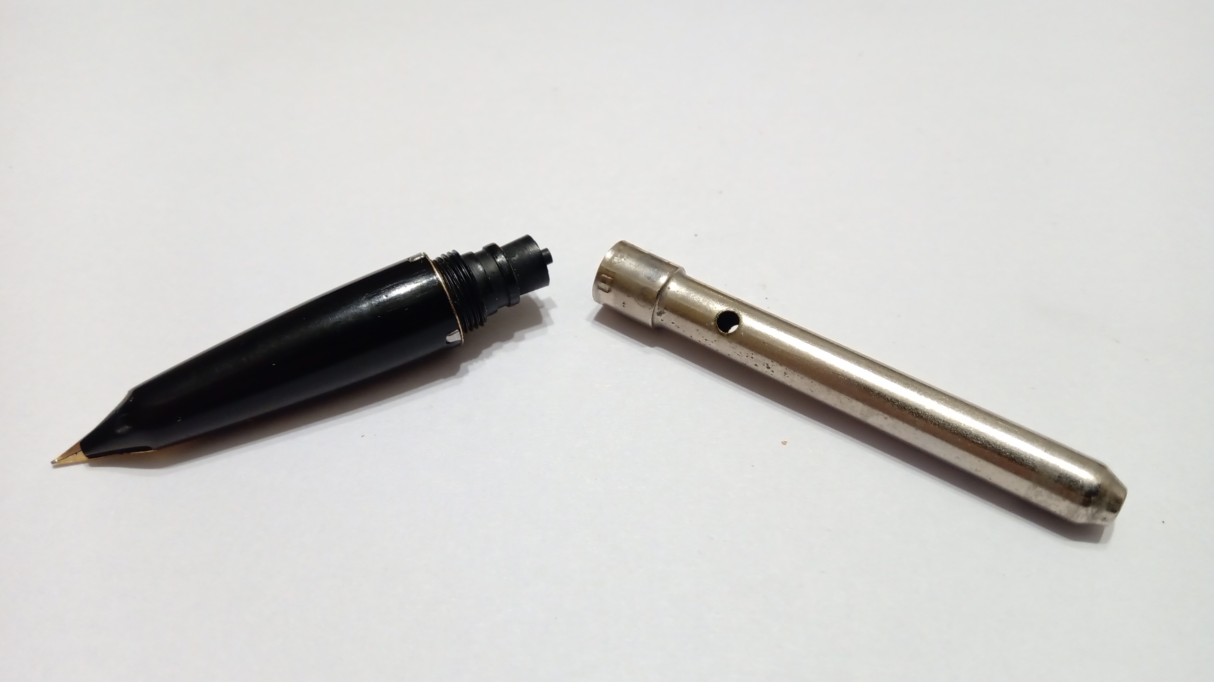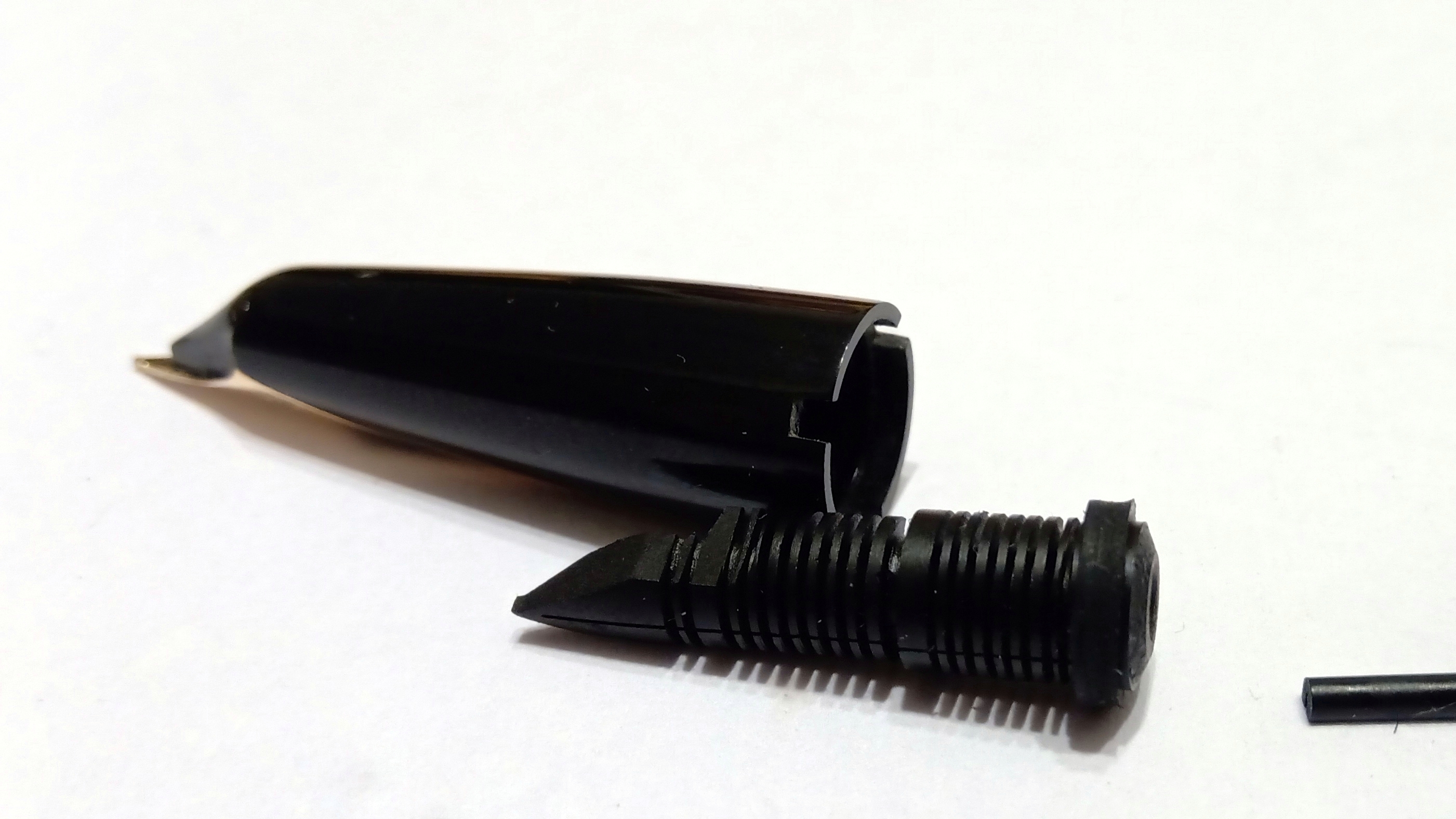 Pueden verse las arandelas de asiento en el capuchón, el grip con su plumín inlaid, y la entrada al grip con un pequeño canal de ebonita que conducirá la tinta desde el saco al alimentador.